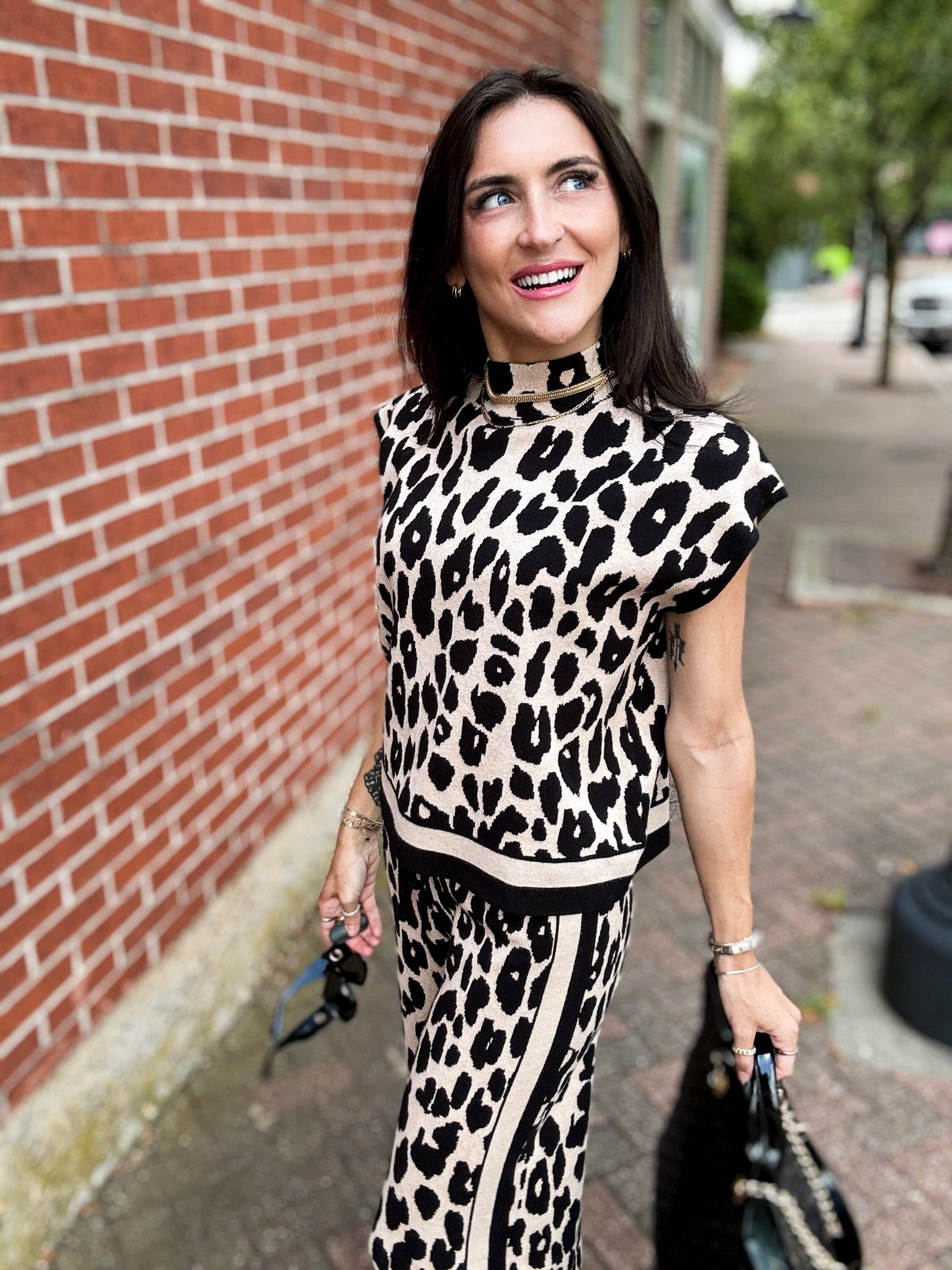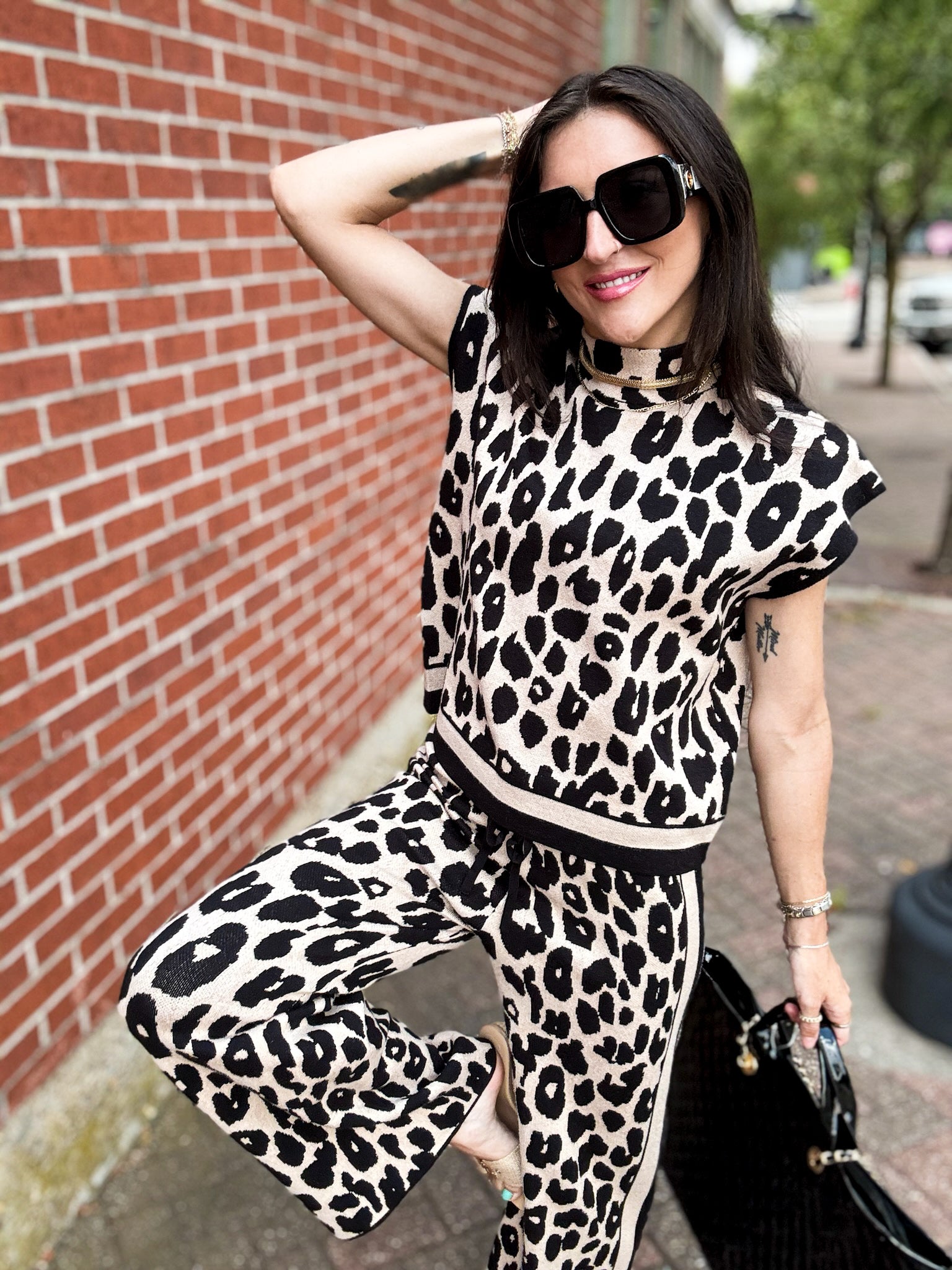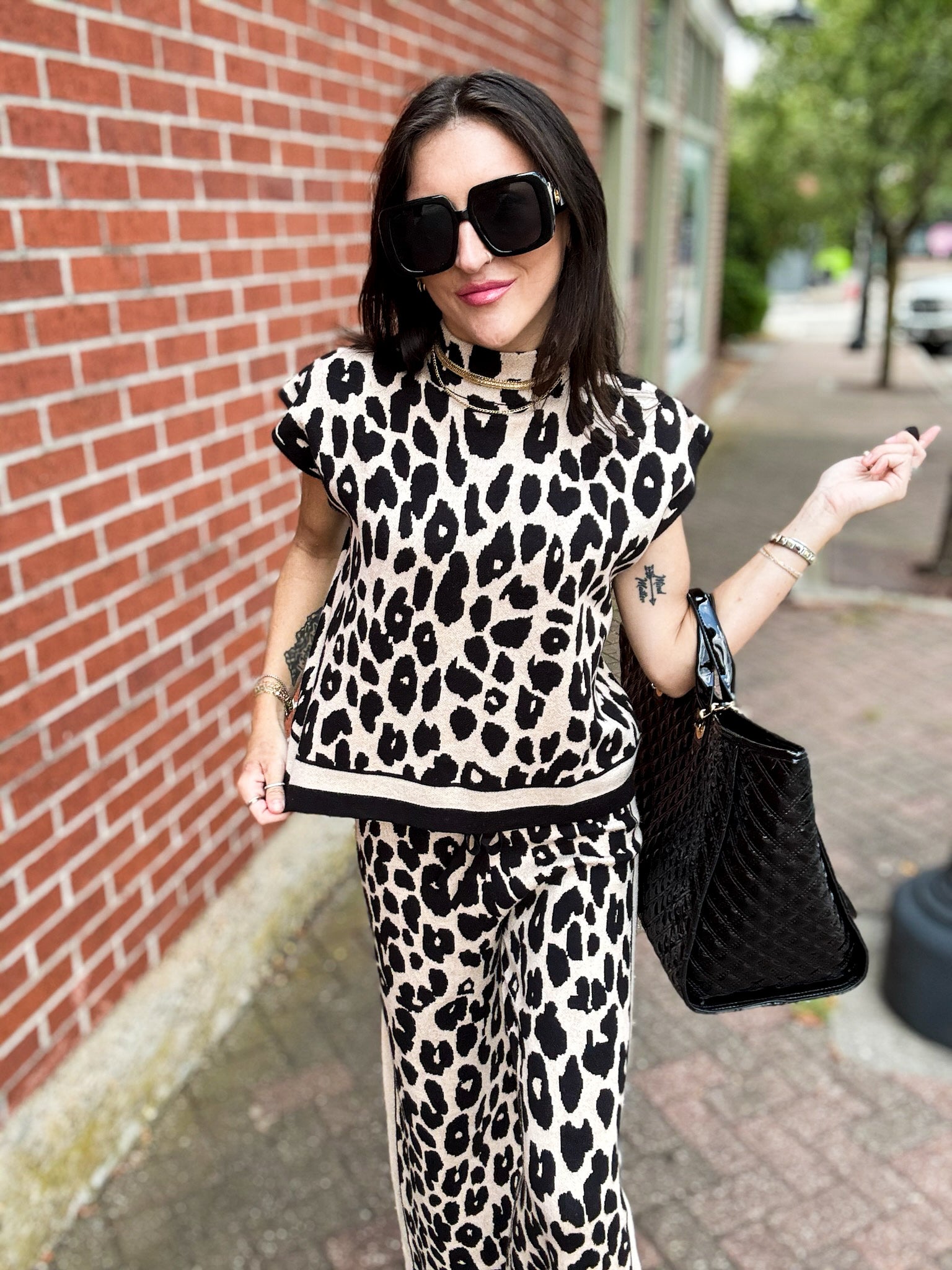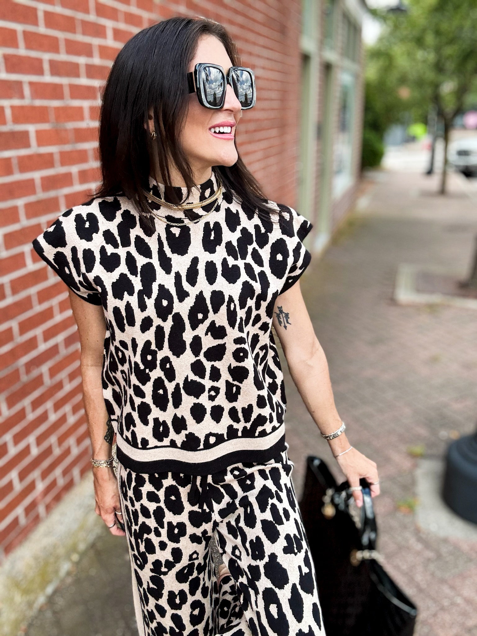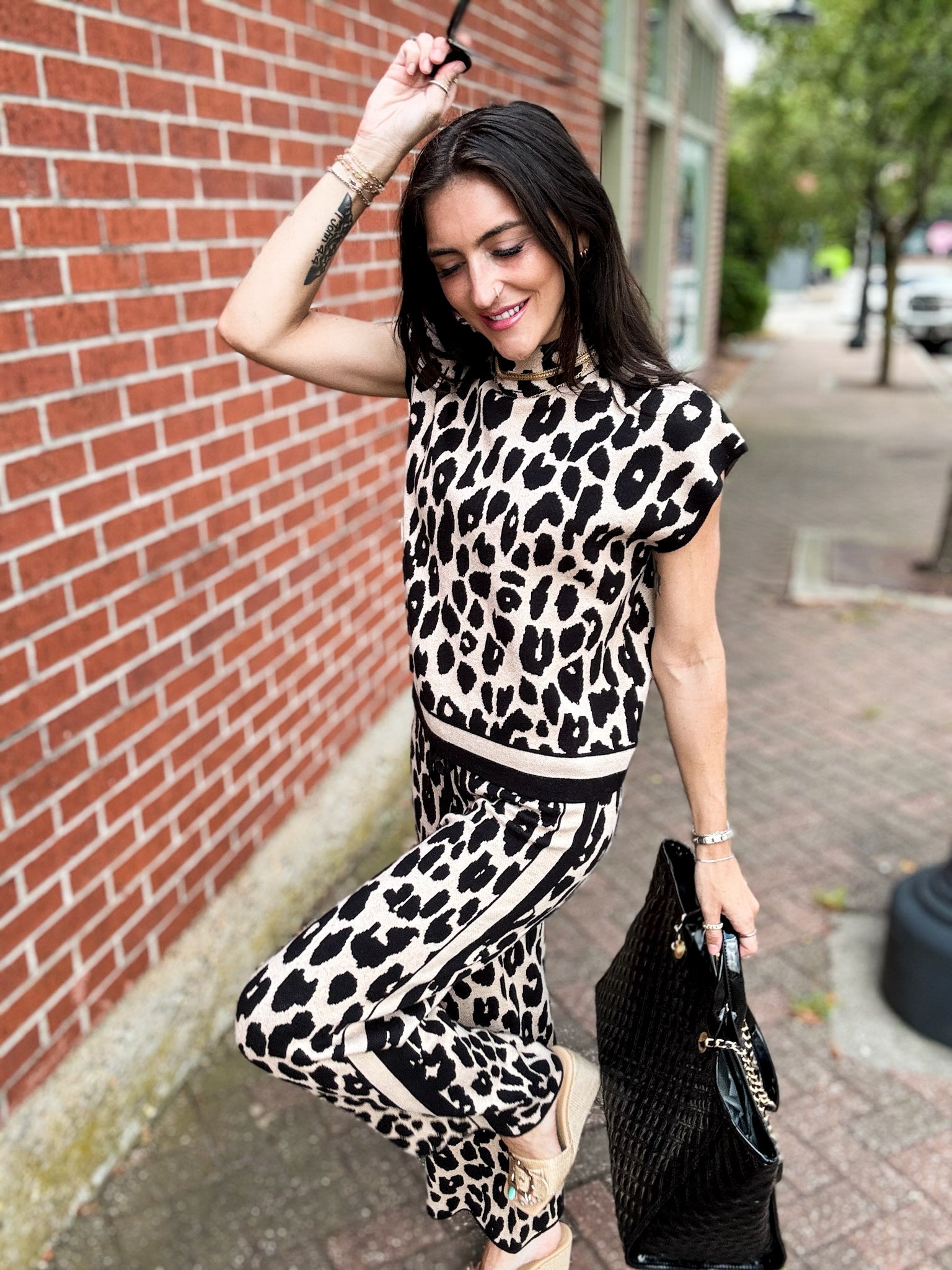Get cozy in the playful Adeline Leopard Knit Set, featuring a chic animal print mock neck sweater and matching high-waist, ankle-length pull-on pants. Perfectly paired for effortless style and comfort, this set brings a fun, wild twist to your knitwear collection.
