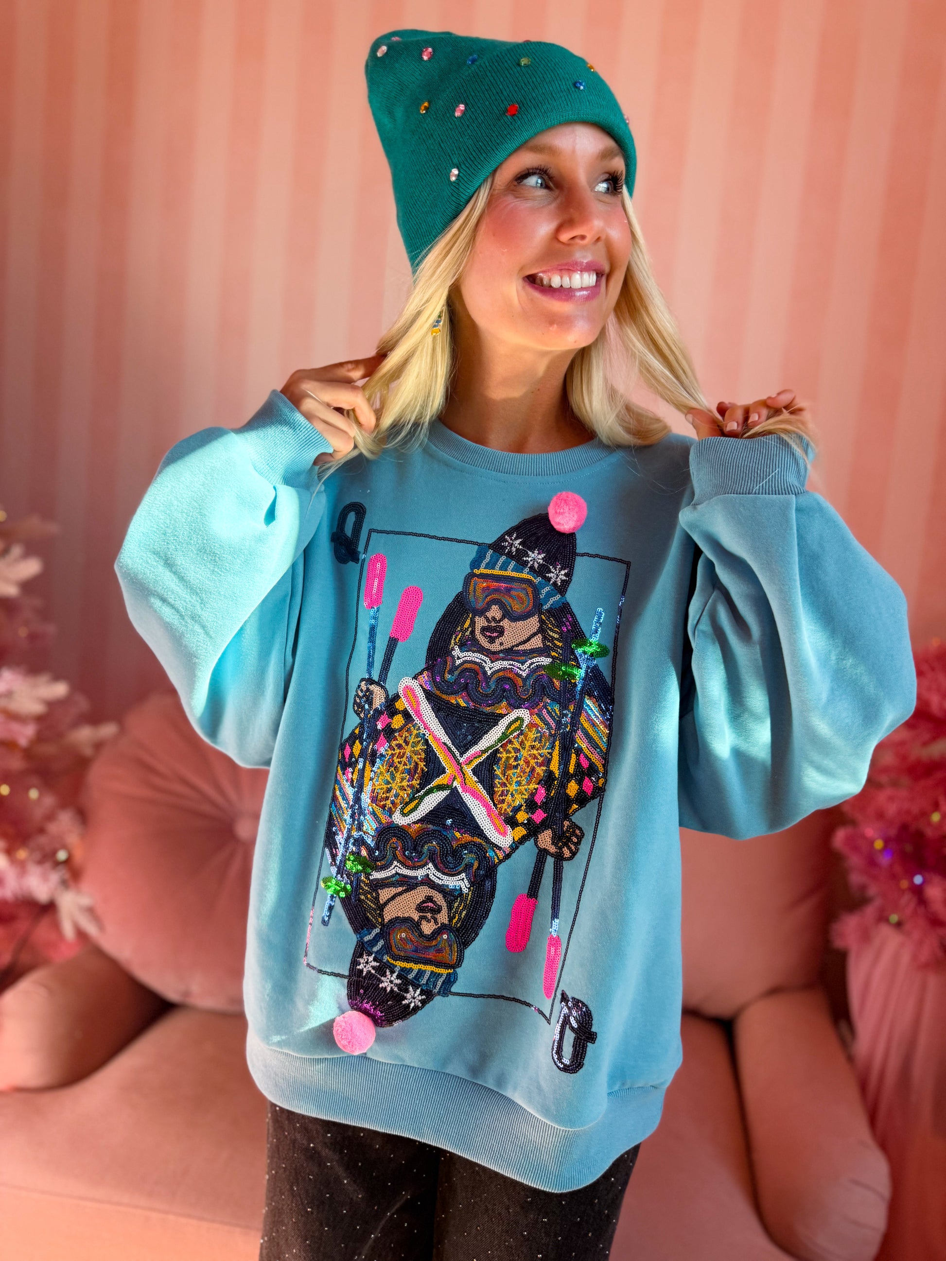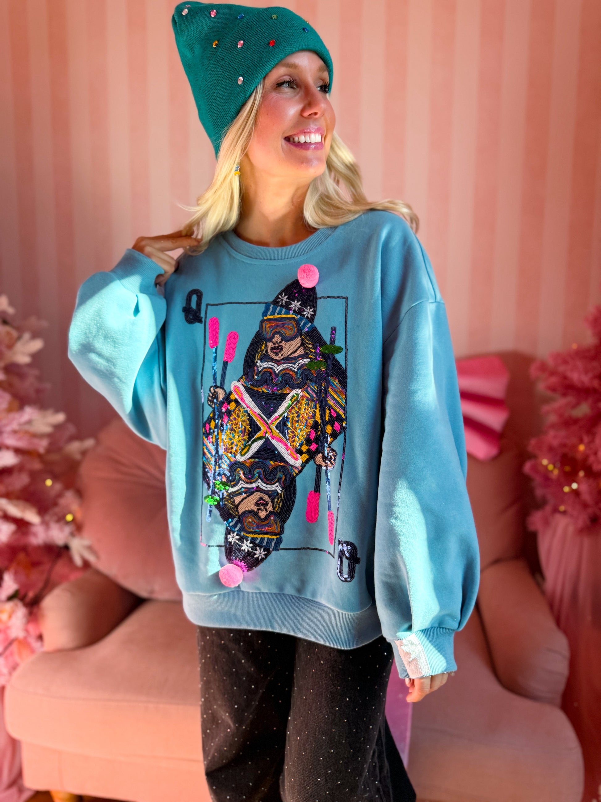 Hit the slopes (or après-ski brunch) in full sparkle mode with this bold and playful Queen of Sparkles sweatshirt. Featuring a dazzling beaded ski queen design complete with pink pom details, this cozy blue sweatshirt brings major personality to your winter wardrobe. The relaxed fit and soft fleece lining make it the perfect statement piece for chilly days or mountain getaways.