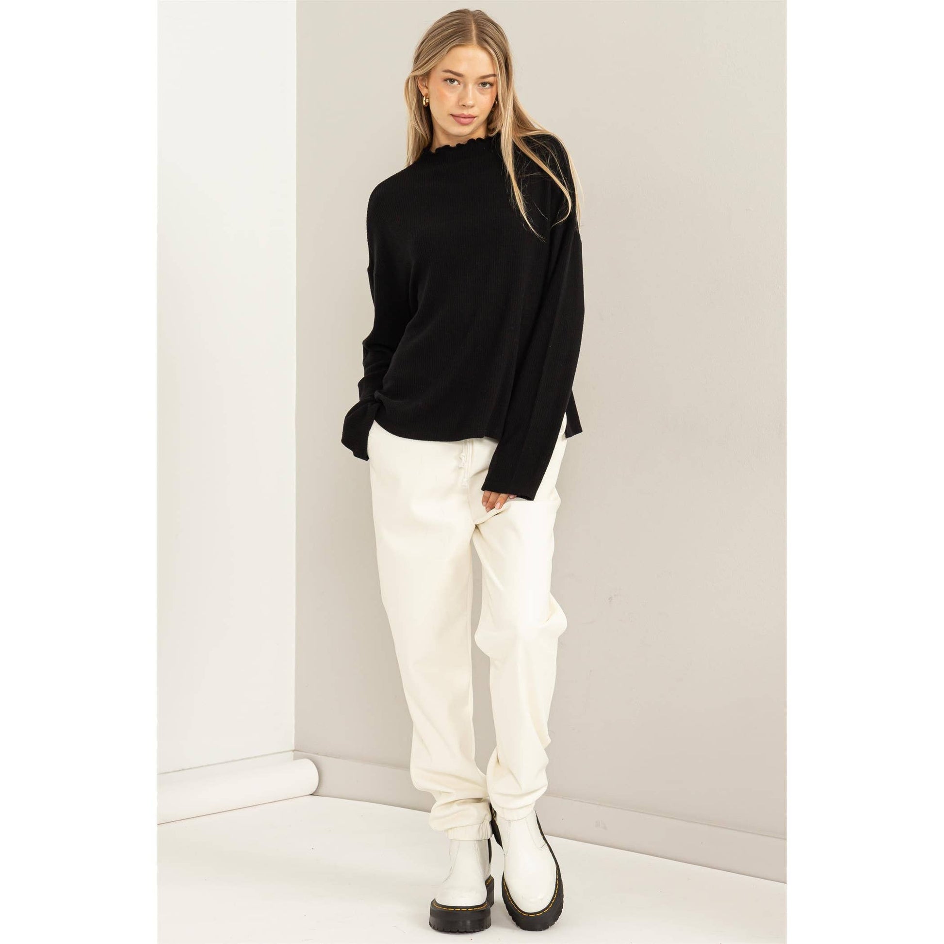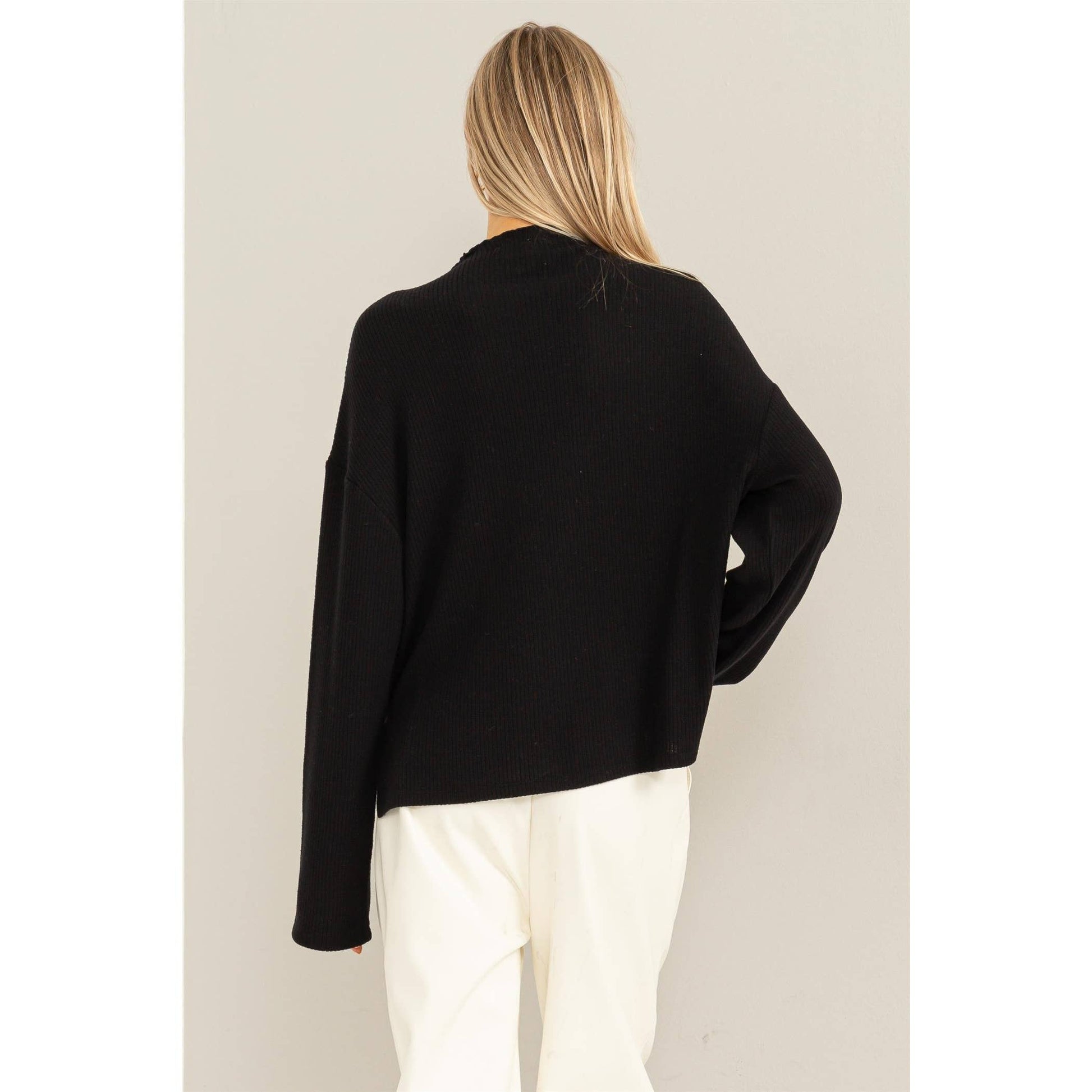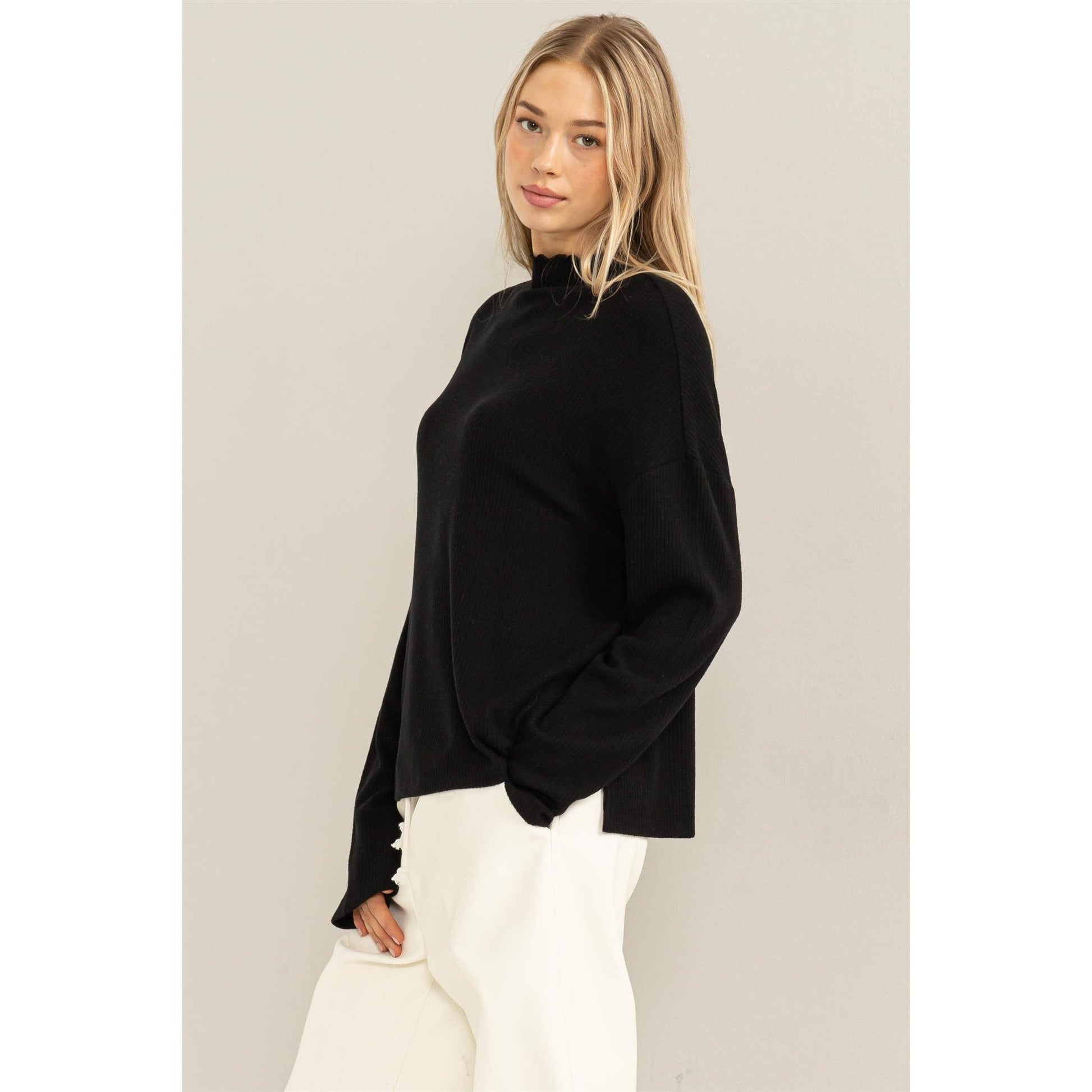 Make countless memories in this cozy little top! It is crafted from soft ribbed fabric into an oversized silhouette to lend you a chic yet laid-back look. High neck, long sleeves and twin side slits at hem complete the look.