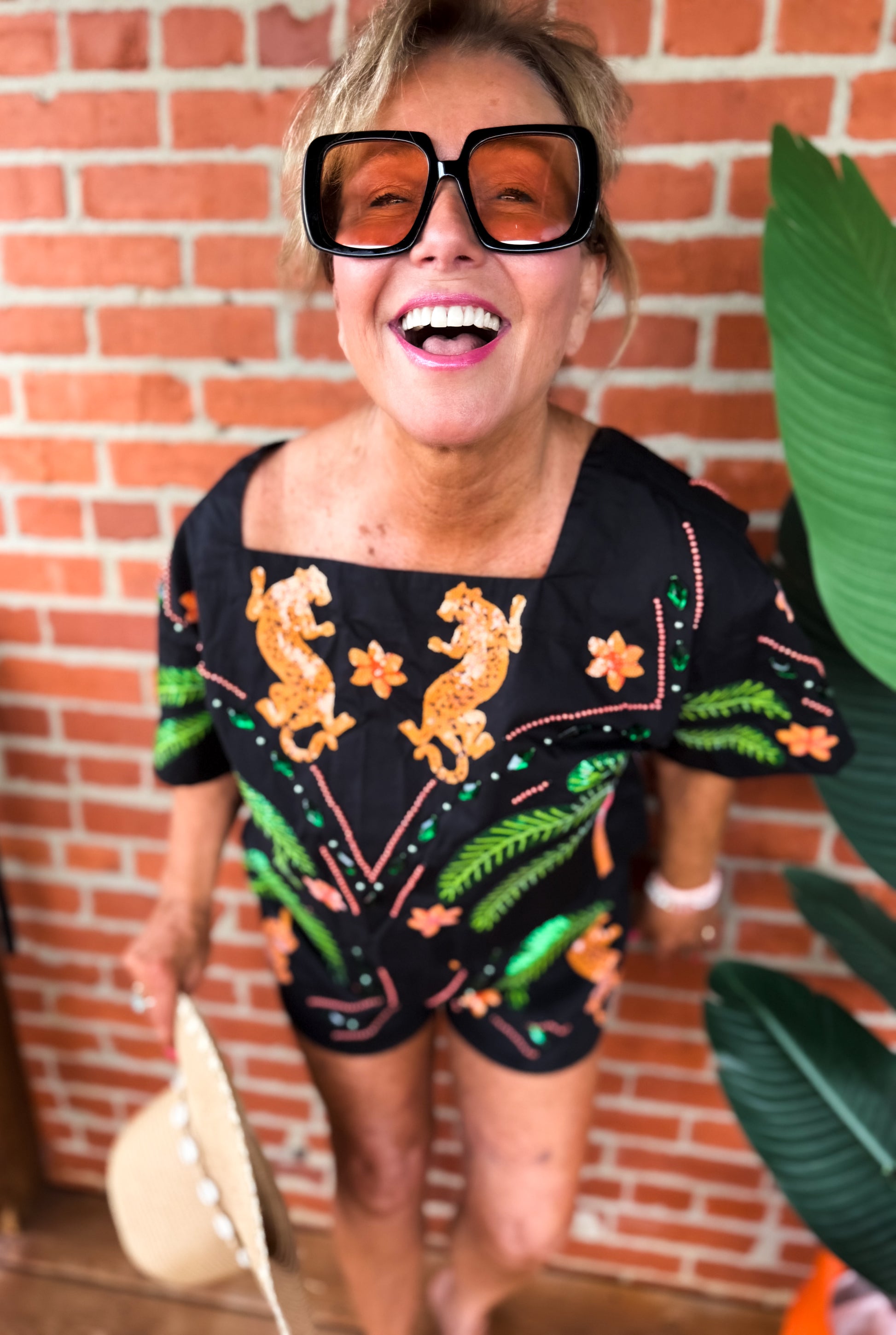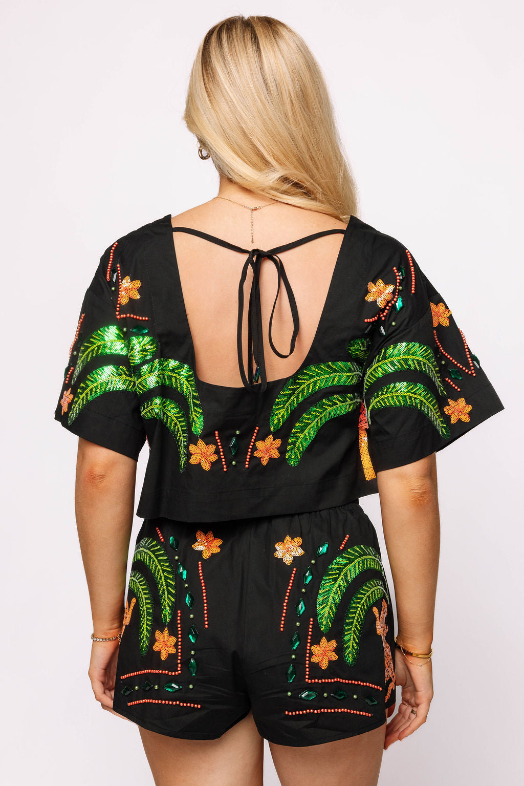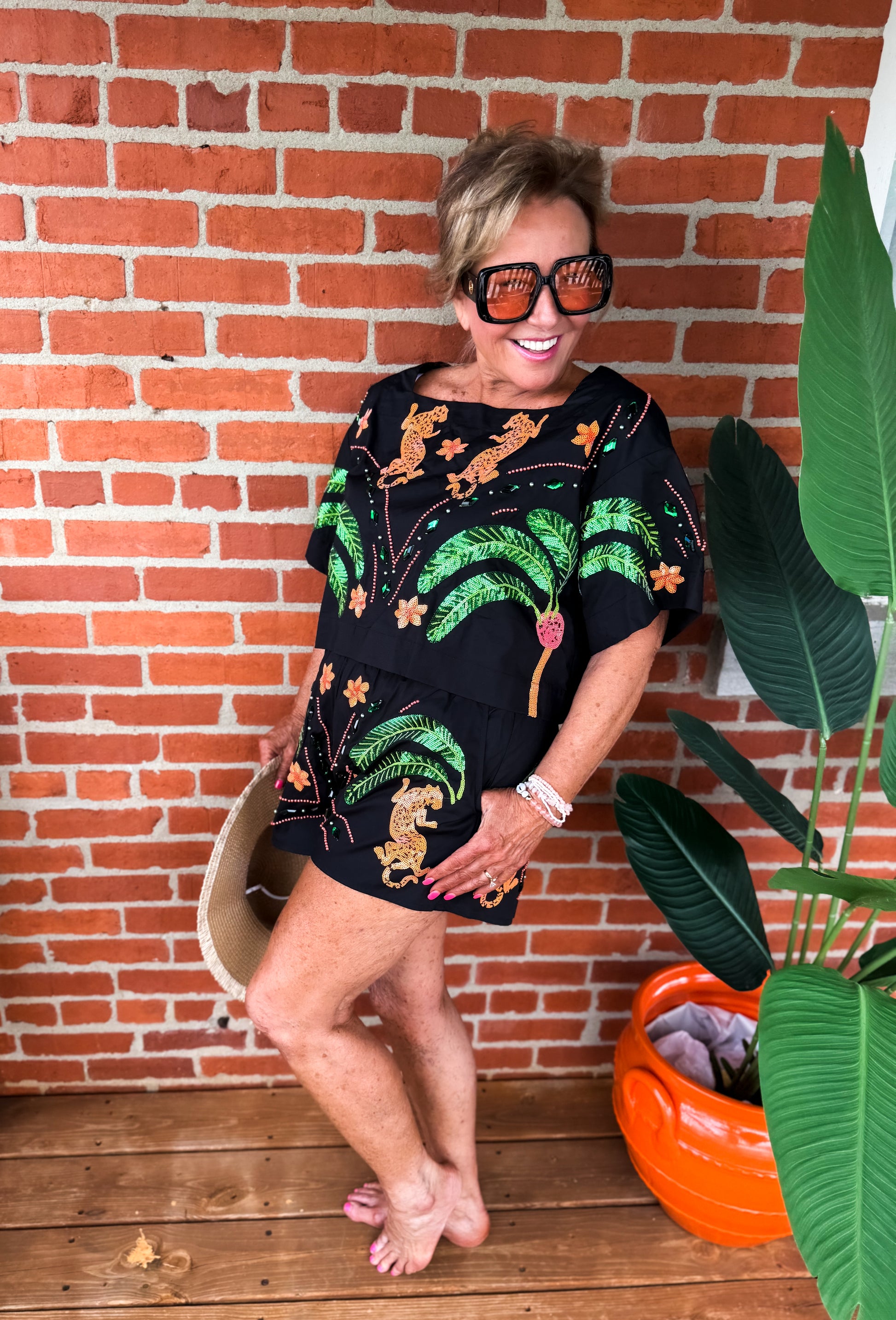 Bring the bold with this dazzling cotton crop top from Queen of Sparkles. Featuring a jungle-inspired motif of sequined palm leaves, vibrant florals, and fierce orange cheetahs, this top turns up the tropical glam. With gem embellishments, a flattering boxy fit, and an open back with tie detail, it's perfect for vacays, weekend brunches, or anywhere you want to steal the spotlight. Pair it with the matching shorts for a head-turning set!