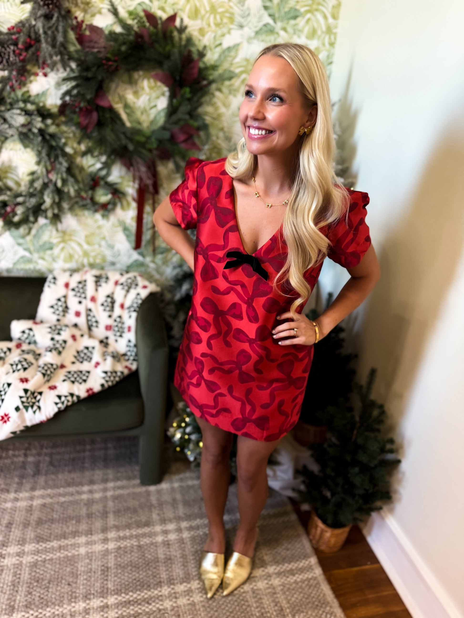 Step into the spotlight this holiday season with the Jeanette Dress! Featuring short sleeves, a festive bow print, and a flattering mini length, it’s the perfect mix of classy and fun. Just slip on some heels, and you’re all set to steal the show!