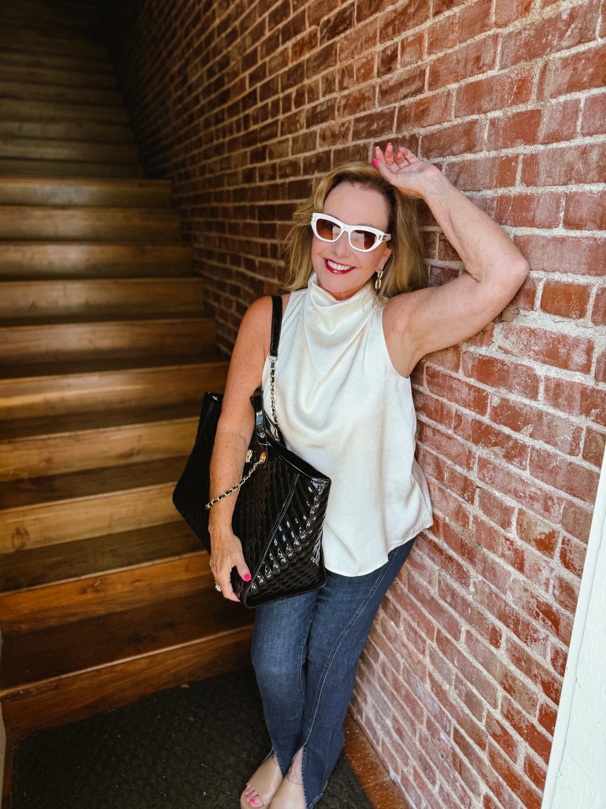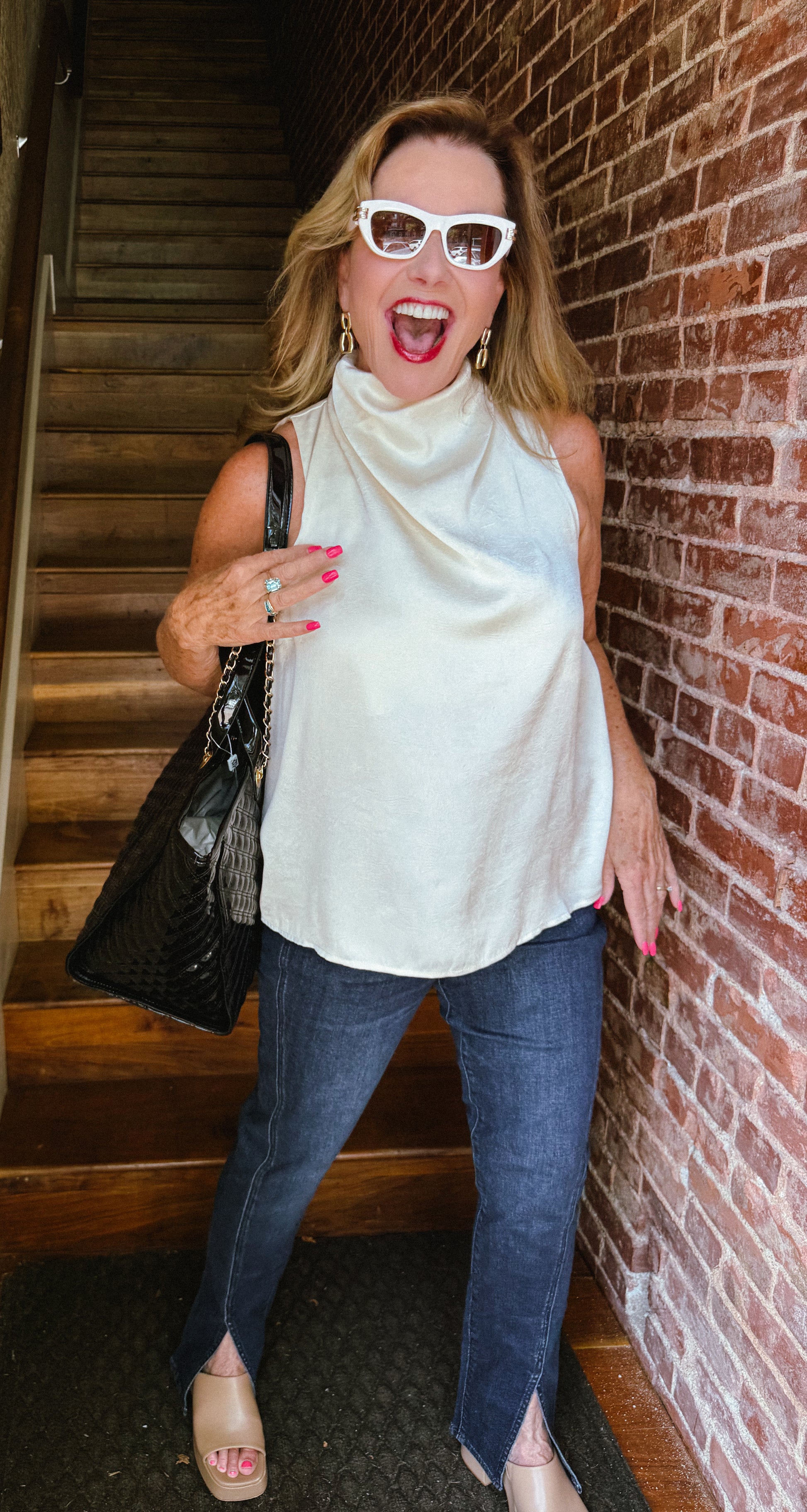 Elevate your style with the Champagne Sorrento Halter, a satin, drapey top designed to turn heads. Its silky fabric flows effortlessly, while the playful halter neck adds a flirty touch. Perfect for evenings out or dressing up your day, this top brings a splash of chic comfort to any outfit.