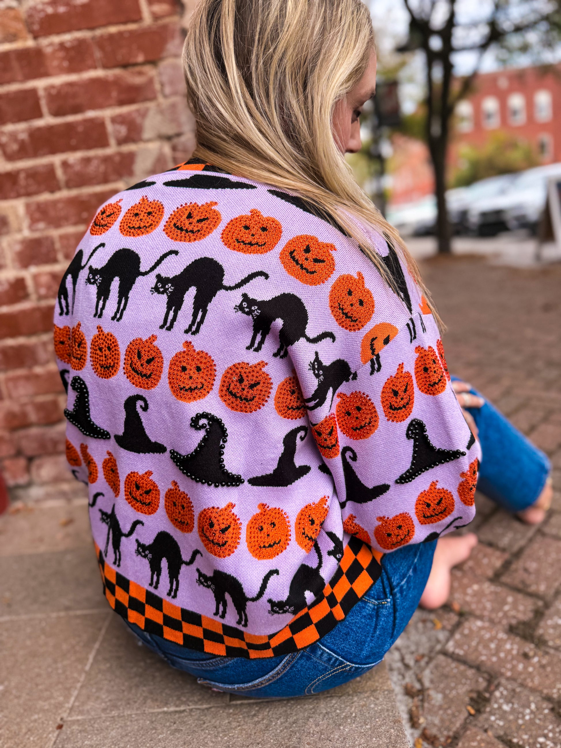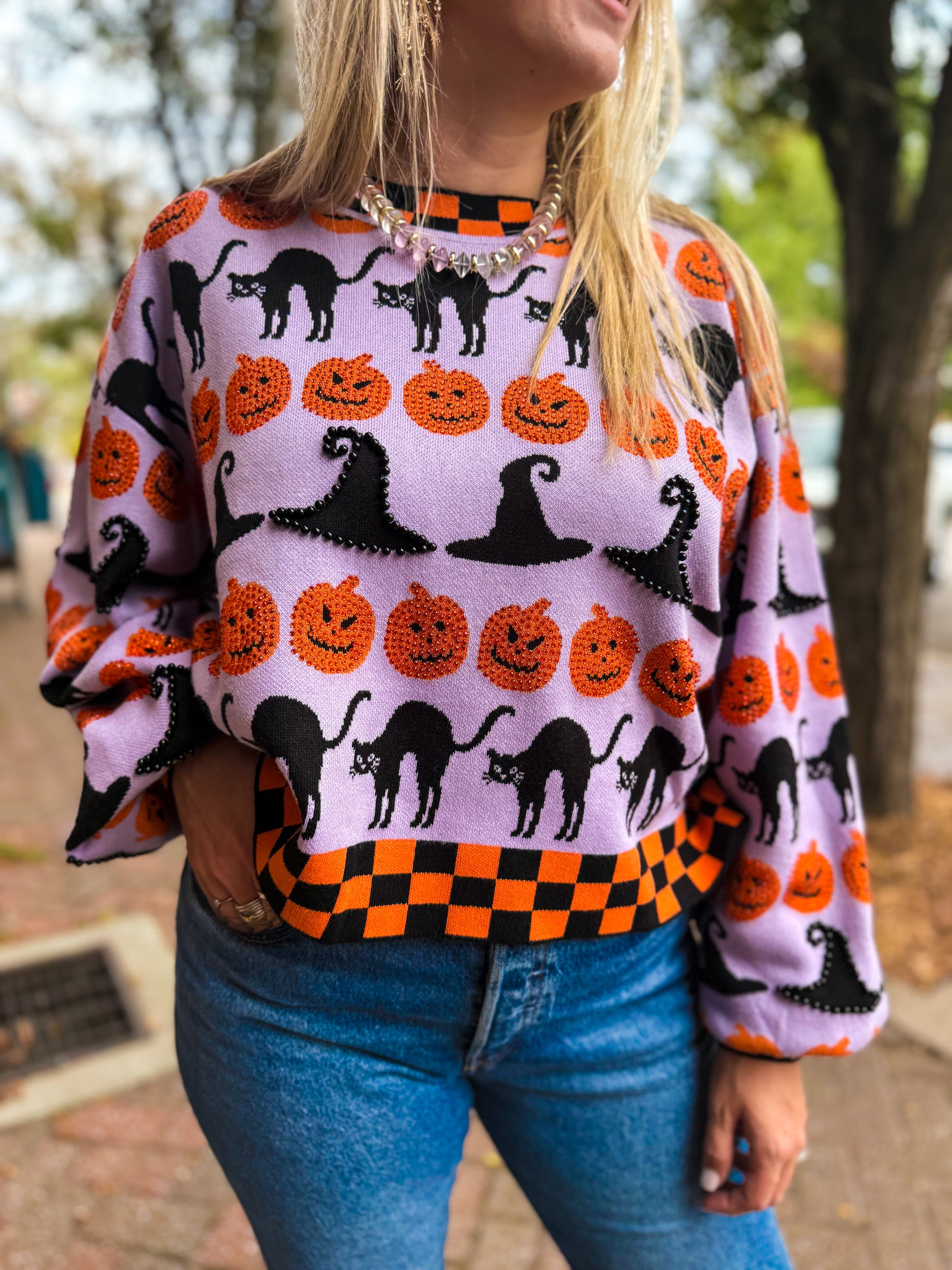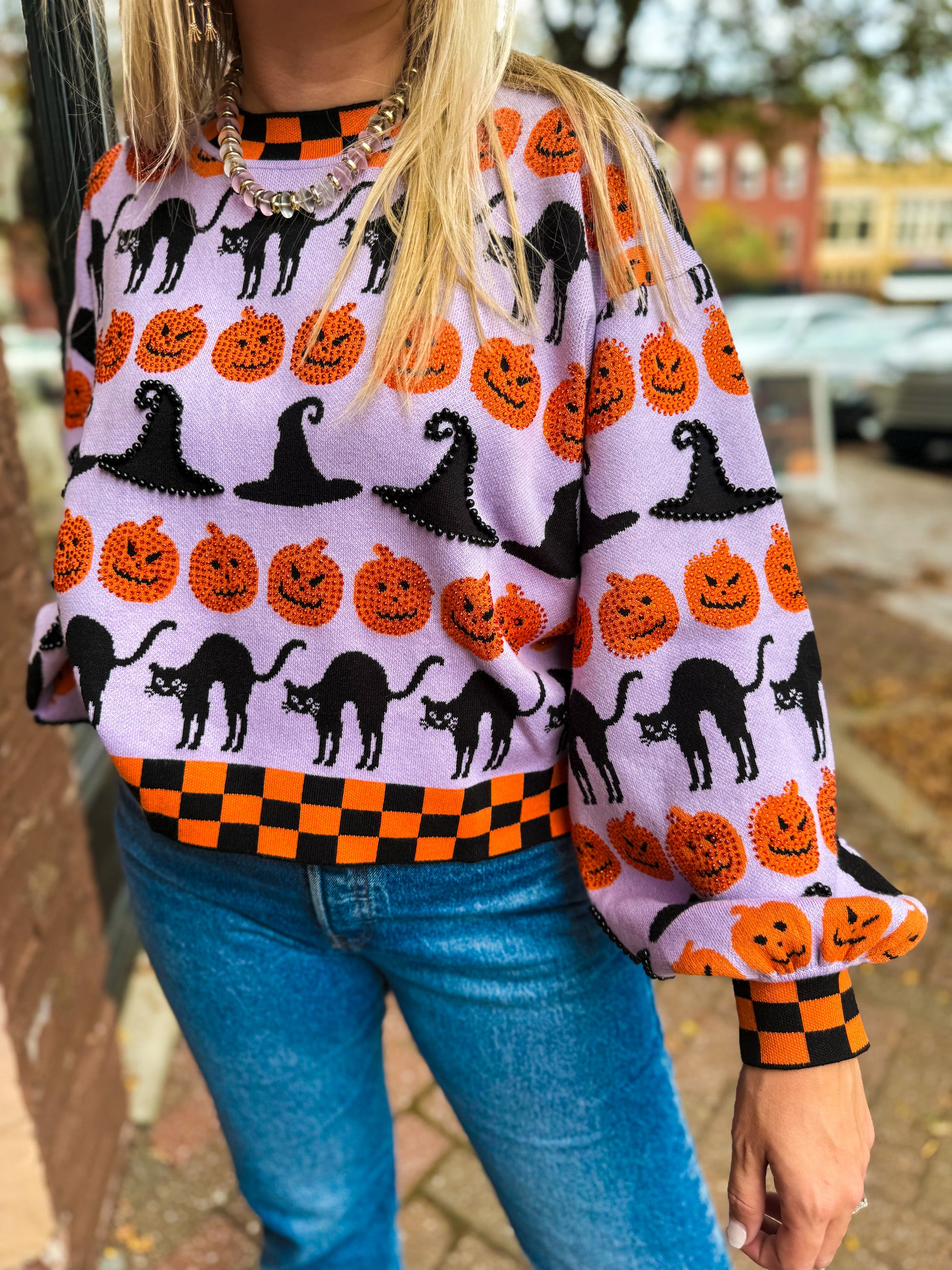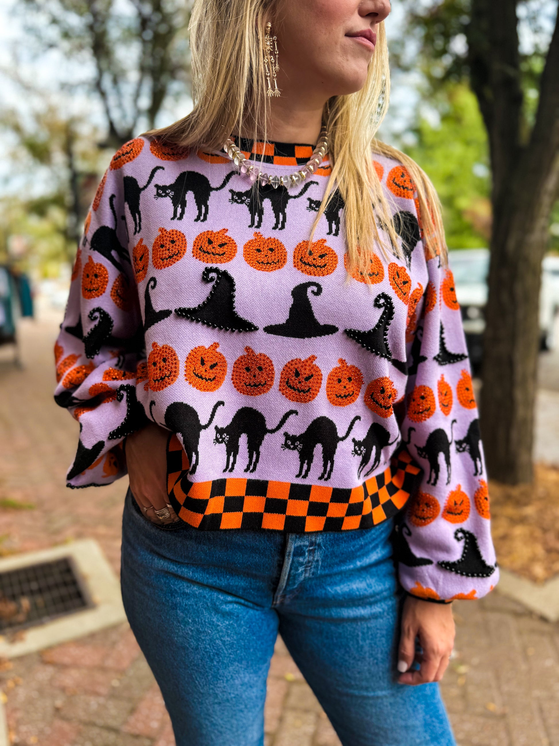 Celebrate Halloween in style with the Queen of Sparkles Checker Halloween Icon Sweater. Featuring a fun lavender, black, and orange checker pattern, this cozy crewneck sparkles with sequins and beads that create festive Halloween icons. Perfect for adding a playful and shimmering touch to your seasonal wardrobe, this sweater combines comfort and holiday cheer in one eye-catching piece.