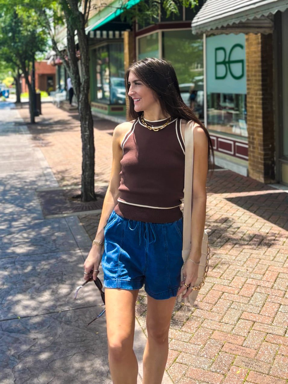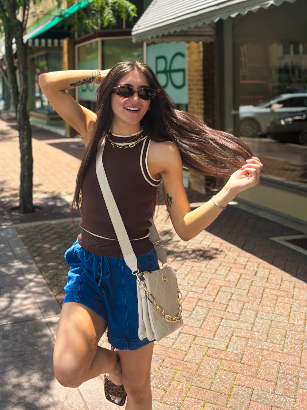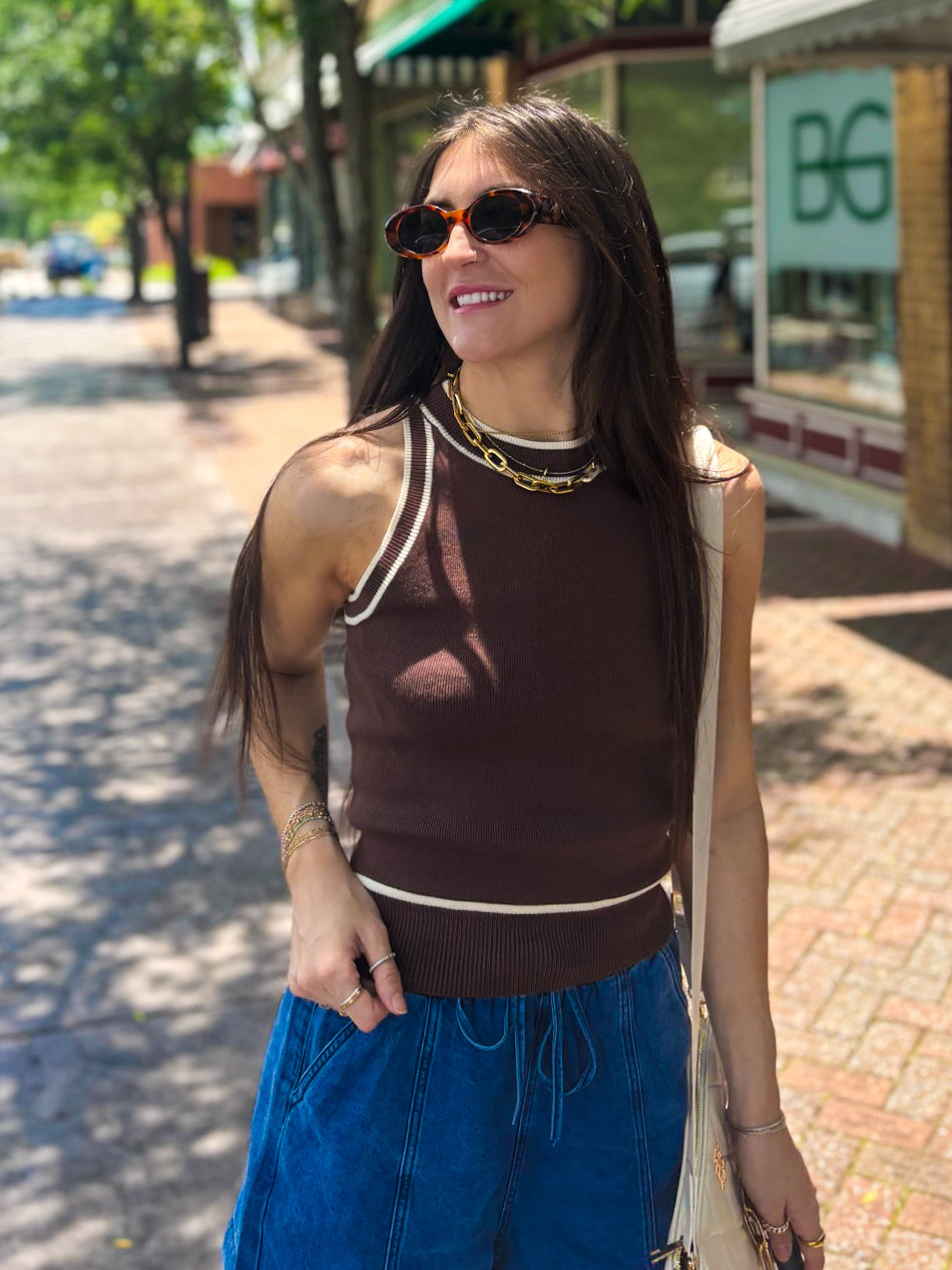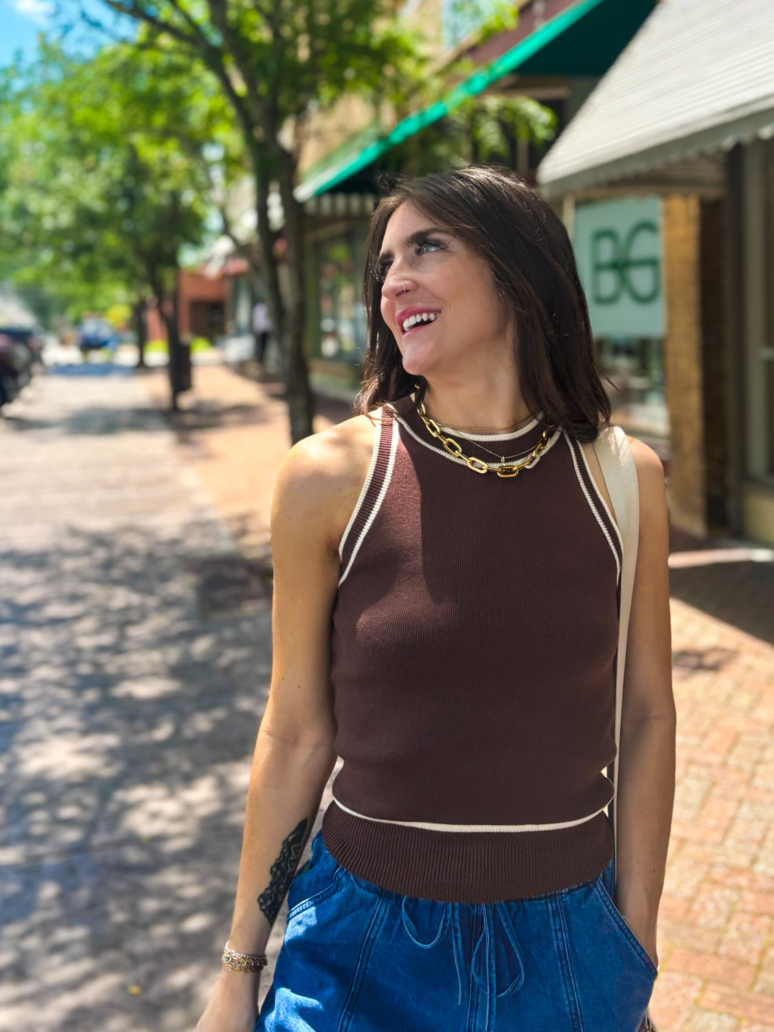 The Chocolate Knit Halter is a playful twist on classic style with its sleeveless design and chic halter neckline. Crafted from a soft sweater knit blend of 70% viscose and 30% polyester, it offers cozy comfort with a touch of stretch. The bold contrast stripe adds a fun, eye-catching detail perfect for mixing and matching in your wardrobe. Whether dressed up or down, this top brings effortless charm to any look.