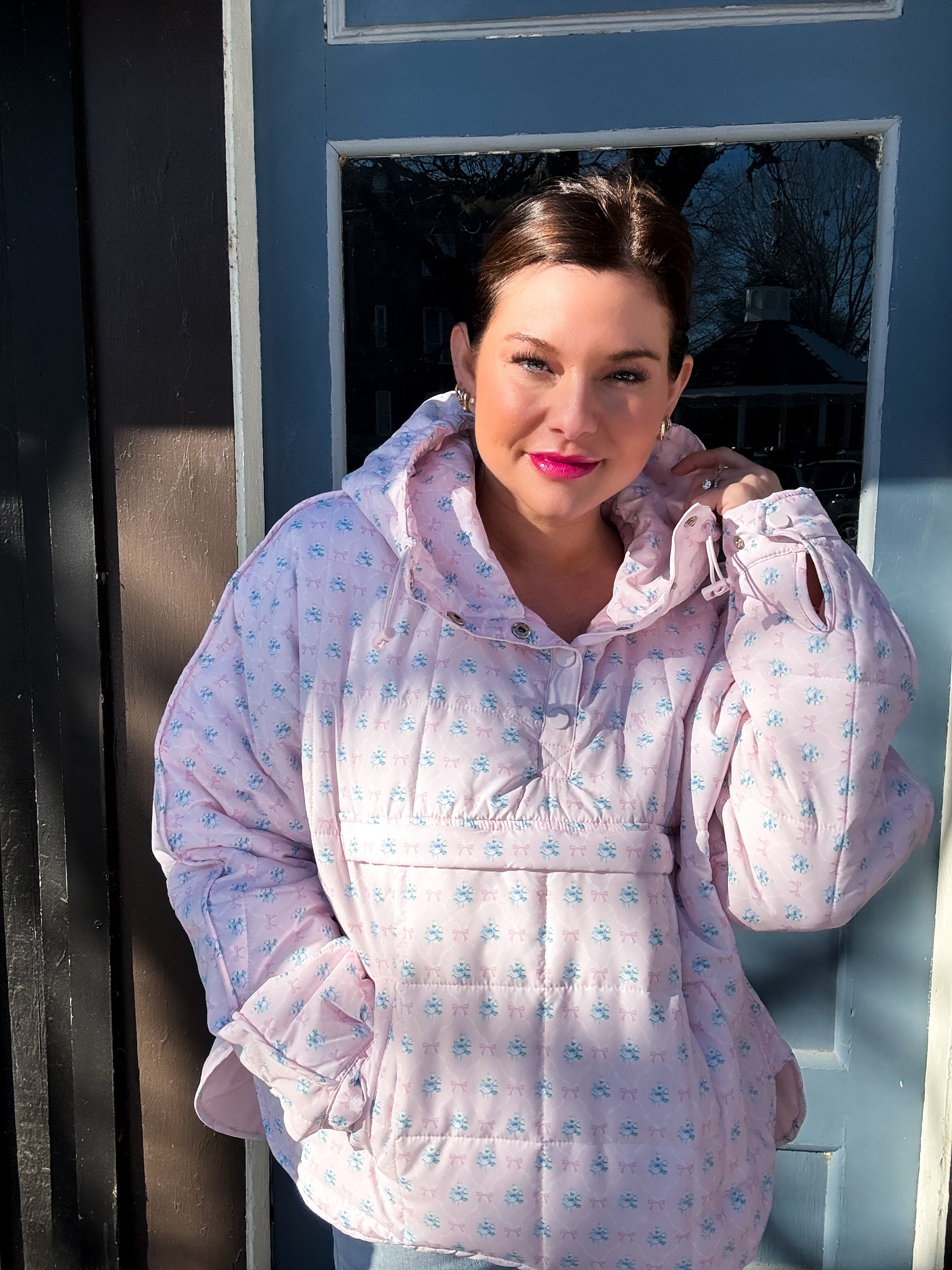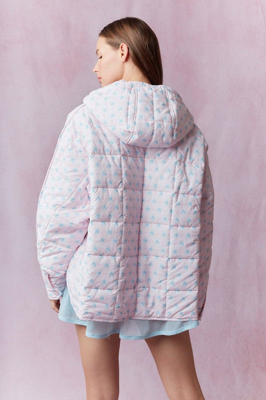 Get ready to slay in style with the Dora Printed Pullover Puffer Jacket. This jacket features a one-of-a-kind flower and bow print, a cozy hood, and convenient snaps and pockets. Stay fashion-forward and warm this season, all while turning heads.
