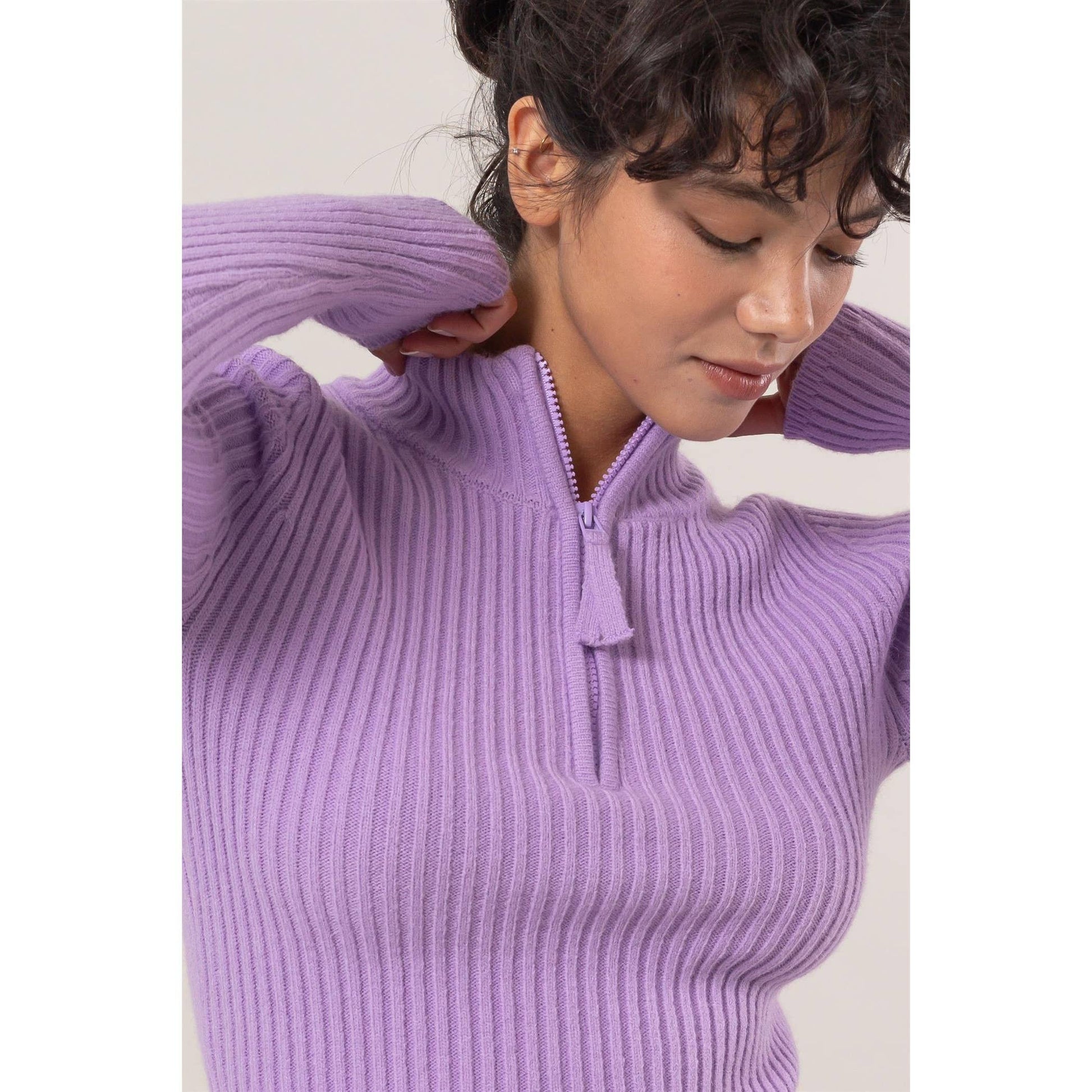 Create An Adorable Ootd With This Ribbed Top. It Showcases A Chic High Neck With A Half-Zip, Long Sleeves And A Flattering Fit For A Timeless Look. The Ribbed Finish Offers A Refined Touch. Style With A Flare Pants Or Pencil Skirt.