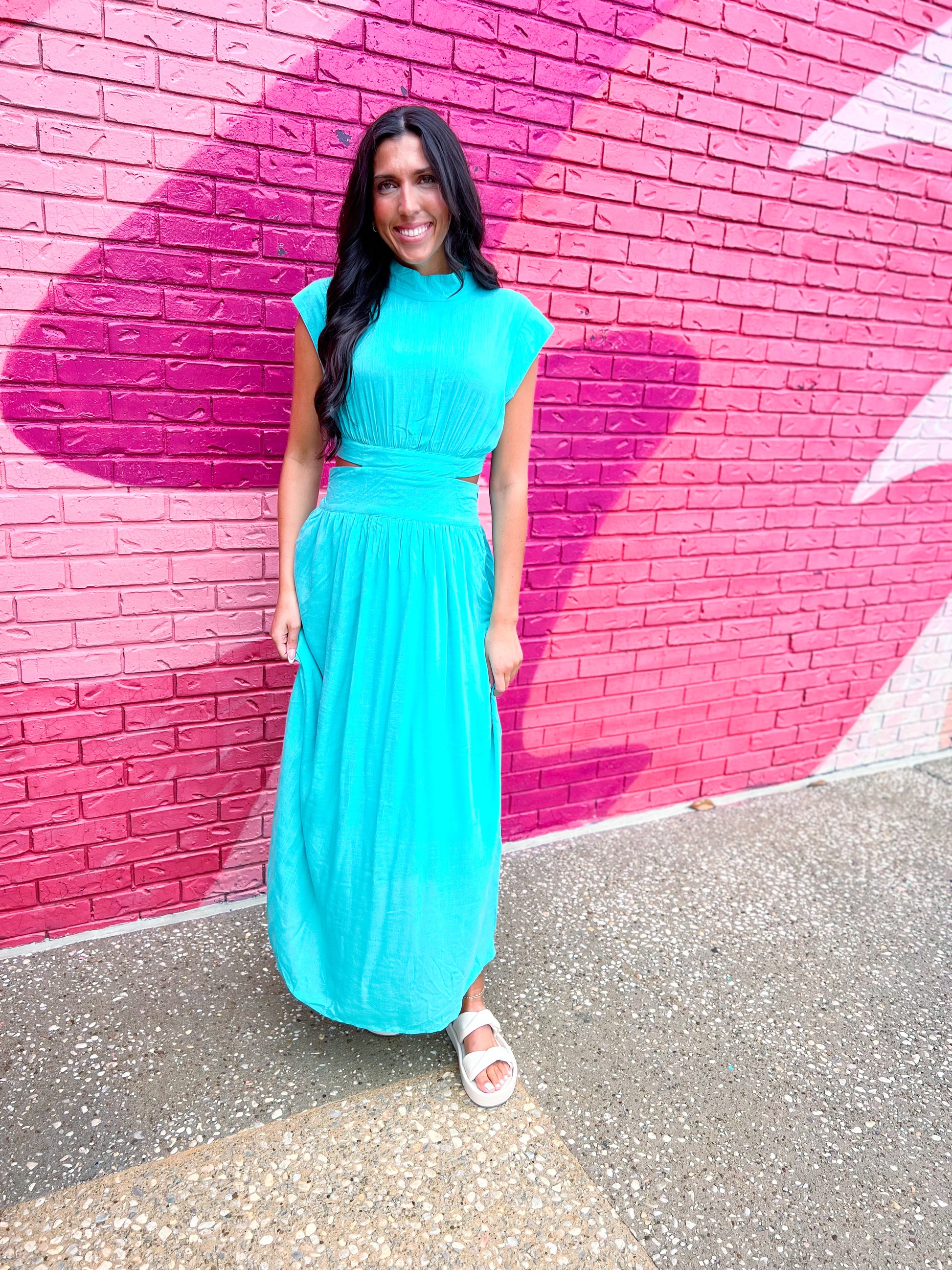 Realza tu estilo con el vestido Elena, que presenta hombros descubiertos, cuello alto y espalda abierta. Este elegante vestido largo está confeccionado en una lujosa popelina turquesa para lograr un look único y llamativo. Haz una declaración y llama la atención en cualquier evento con este vestido único.