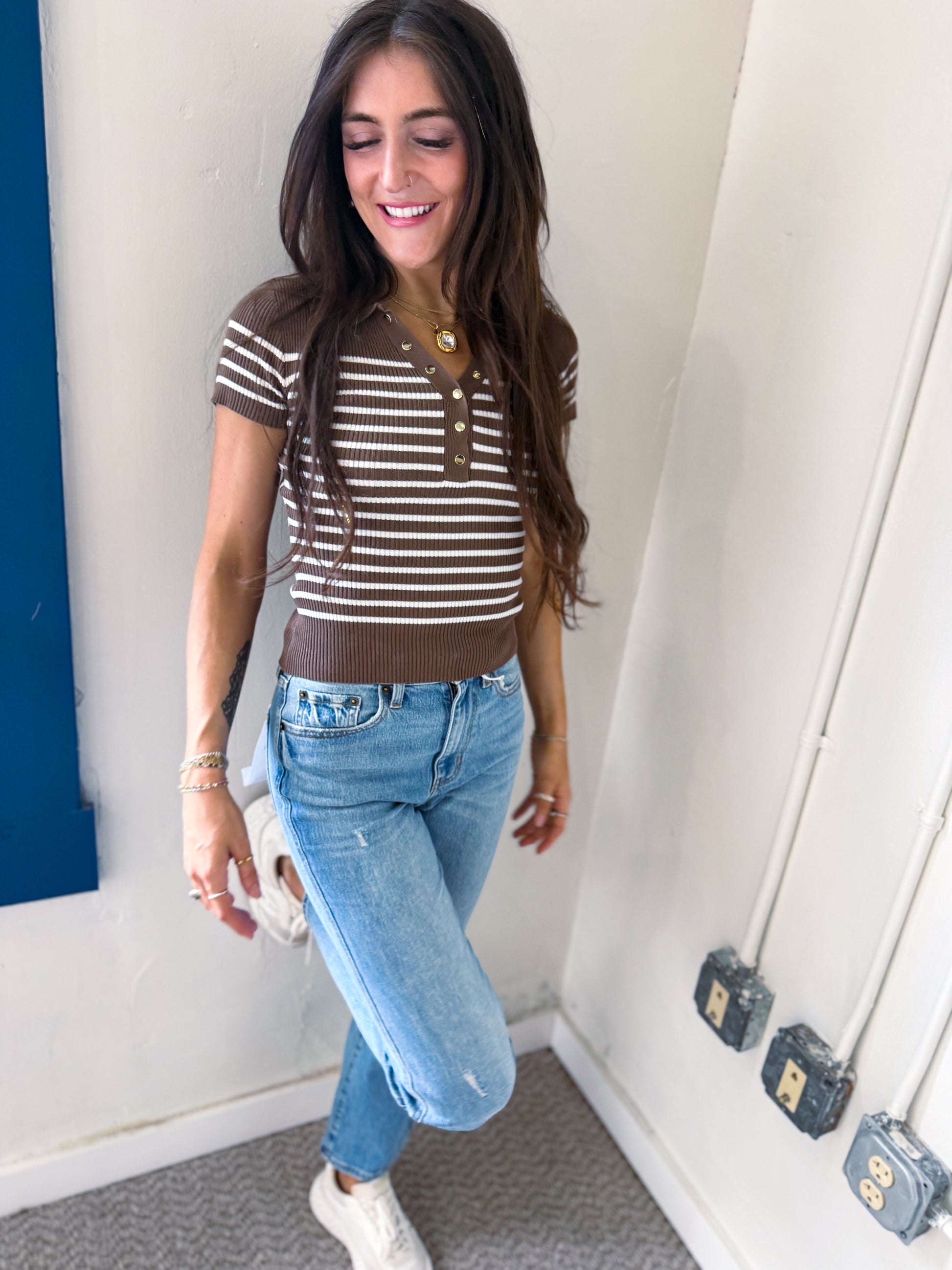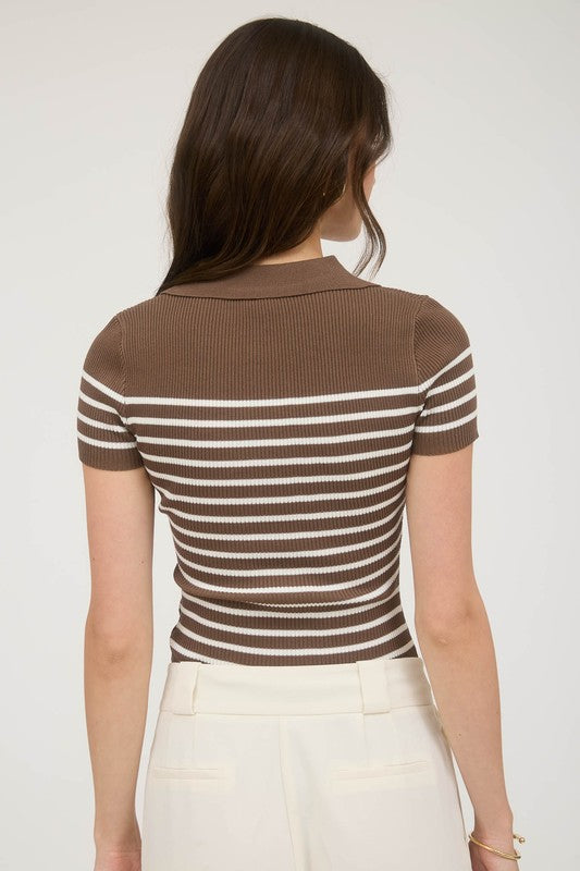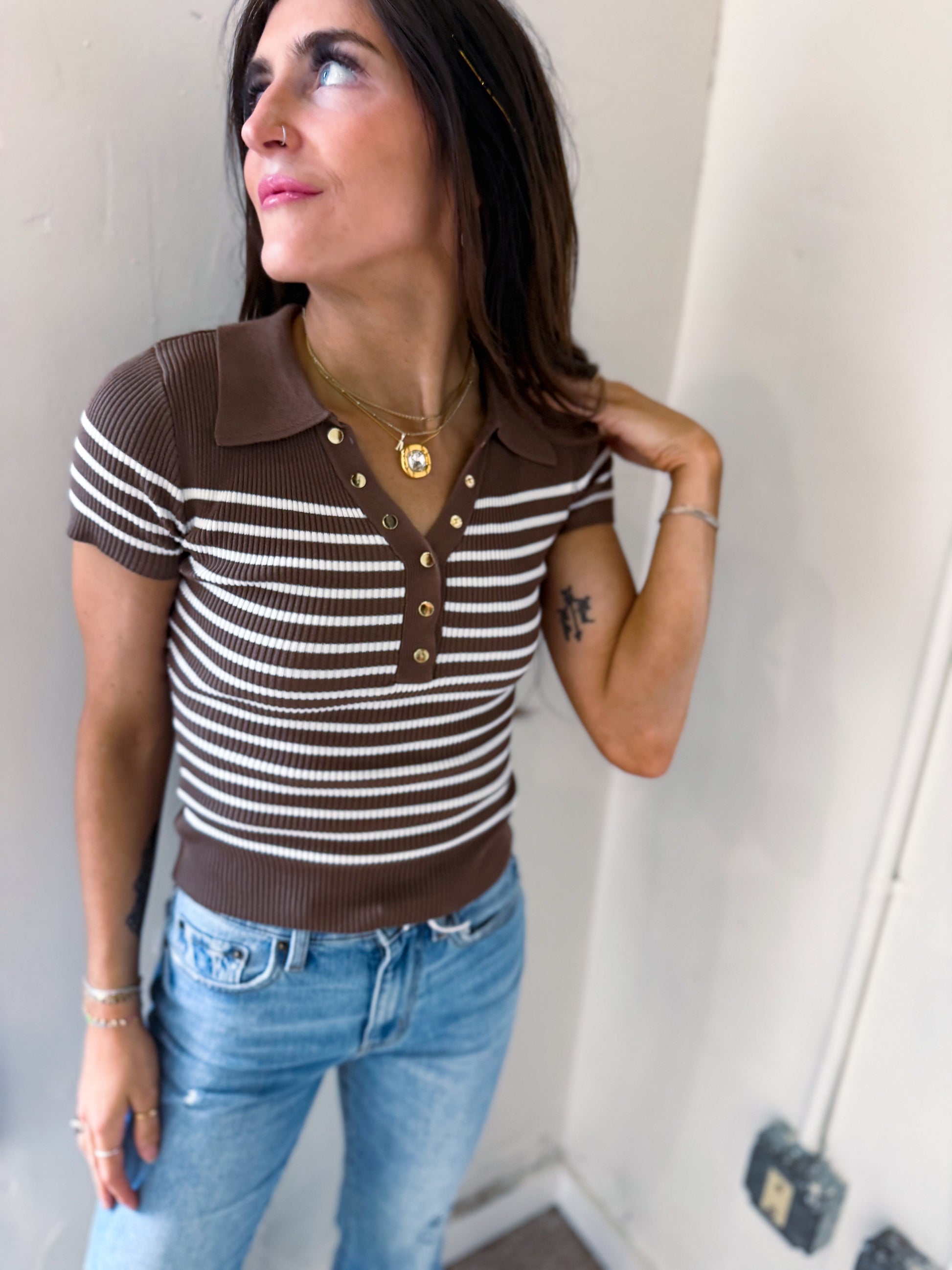 This Espresso Stripe Polo brings a fun twist to classic style with its playful stripe pattern and gold hardware accents. Crafted from a cozy sweater knit blend of 70% viscose and 30% polyester, it offers a fitted silhouette that hugs just right. Featuring a collared neckline, short sleeves, and a half snap button front, this polo is perfect for adding a dash of charm to your everyday look.
