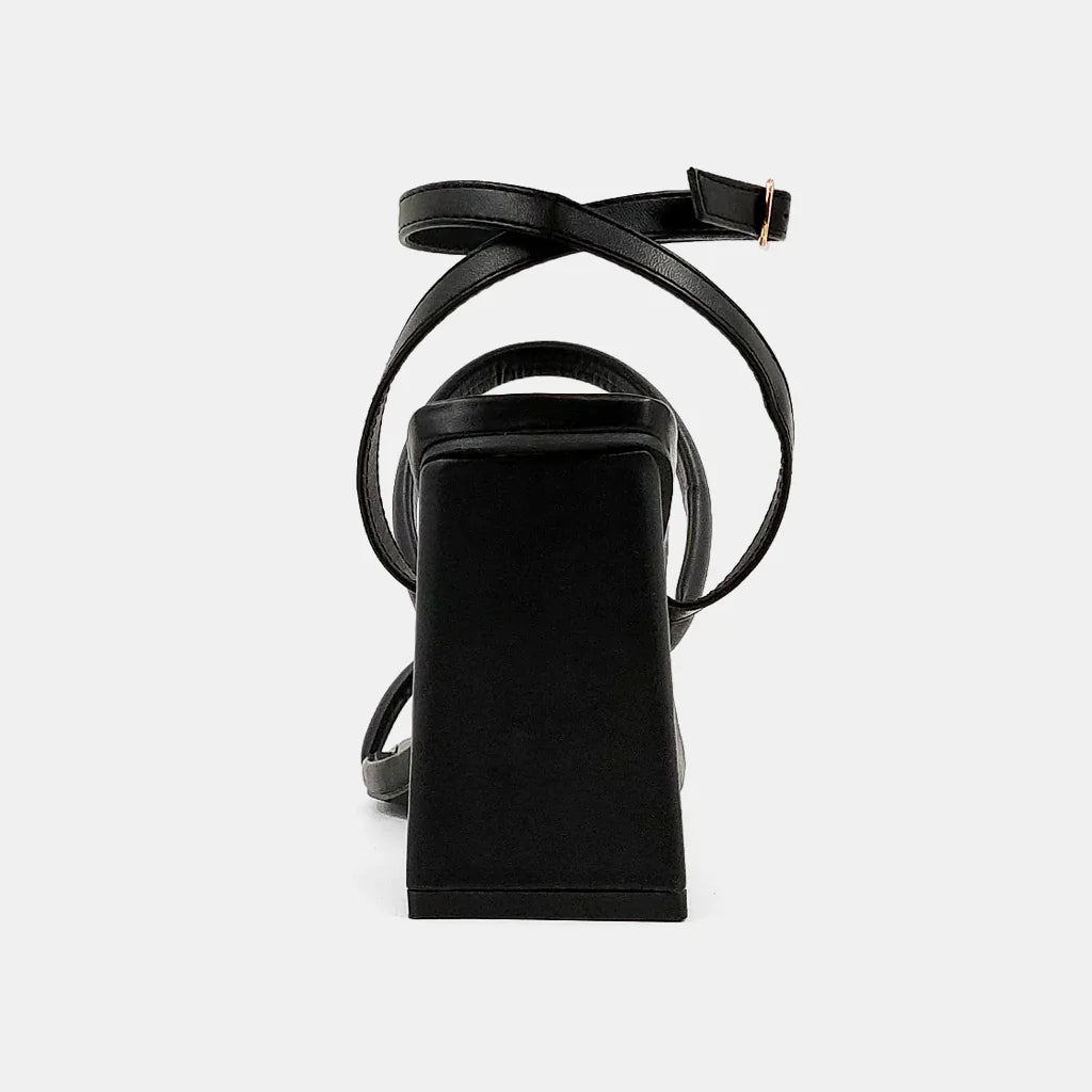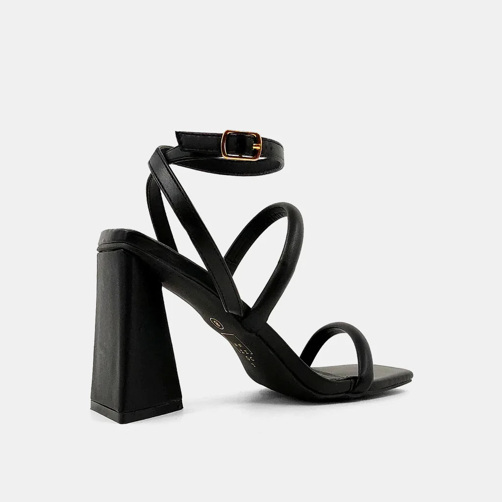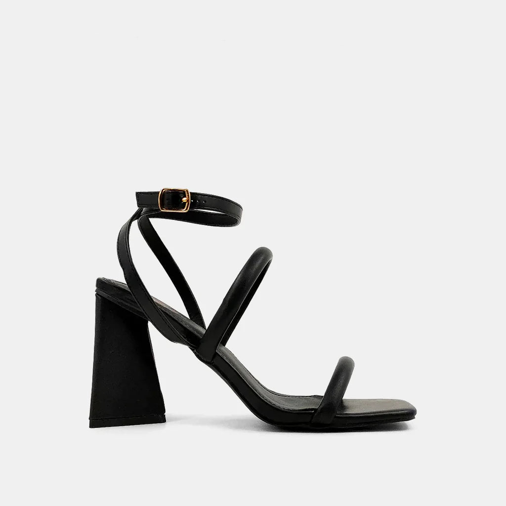 Fabricada en suave piel sintética, rematada por un tacón arquitectónico en forma de pirámide y sujetada con una delicada correa en el tobillo, EVANGELINE es la sandalia de tacón alto perfecta para usar con todo, desde vestidos fluidos hasta jeans.