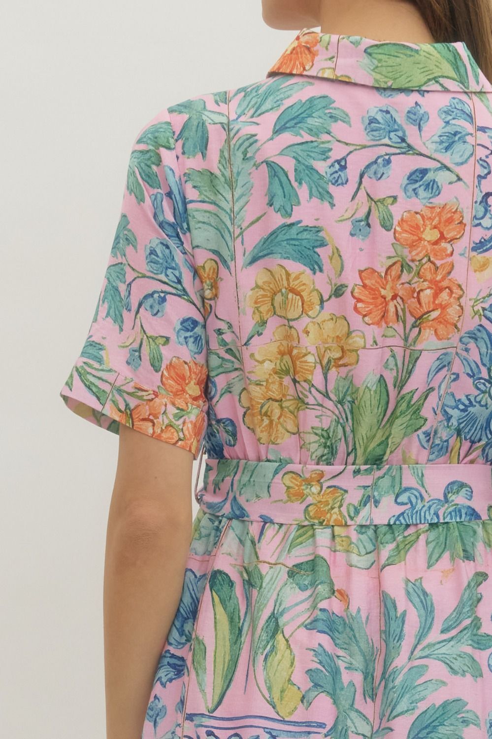 Bloom into effortless style with the Greenwich Garden Dress, where vibrant florals meet everyday versatility. This charming midi shirt dress features a classic button front, a flattering self-tie belt to cinch your waist, and practical side pockets for your essentials. Crafted from lightweight woven fabric with a comfortable lining, it's non-sheer and perfect for everything from brunch dates to garden parties. Dress it up with heels or keep it casual with sneakers—this botanical beauty adapts to your mood.
