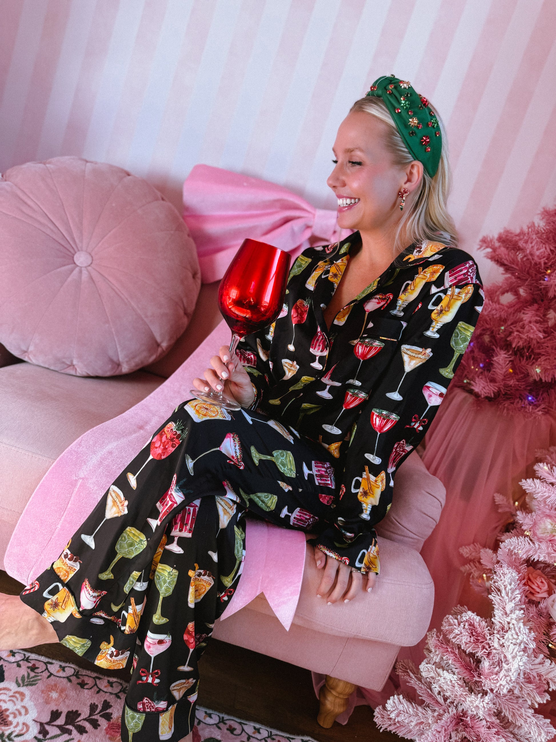 Sleep tight in these super silky button down pajamas! Sold as a set, these holiday cocktail print pjs have a drawstring and elastic waist.
