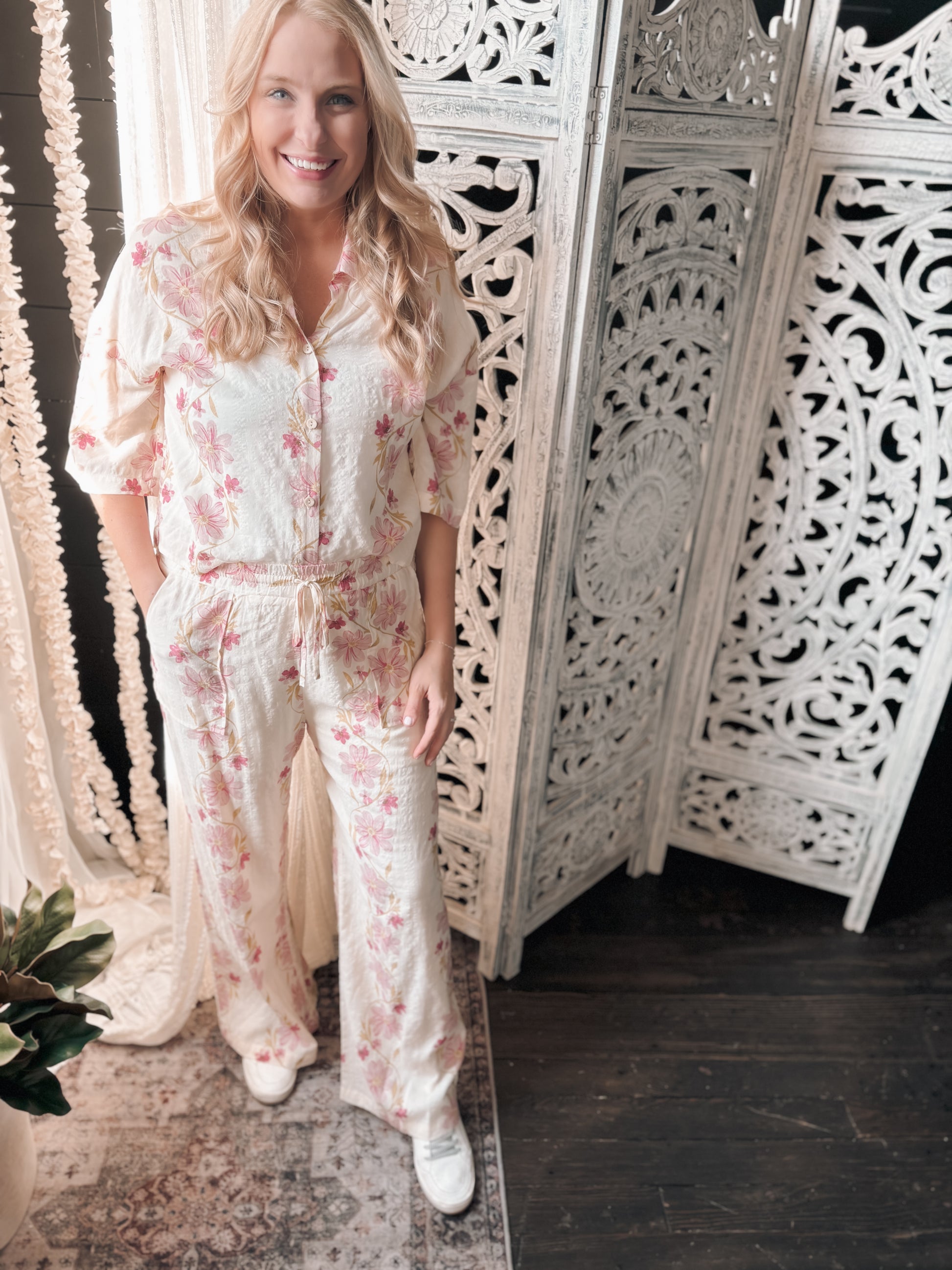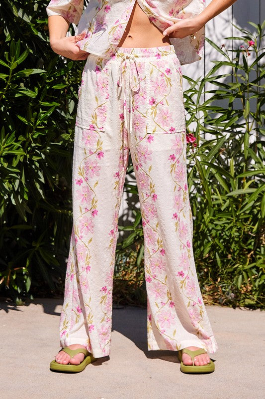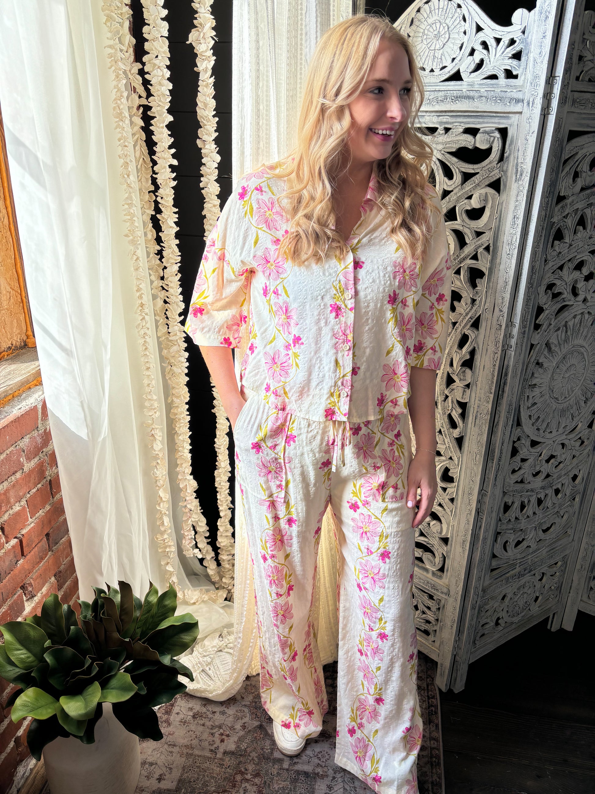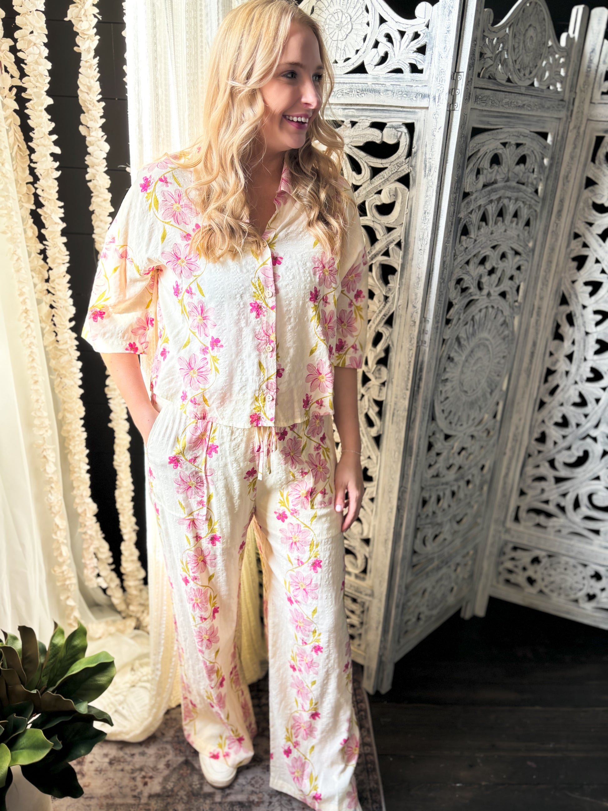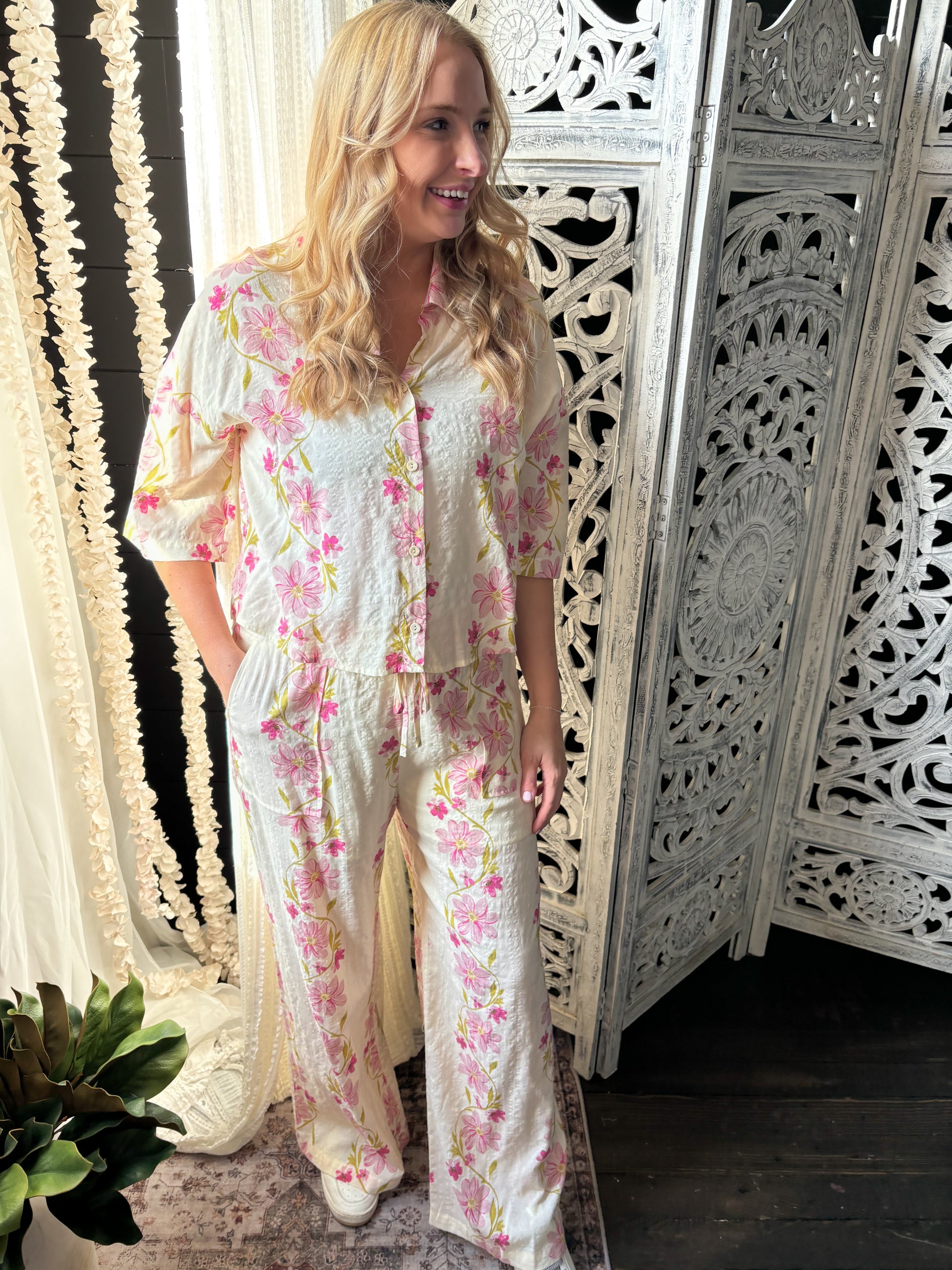 Get ready for a tropical adventure with the Ibiza Set! This printed set includes a stylish shirt top with a coconut button down and collar, perfect for breezy summer days. The matching pants feature an elastic waist band with tie for maximum comfort, as well as patch pockets for a touch of practicality. Bring on the vacation vibes!