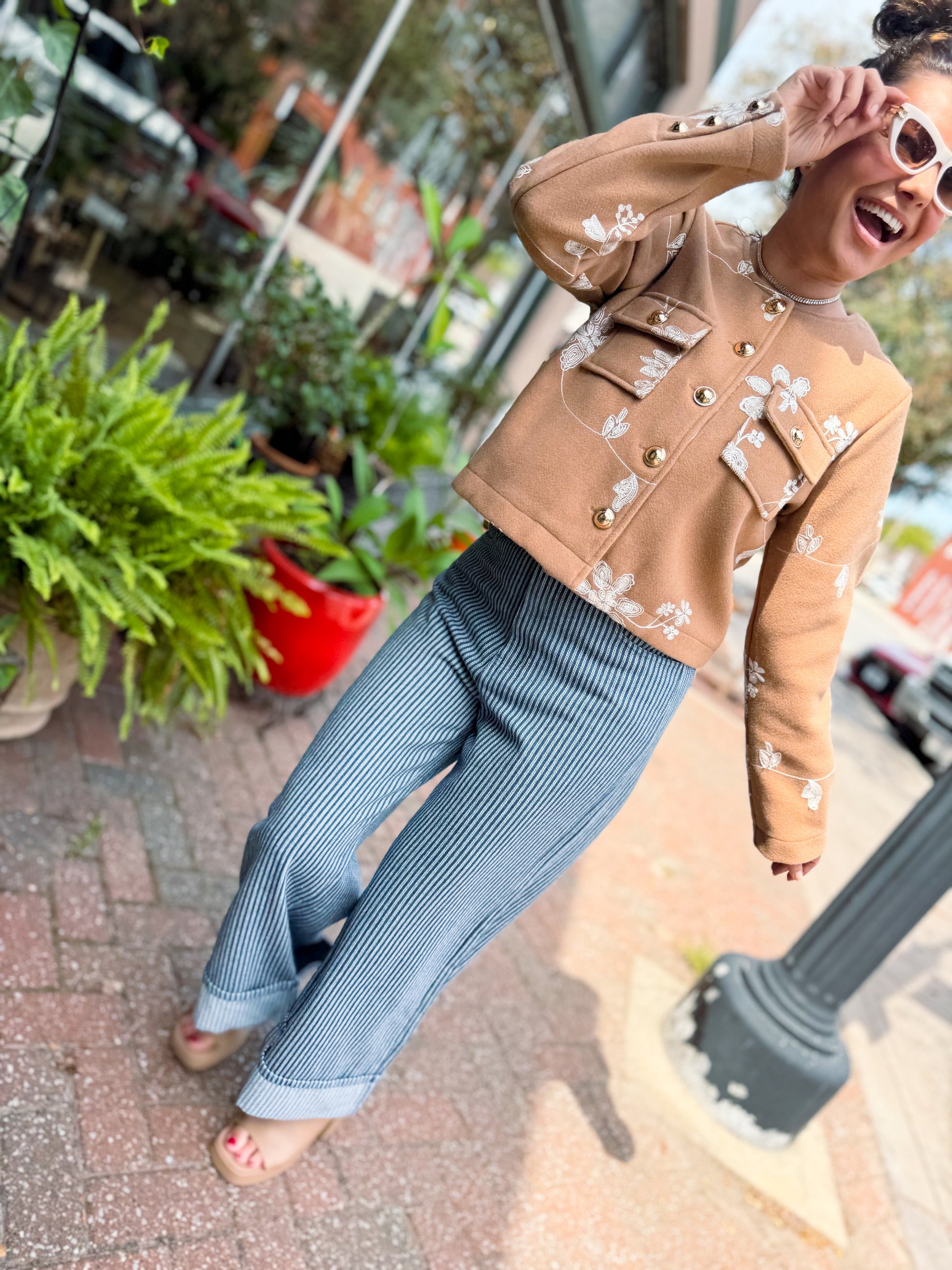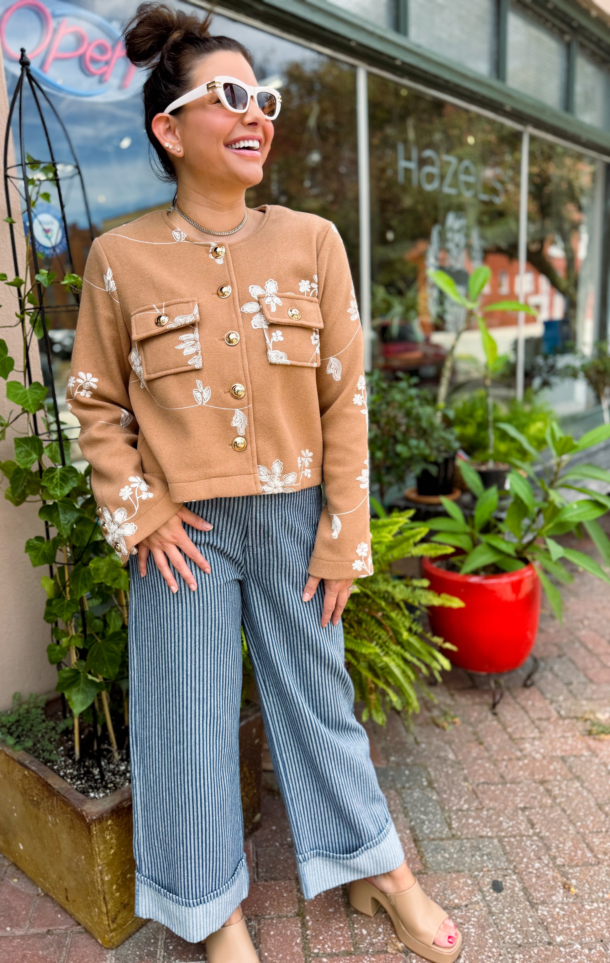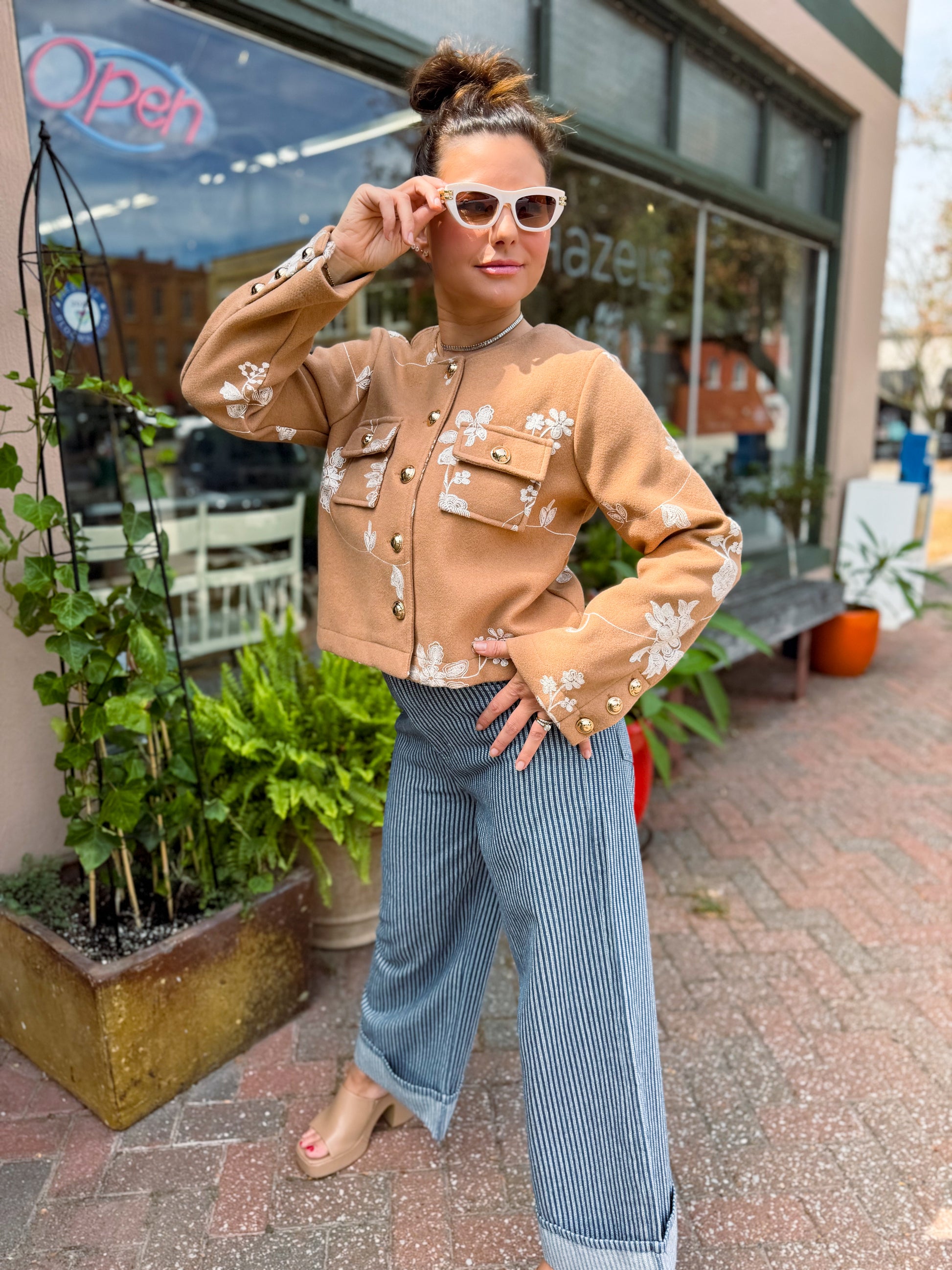 The Julian Jacket adds a playful twist to your wardrobe with its botanical embroidery and flattering cropped length. Featuring handy flap pockets with button details and charming buttons down the front and on the cuffs, this medium-weight woven jacket is unlined and non-sheer—perfect for layering with a touch of fun flair.
