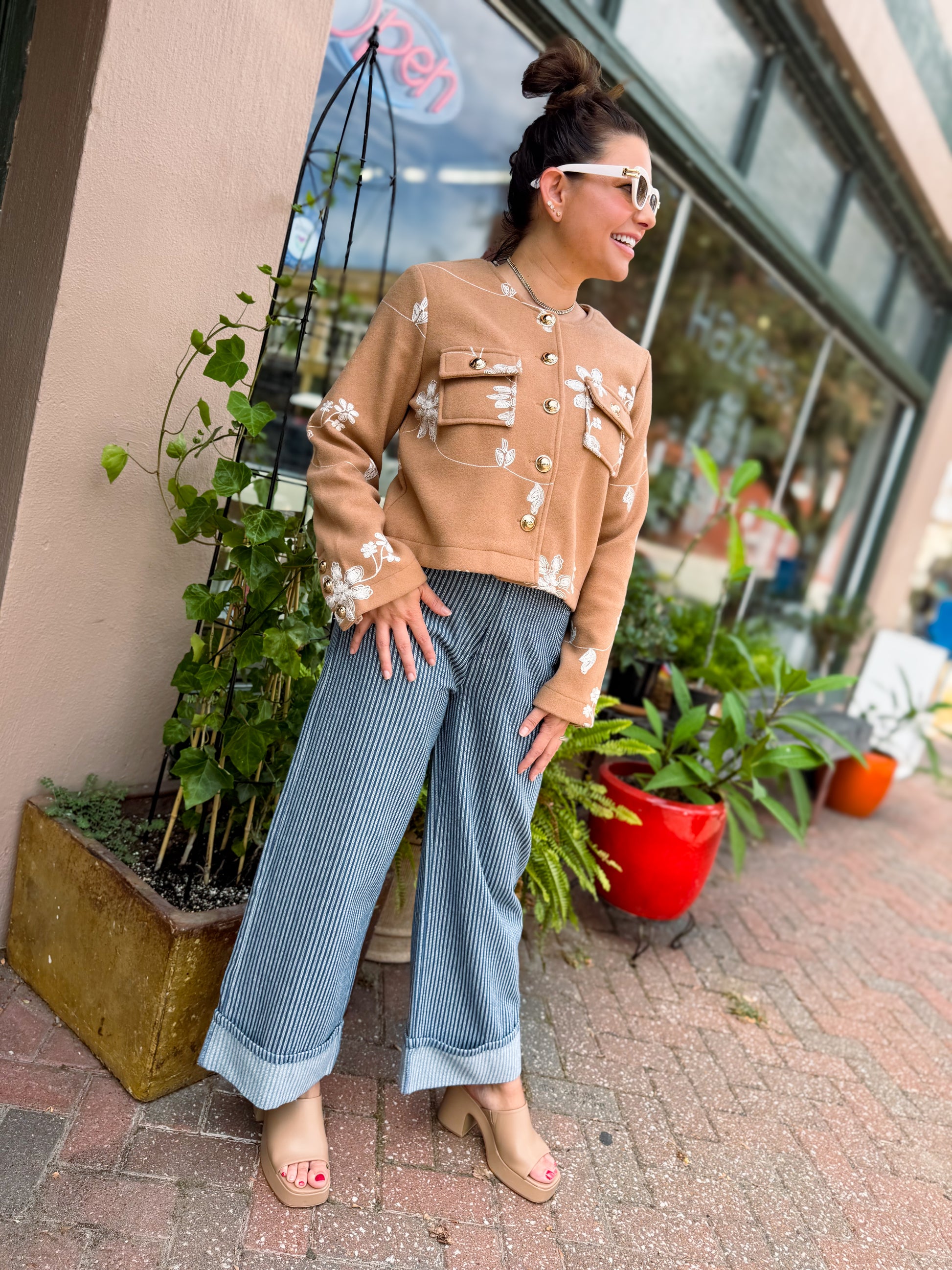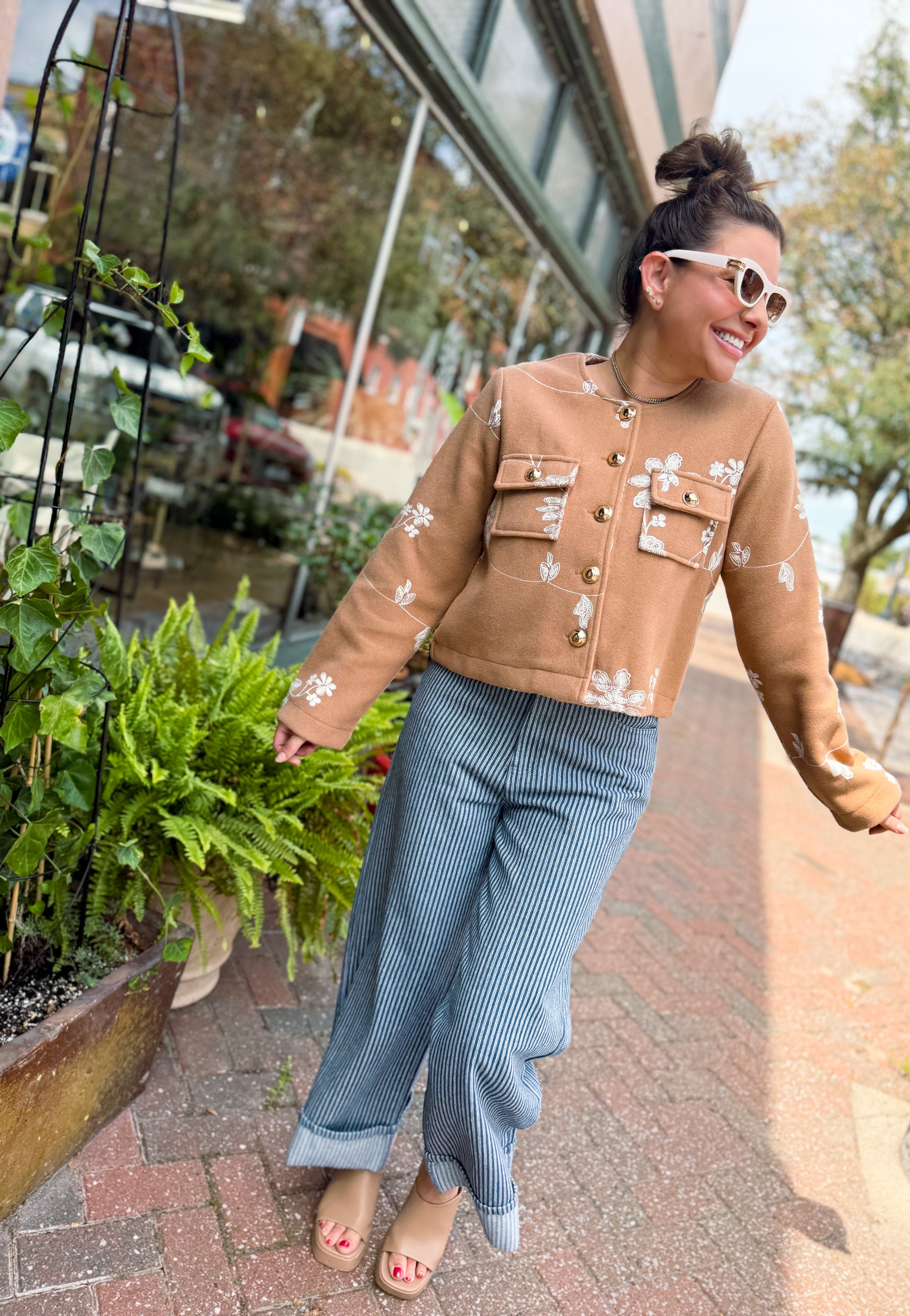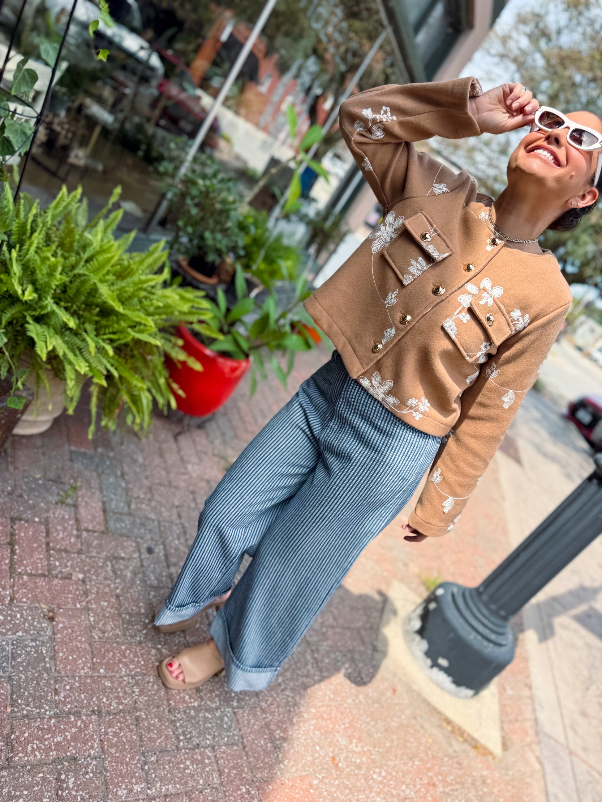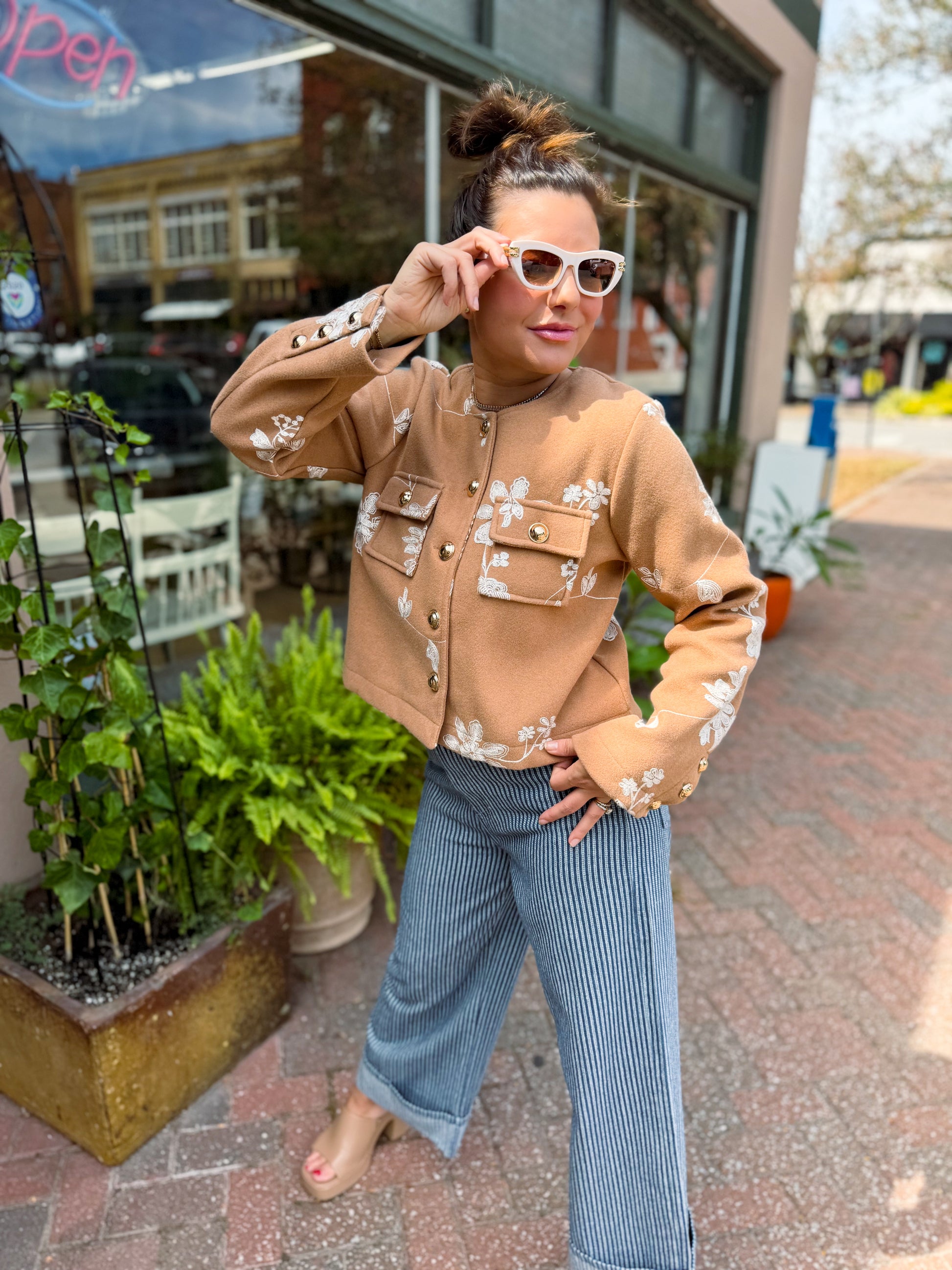The Julian Jacket adds a playful twist to your wardrobe with its botanical embroidery and flattering cropped length. Featuring handy flap pockets with button details and charming buttons down the front and on the cuffs, this medium-weight woven jacket is unlined and non-sheer—perfect for layering with a touch of fun flair.