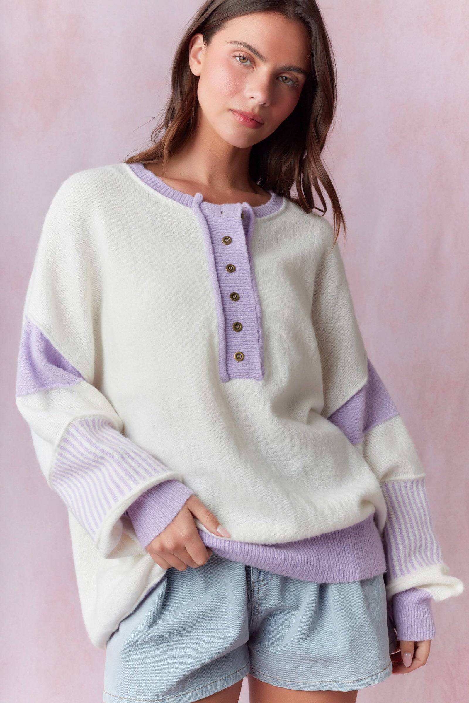 Upgrade your sweater game with our Lavender Haze Henley. This playful henley features a color contrast design and oversized fit, giving you ultimate comfort and style. Perfect for adding a touch of quirkiness to your wardrobe.