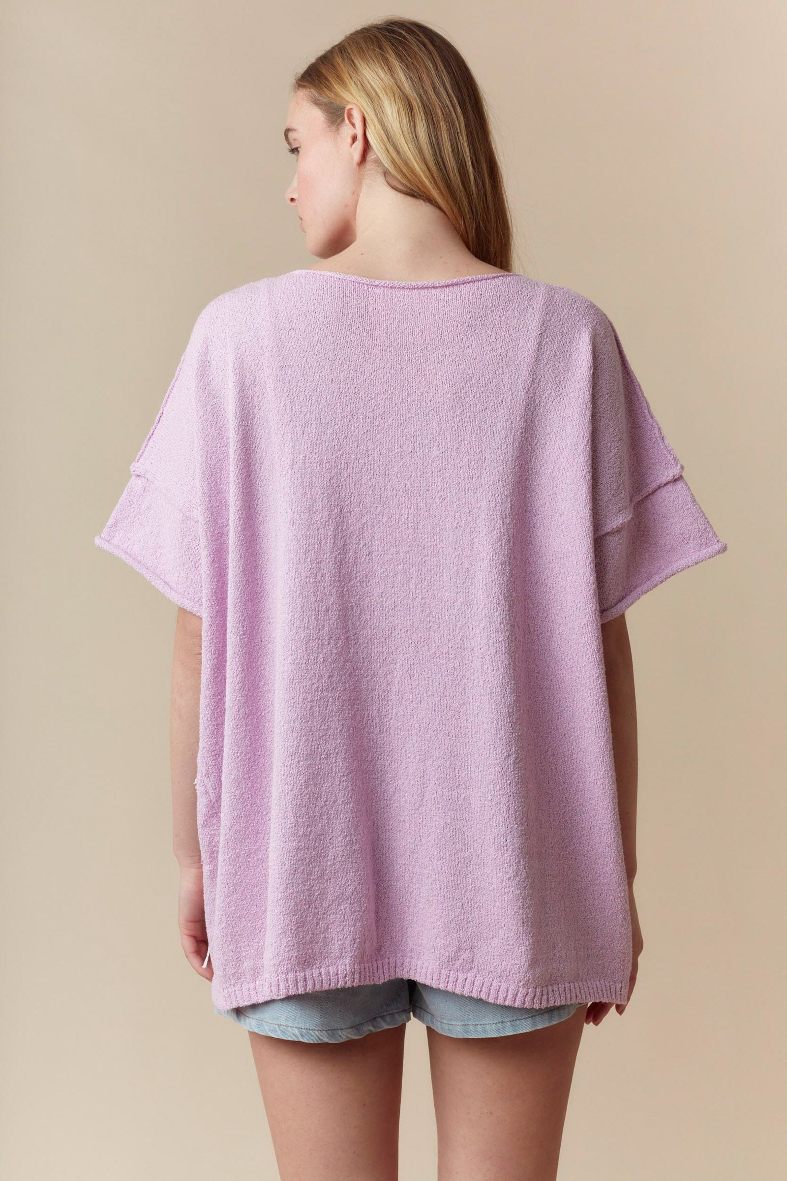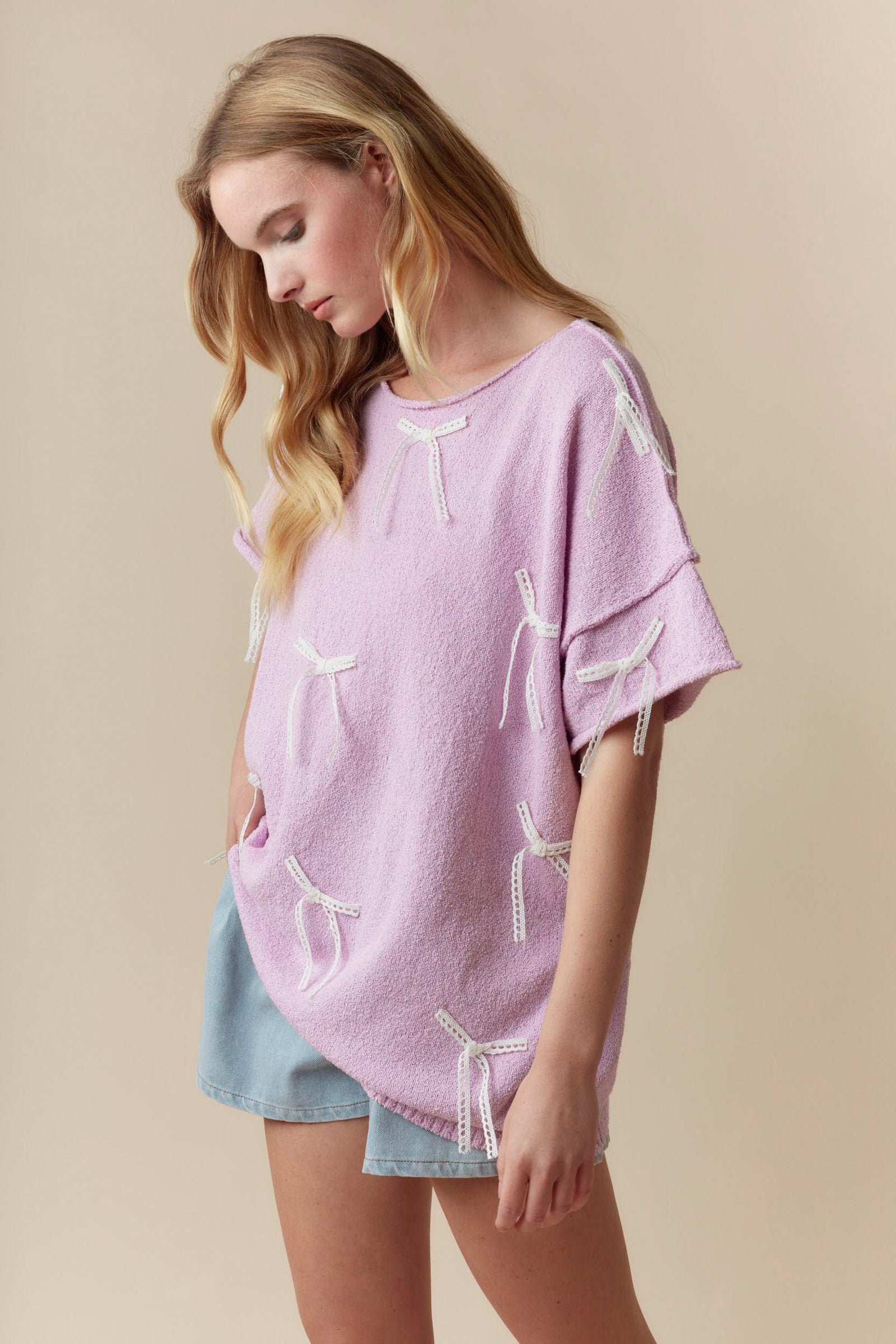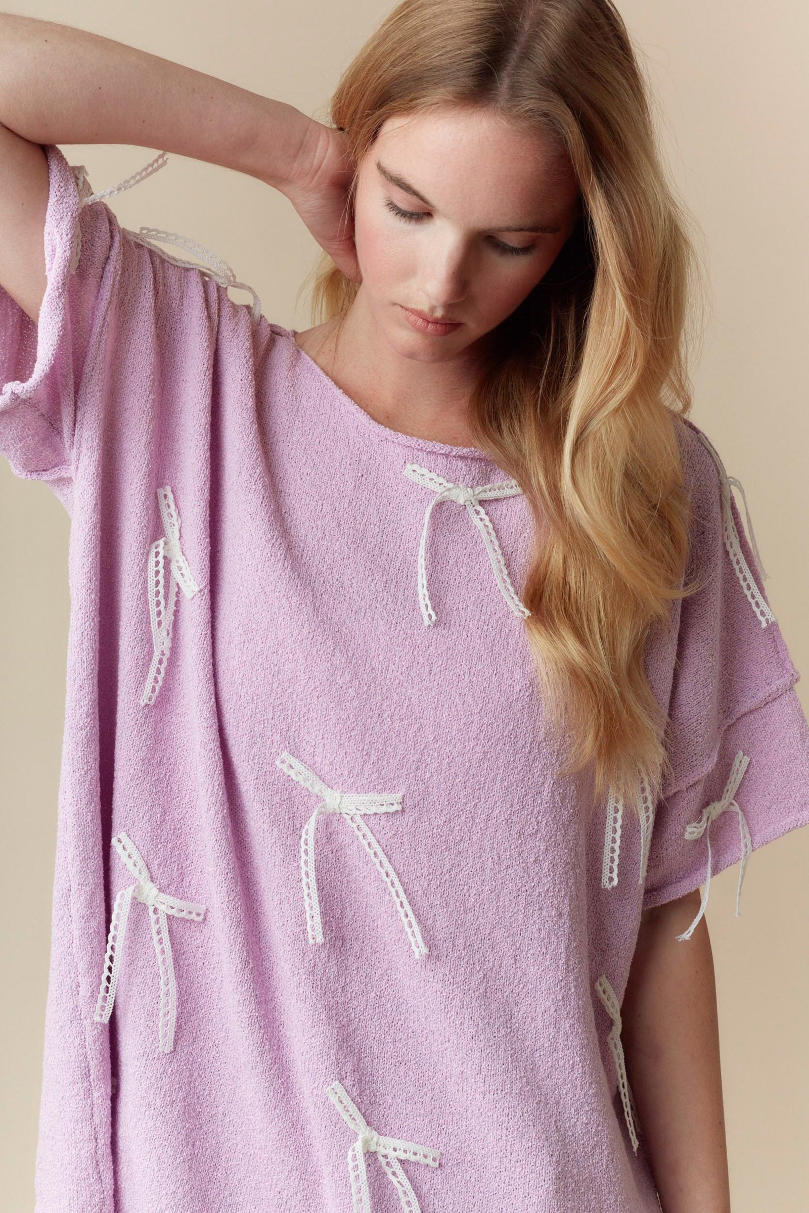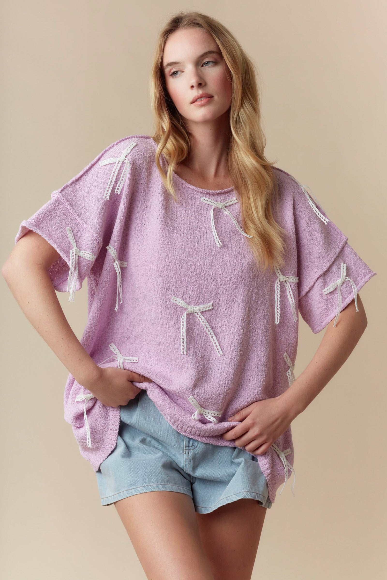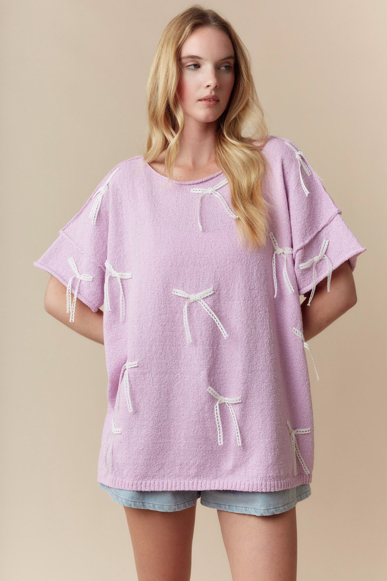 Add a playful touch to your summer wardrobe with our Lavender Lace Bow Short Sleeve Sweater. The light knit and round neck provide comfort for warmer days while the lace bows add a hint of whimsy. Perfect for those who like to keep things fun and light!