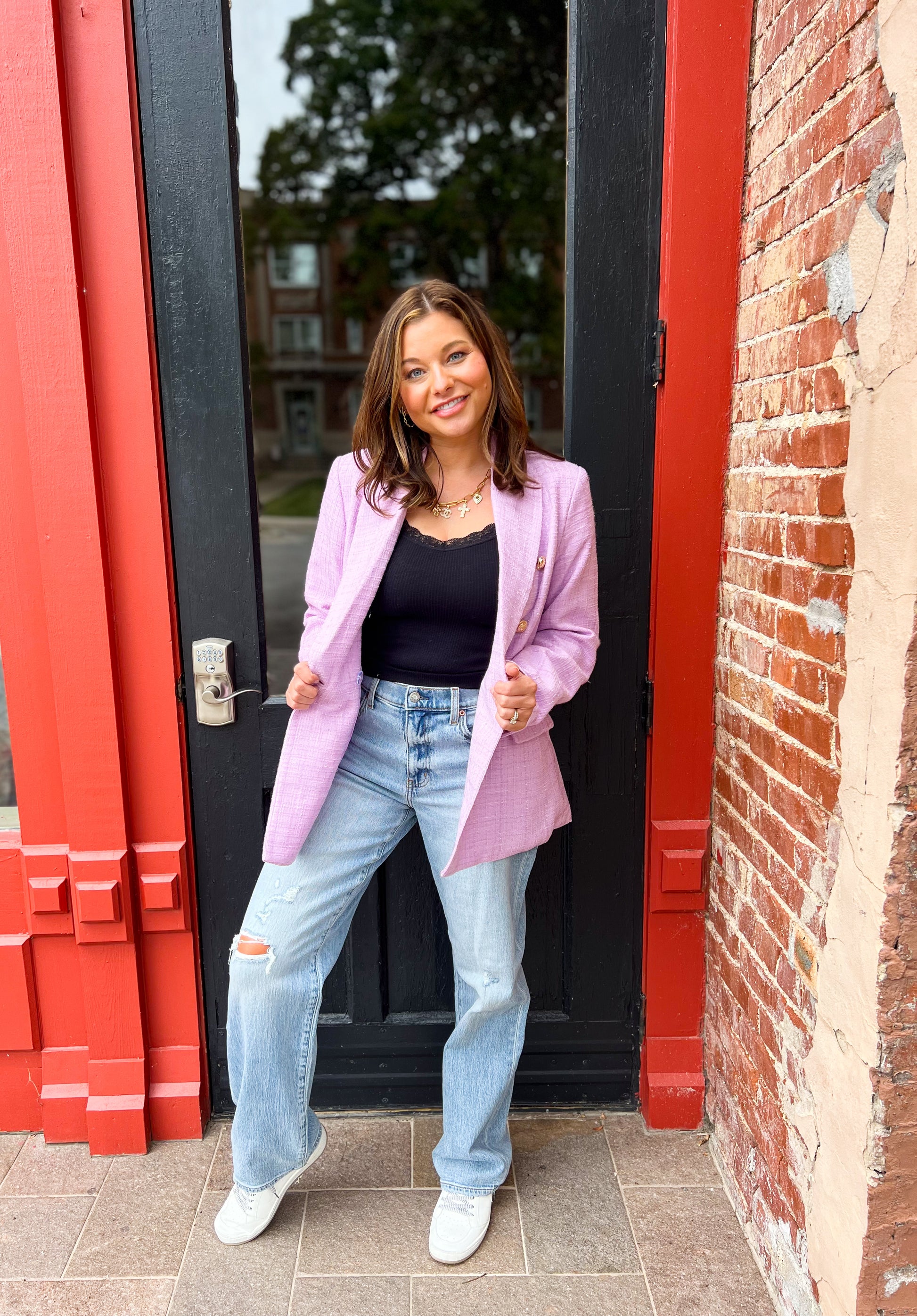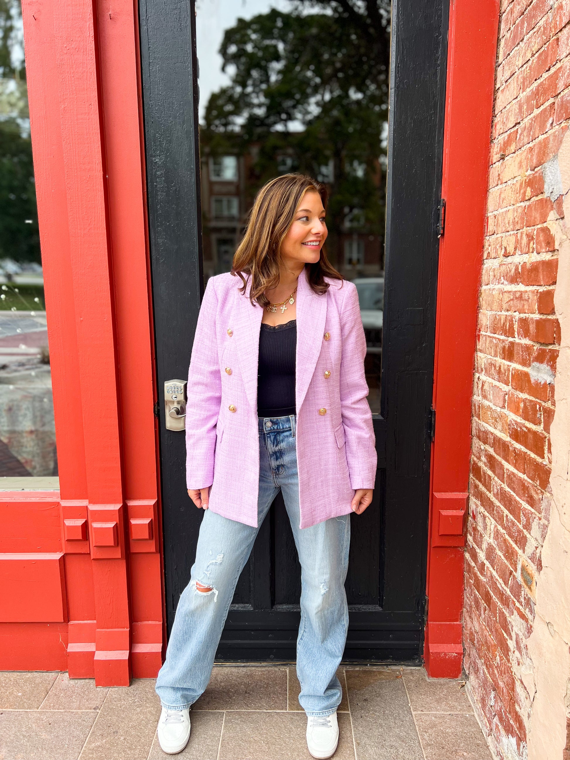 ¡El blazer Tucker es la prenda perfecta para completar tu atuendo! Está confeccionado en tweed, tiene bolsillos falsos y un cierre funcional con botones dorados en la parte delantera, además de un cierre con botones ocultos en el interior.