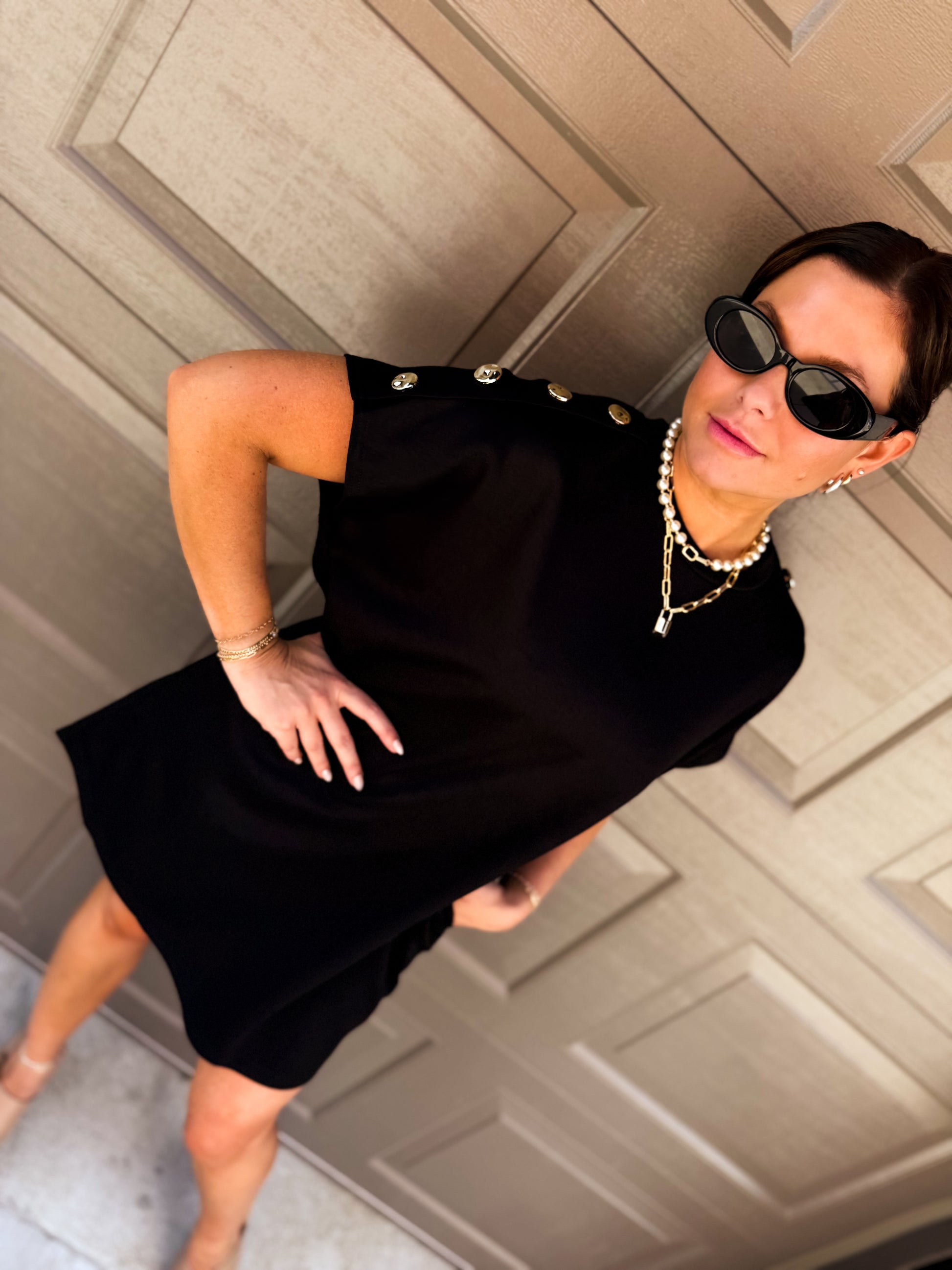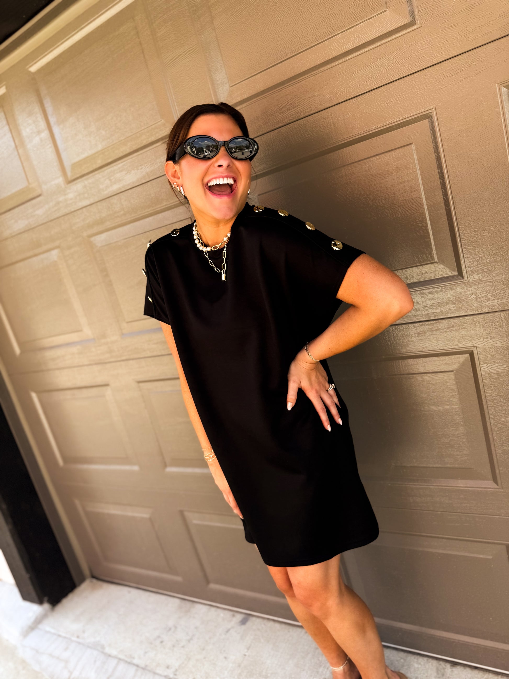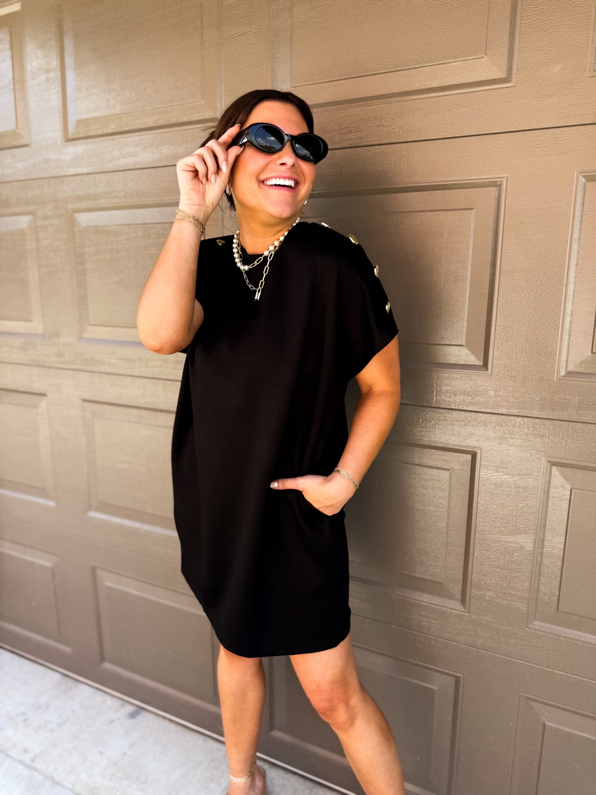 This playful Madison Button Mini Dress brings a fun twist to your wardrobe with its solid knit fabric and charming gold button accents along the shoulders. Designed with convenient side pockets and a breezy unlined fit, it's perfect for effortless style on sunny days and casual nights out.