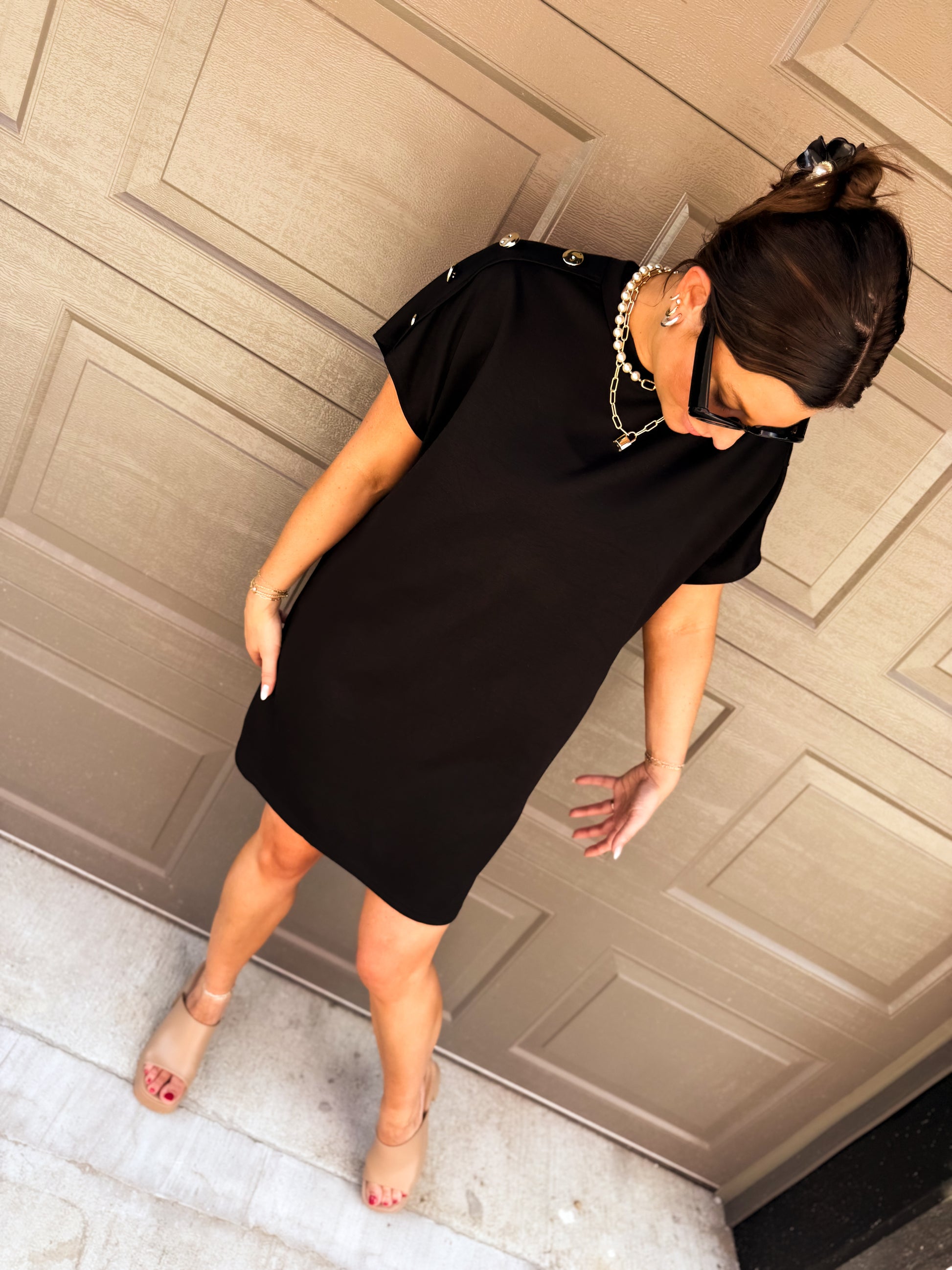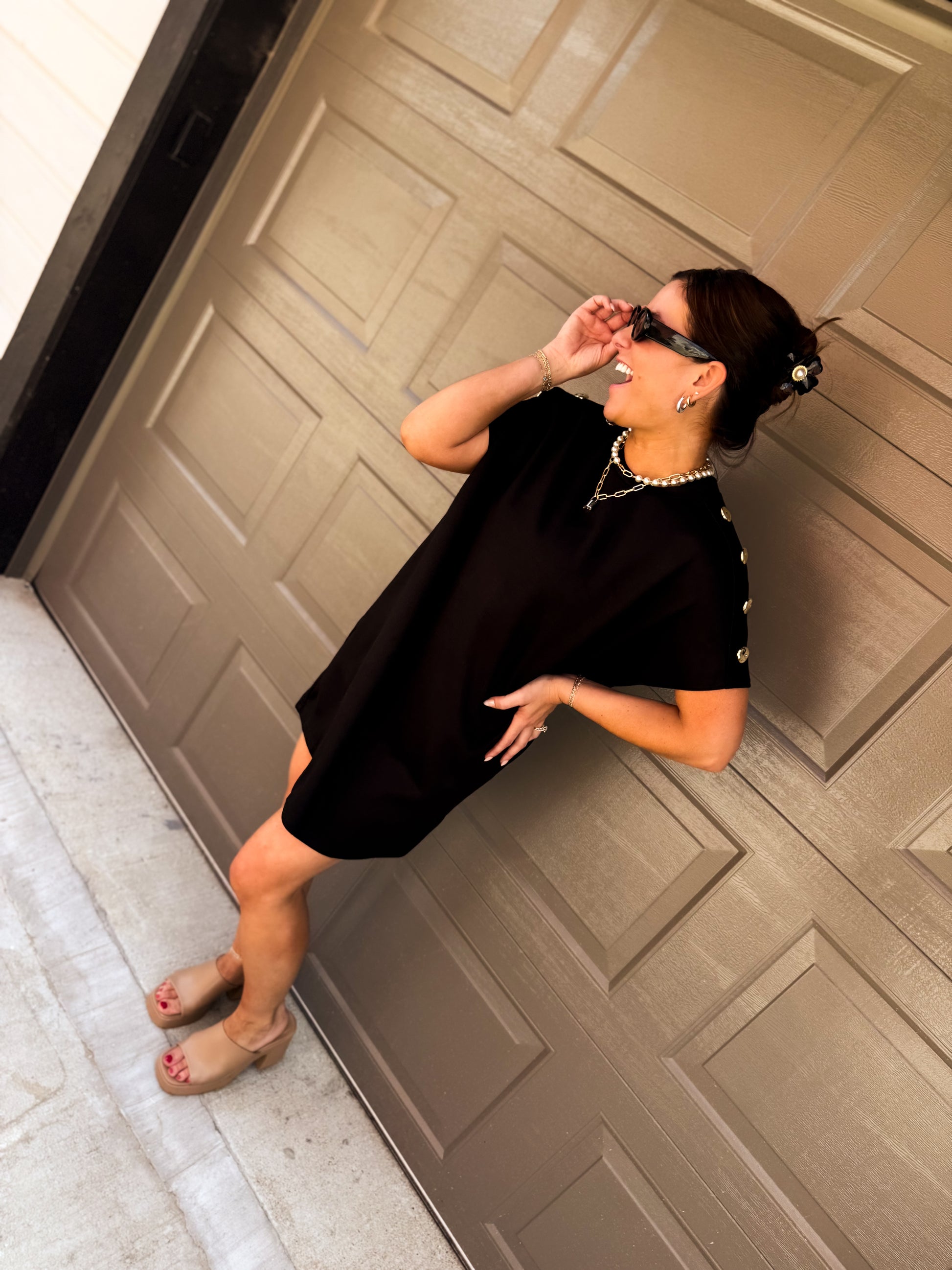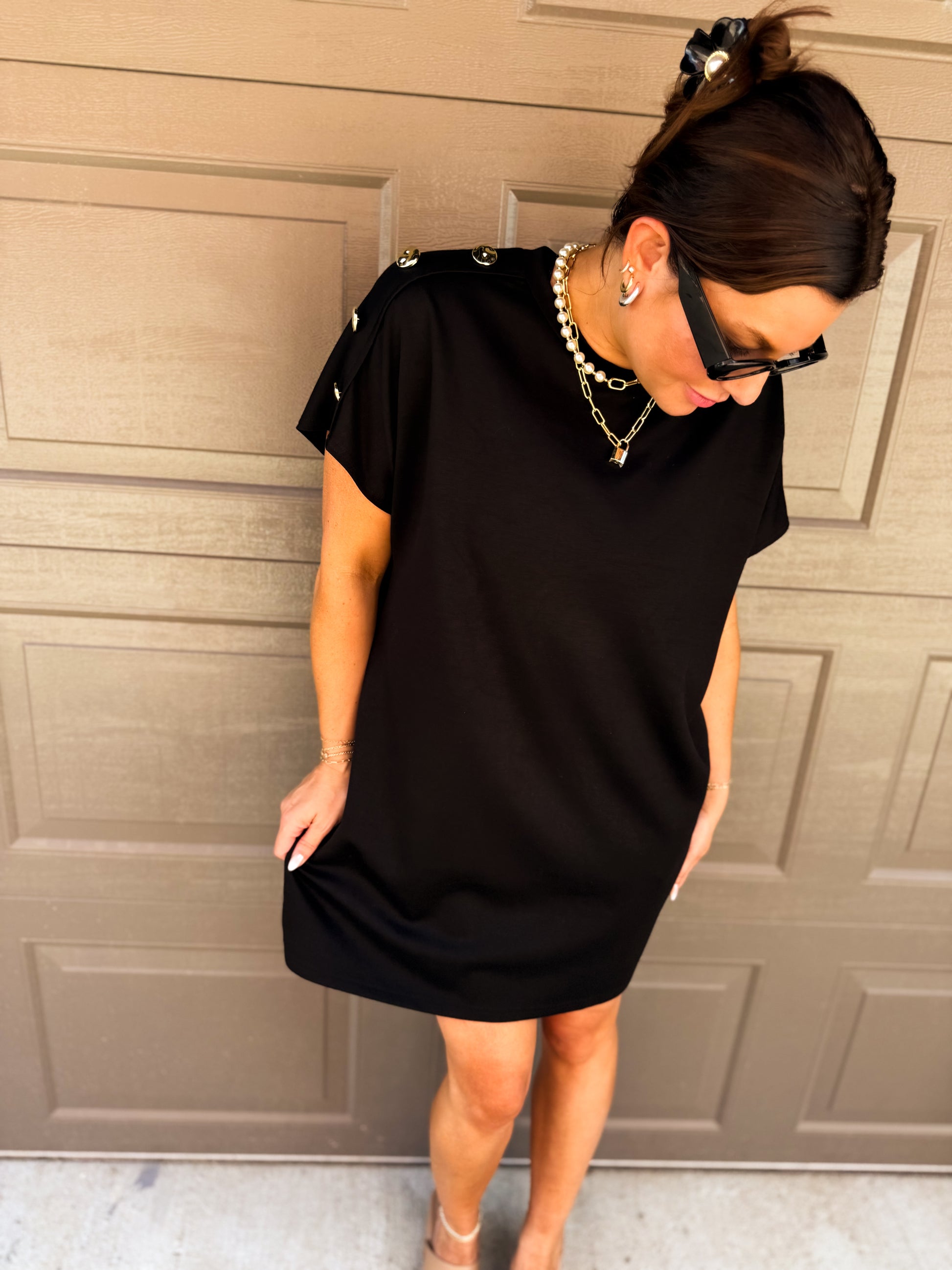 This playful Madison Button Mini Dress brings a fun twist to your wardrobe with its solid knit fabric and charming gold button accents along the shoulders. Designed with convenient side pockets and a breezy unlined fit, it's perfect for effortless style on sunny days and casual nights out.