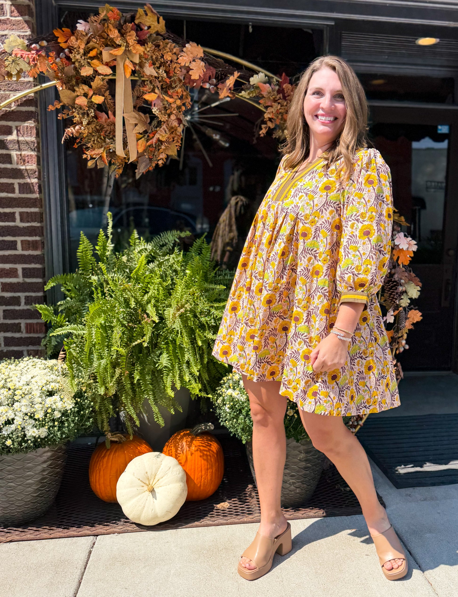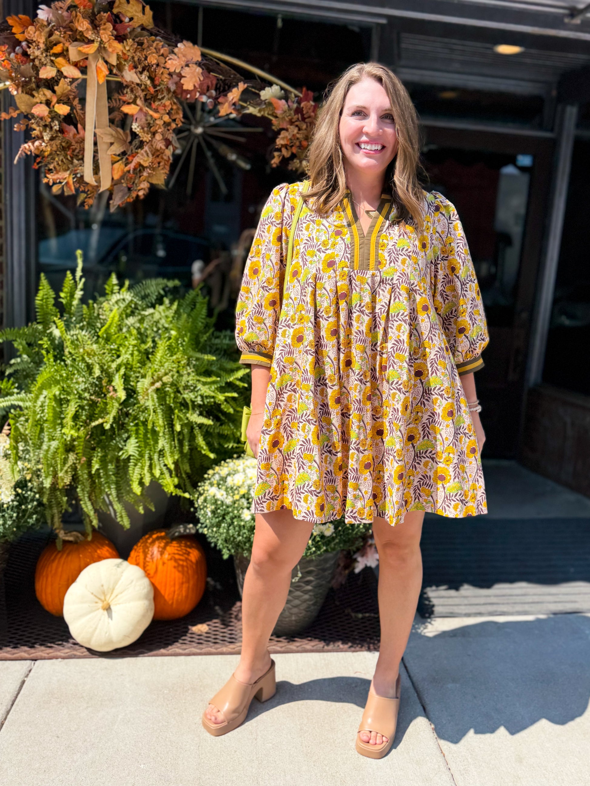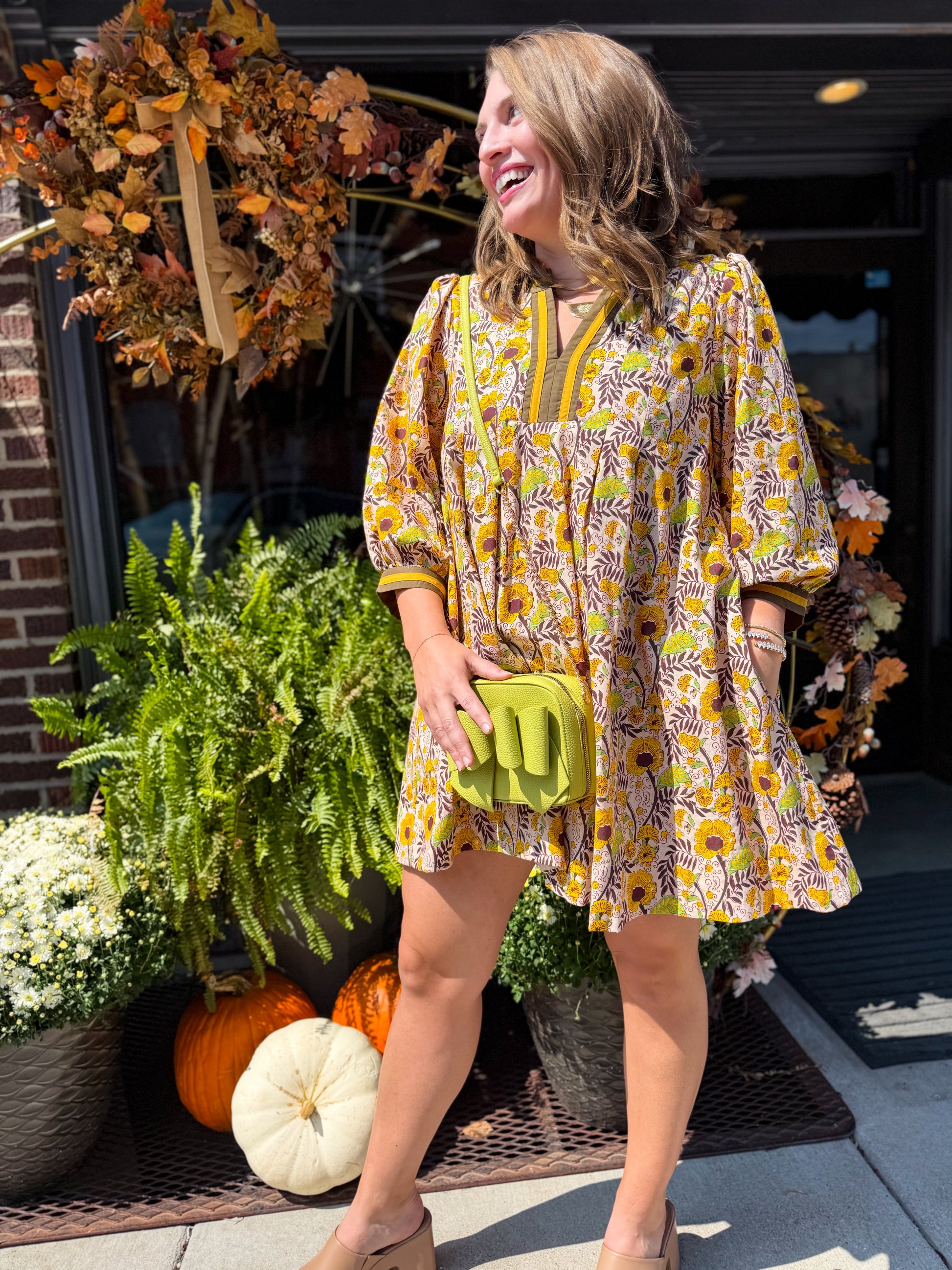 Step into spring with the Marigold Meadow Dress, a flirty mini that’s perfect for sunny days. Its 3/4 puff sleeves and contrast trim split neck add a touch of whimsy, while handy side pockets bring fun and function together. Fully lined for comfort, this dress brings playful charm to any occasion.