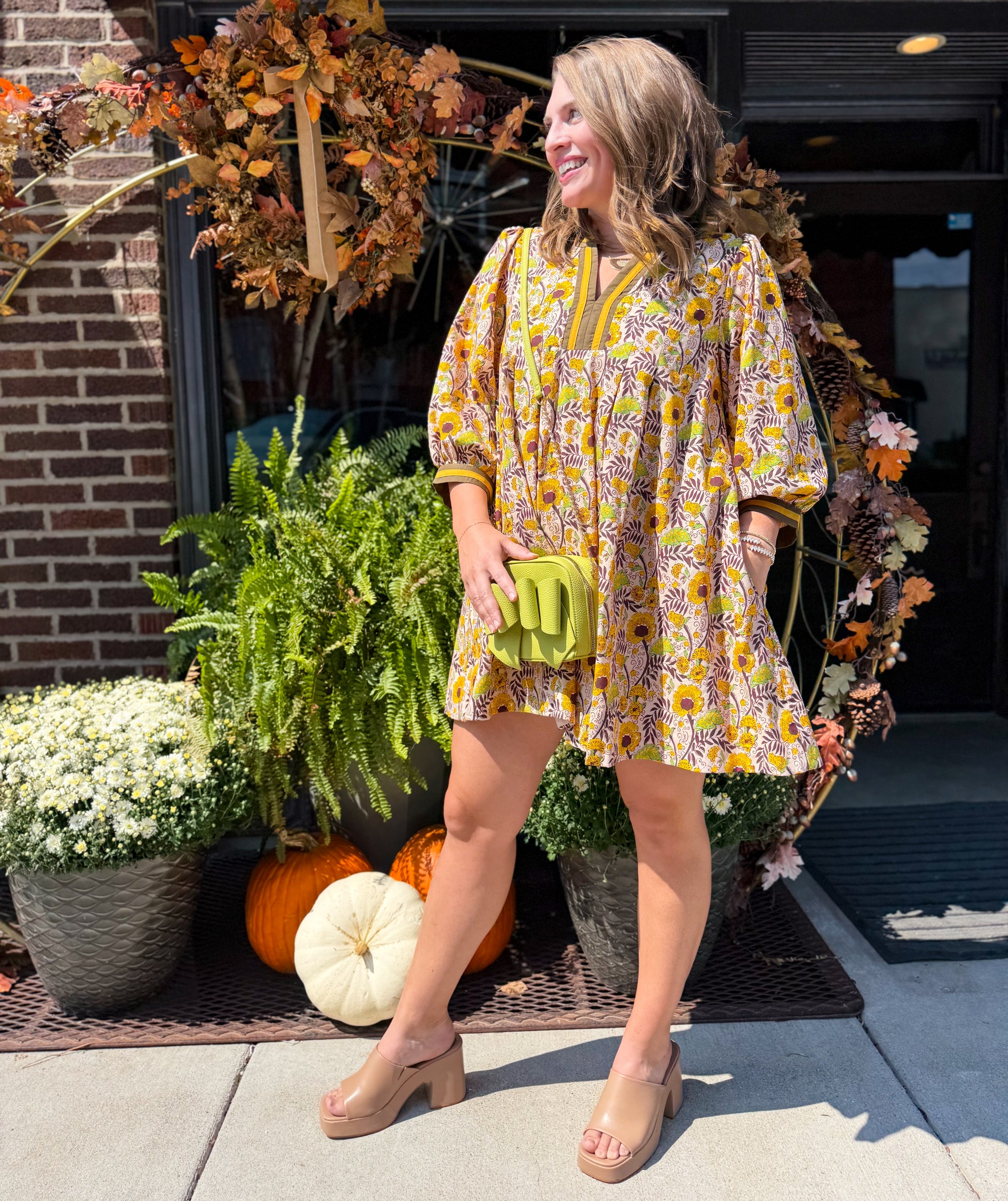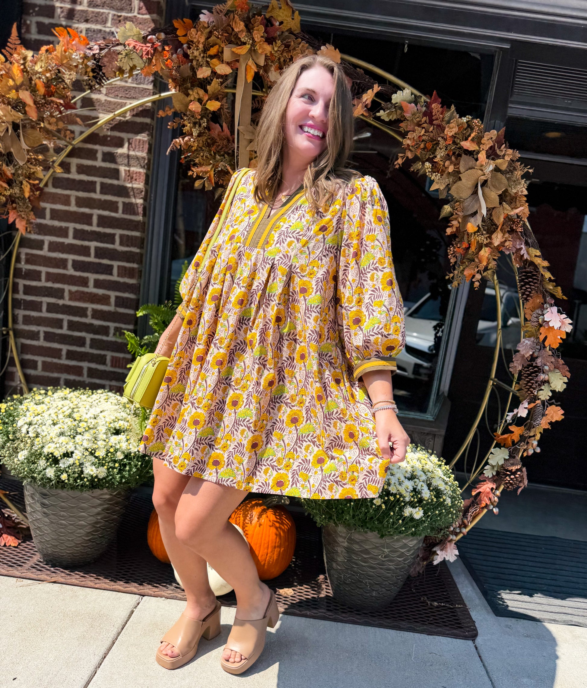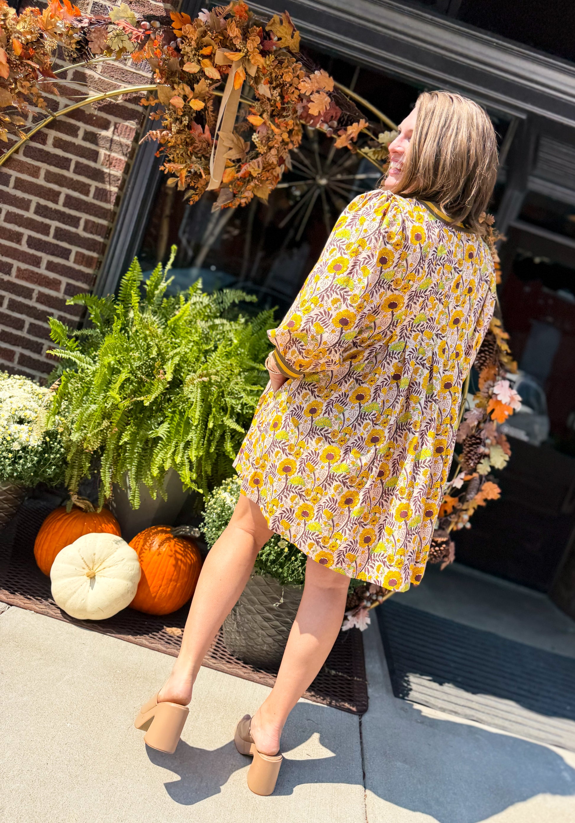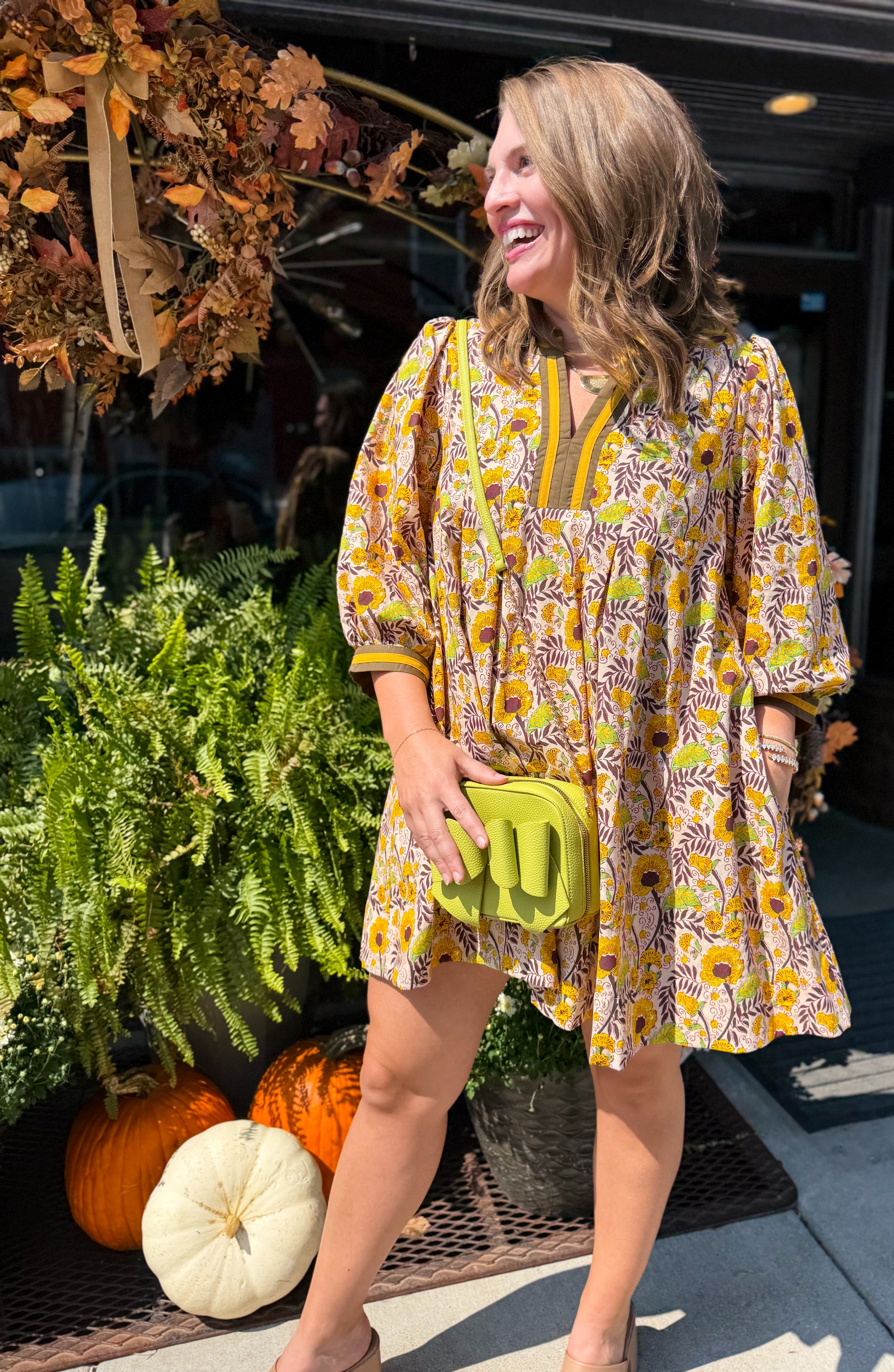 Step into spring with the Marigold Meadow Dress, a flirty mini that’s perfect for sunny days. Its 3/4 puff sleeves and contrast trim split neck add a touch of whimsy, while handy side pockets bring fun and function together. Fully lined for comfort, this dress brings playful charm to any occasion.