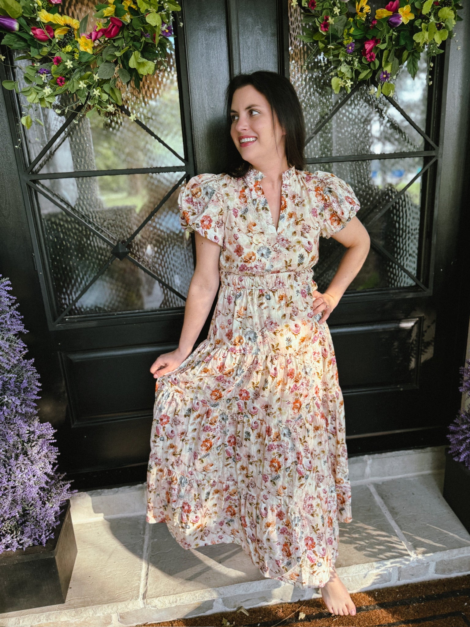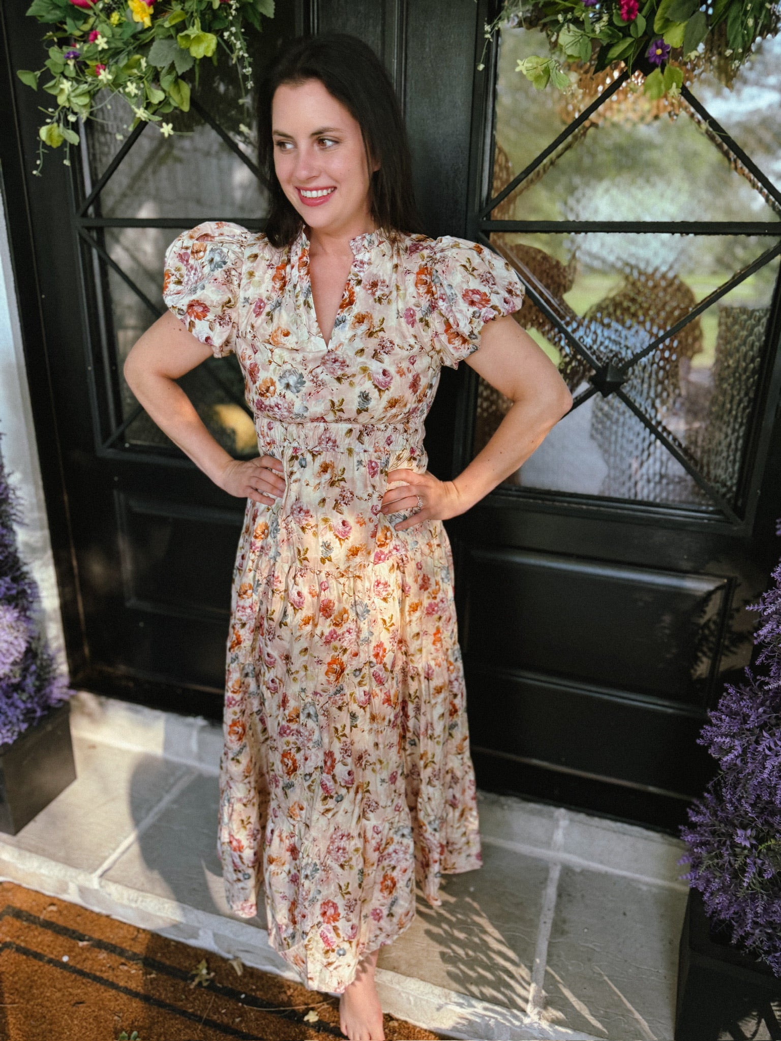 This playful Meadow Bloom Maxi dress features a charming floral print and short bubble puff sleeves for a fun, flirty vibe. The double elasticated waist adds a flattering shape, while the tiered midi skirt creates a breezy, twirl-worthy silhouette. Fully lined for comfort, it’s perfect for sunny days and garden parties.
