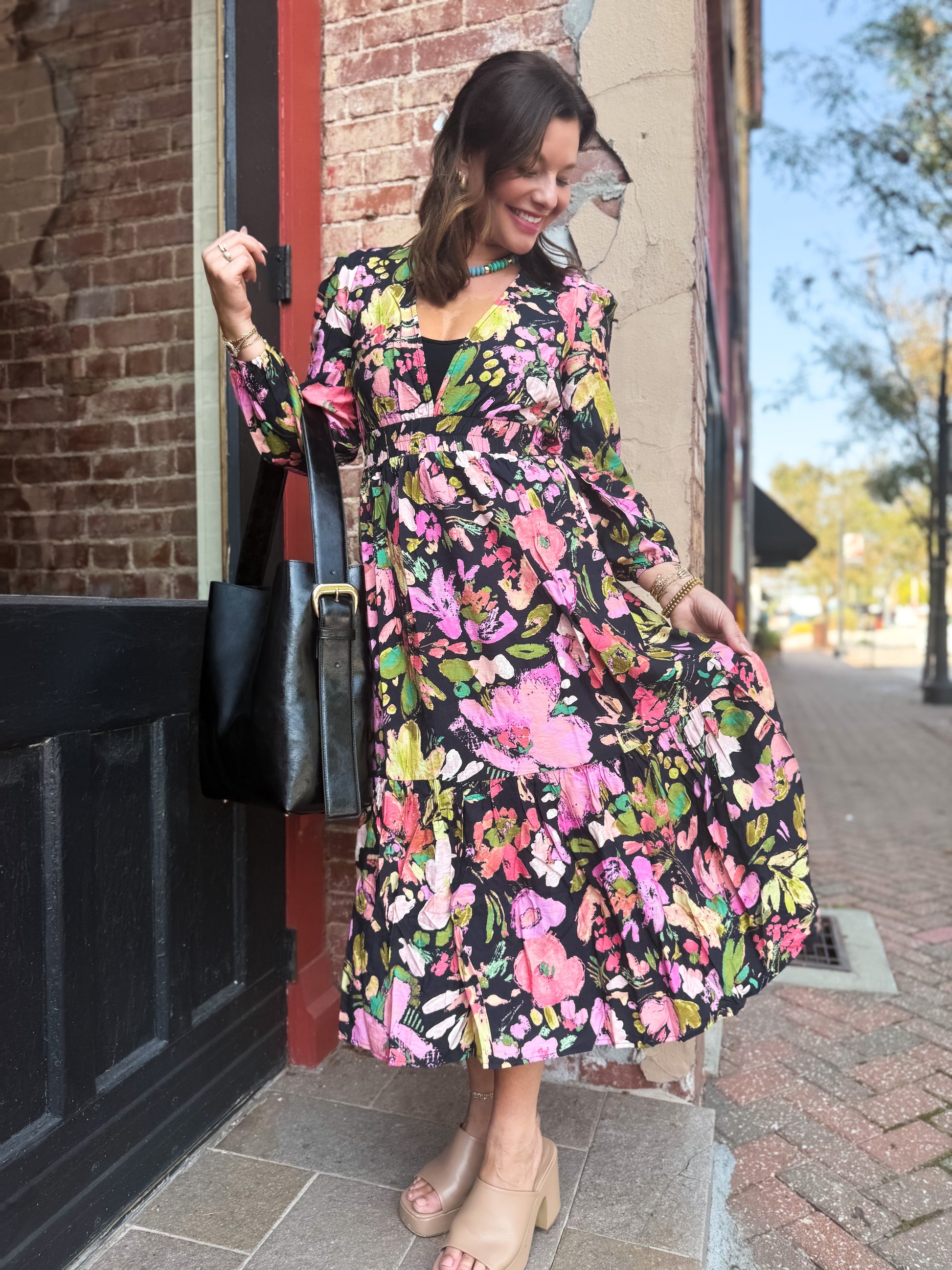 Embrace effortless charm with the Midnight Garden Maxi Dress. Featuring a flirty deep V neckline and a smocked waist that flatters your silhouette, this lightweight maxi dress flows beautifully from long sleeves to hem. Perfect for sunny days or dreamy evenings, it brings a playful touch to your wardrobe while keeping you comfortable and chic all day long.