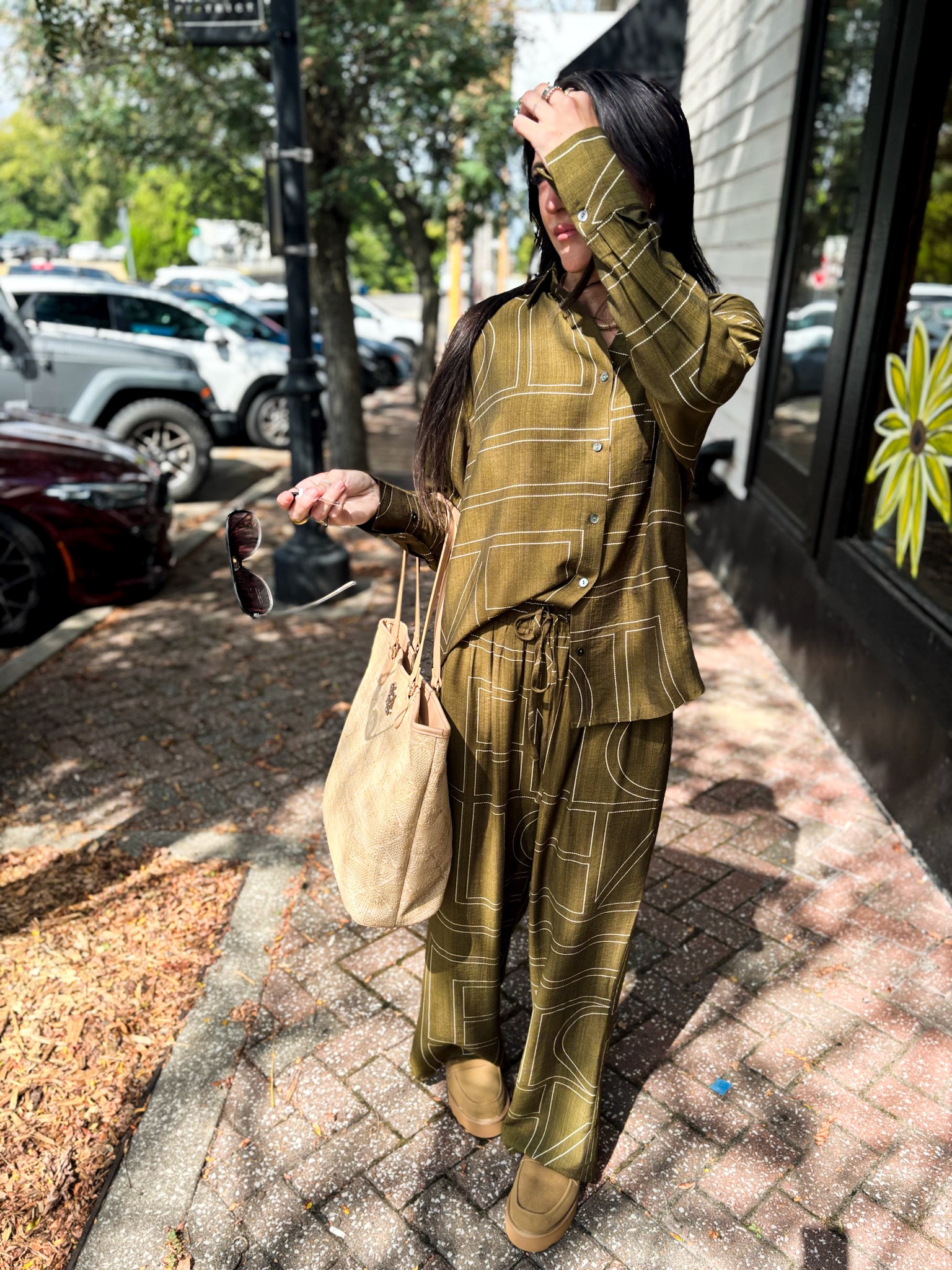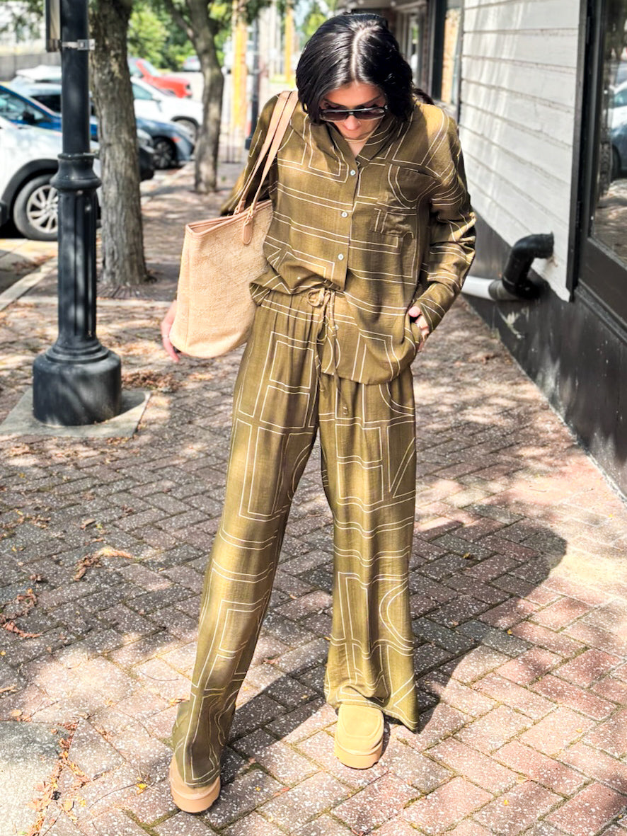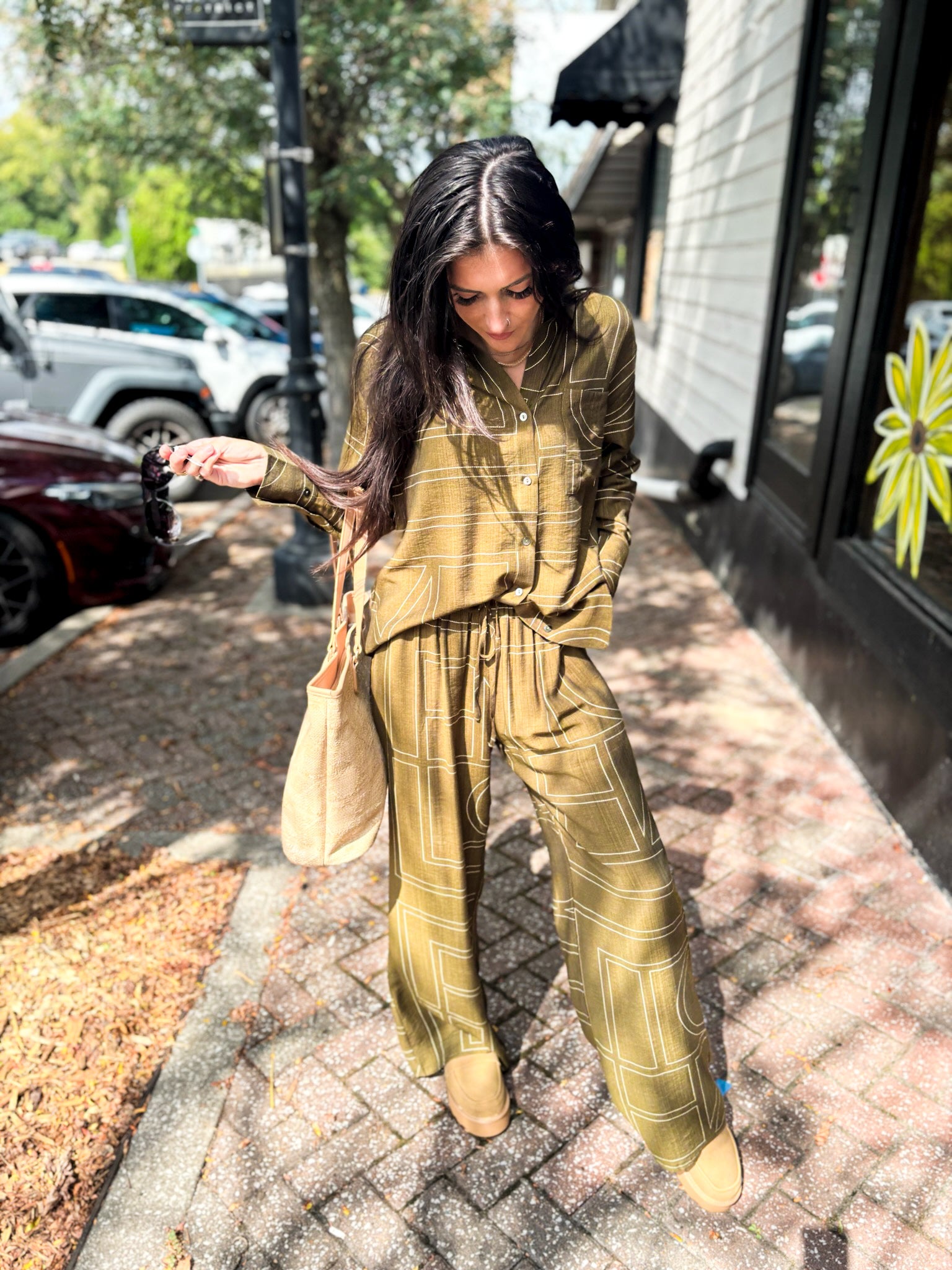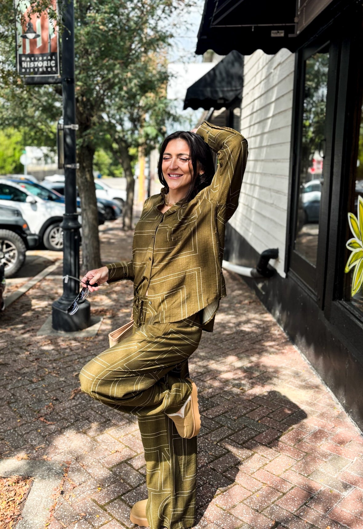 Bring effortless style and comfort together with the Modern Moment Olive Pants. Featuring a fun abstract pattern and a breezy wide-leg cut, these pants move with you all day long. The adjustable drawstring and elastic waistband let you find your perfect fit, making them a playful essential for any casual outing or relaxed day at home. Lined. Matching top available separately.