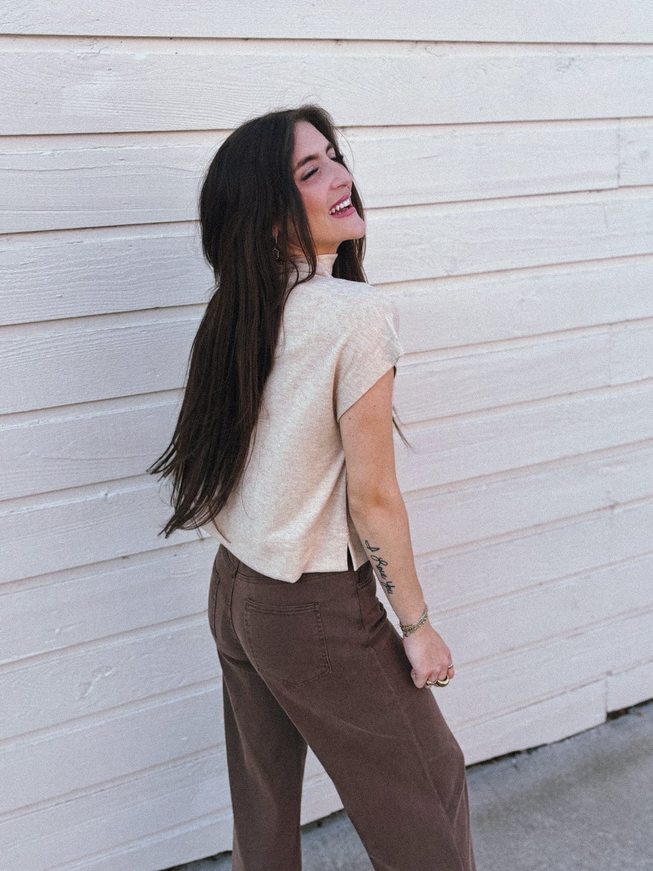Wrap yourself in cozy charm with the Oatmeal Mock Neck pullover. This solid knit top features a snug and comfortable mock neck that adds a touch of playful sophistication to your look. Perfect for layering or wearing solo, it’s your go-to for effortless style and comfort all day long.