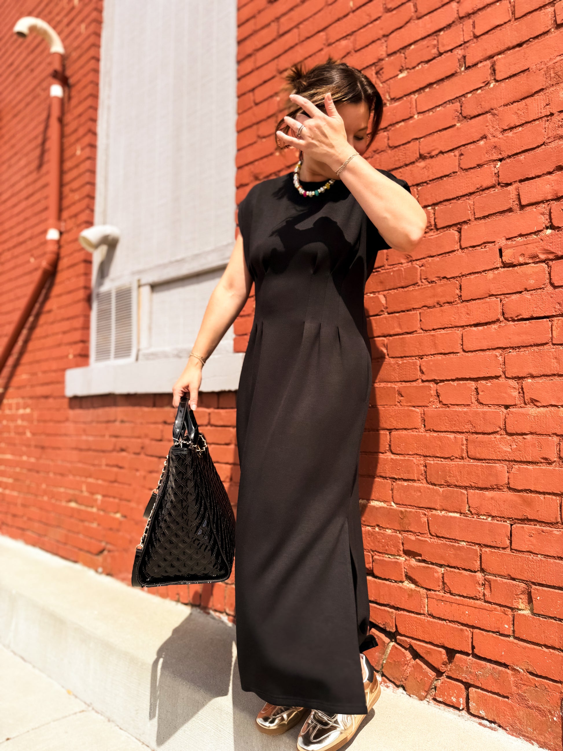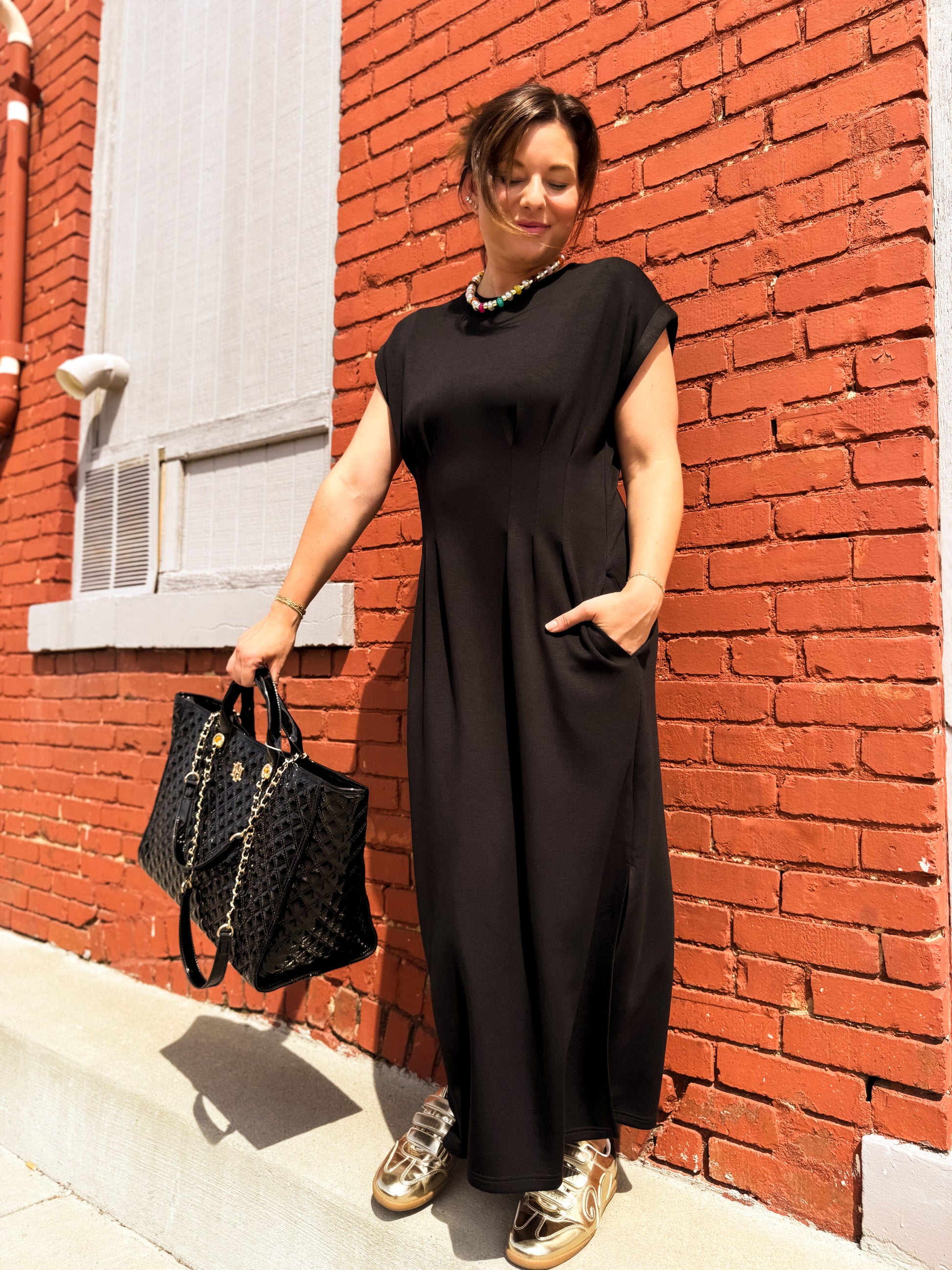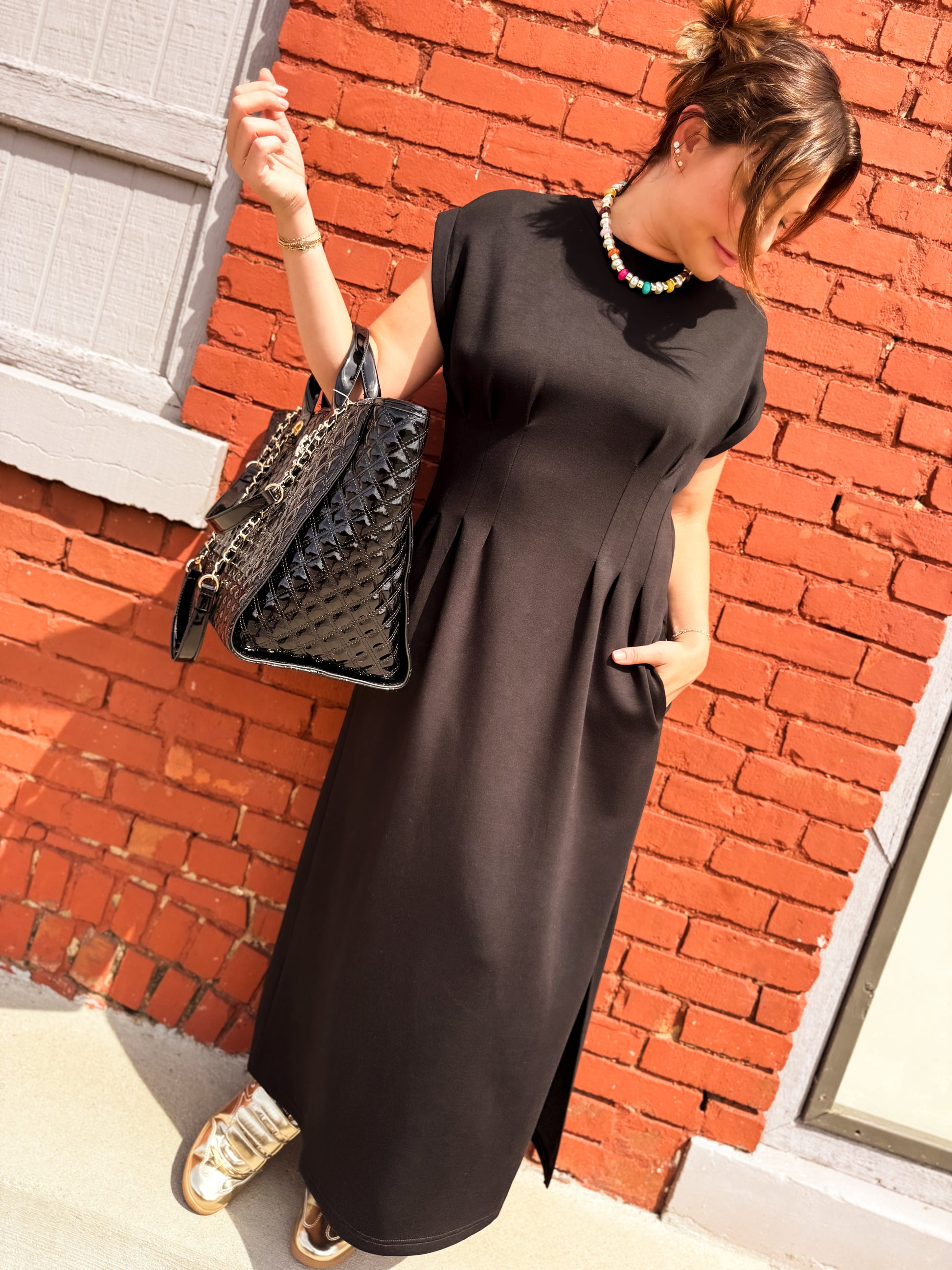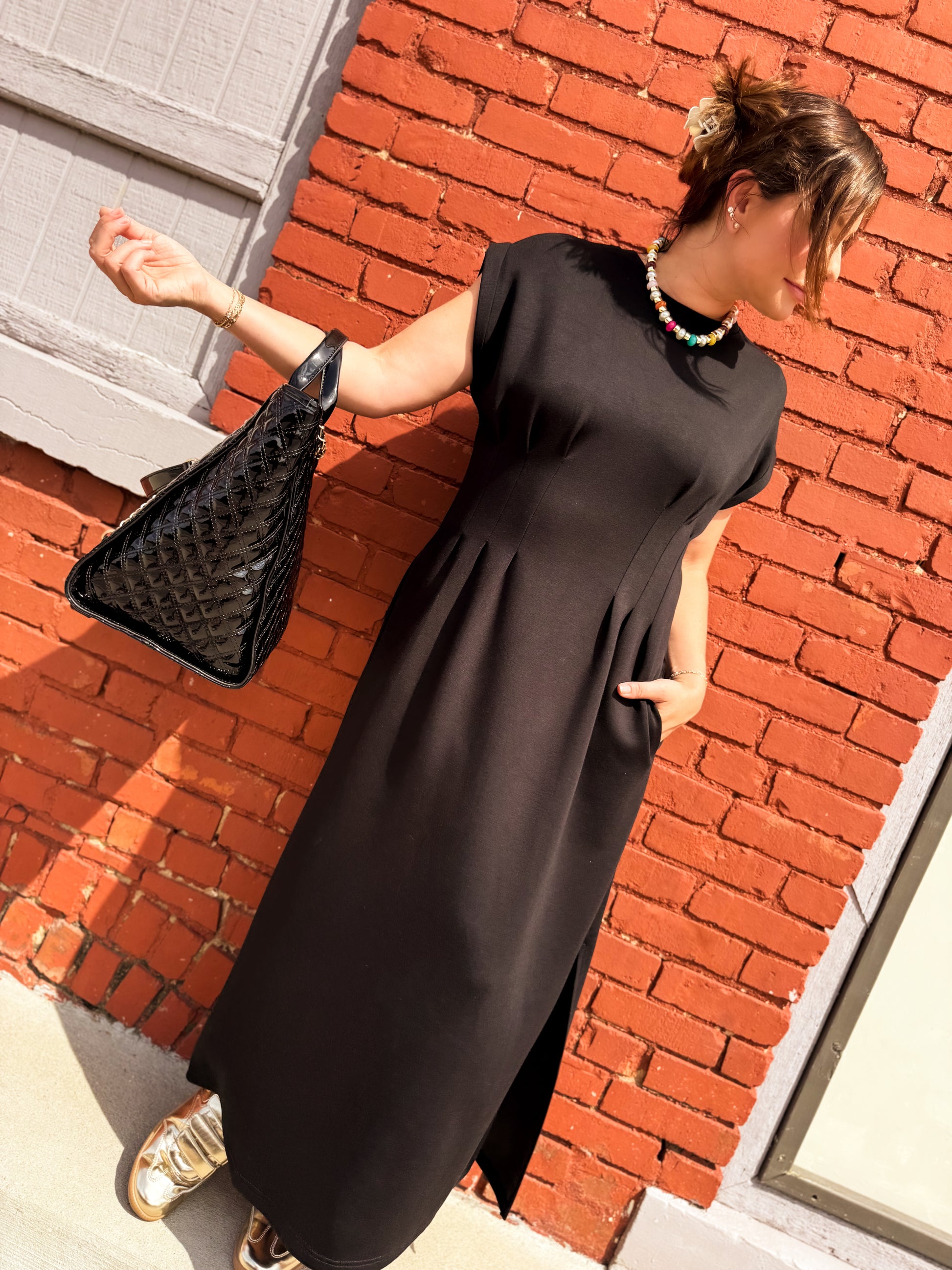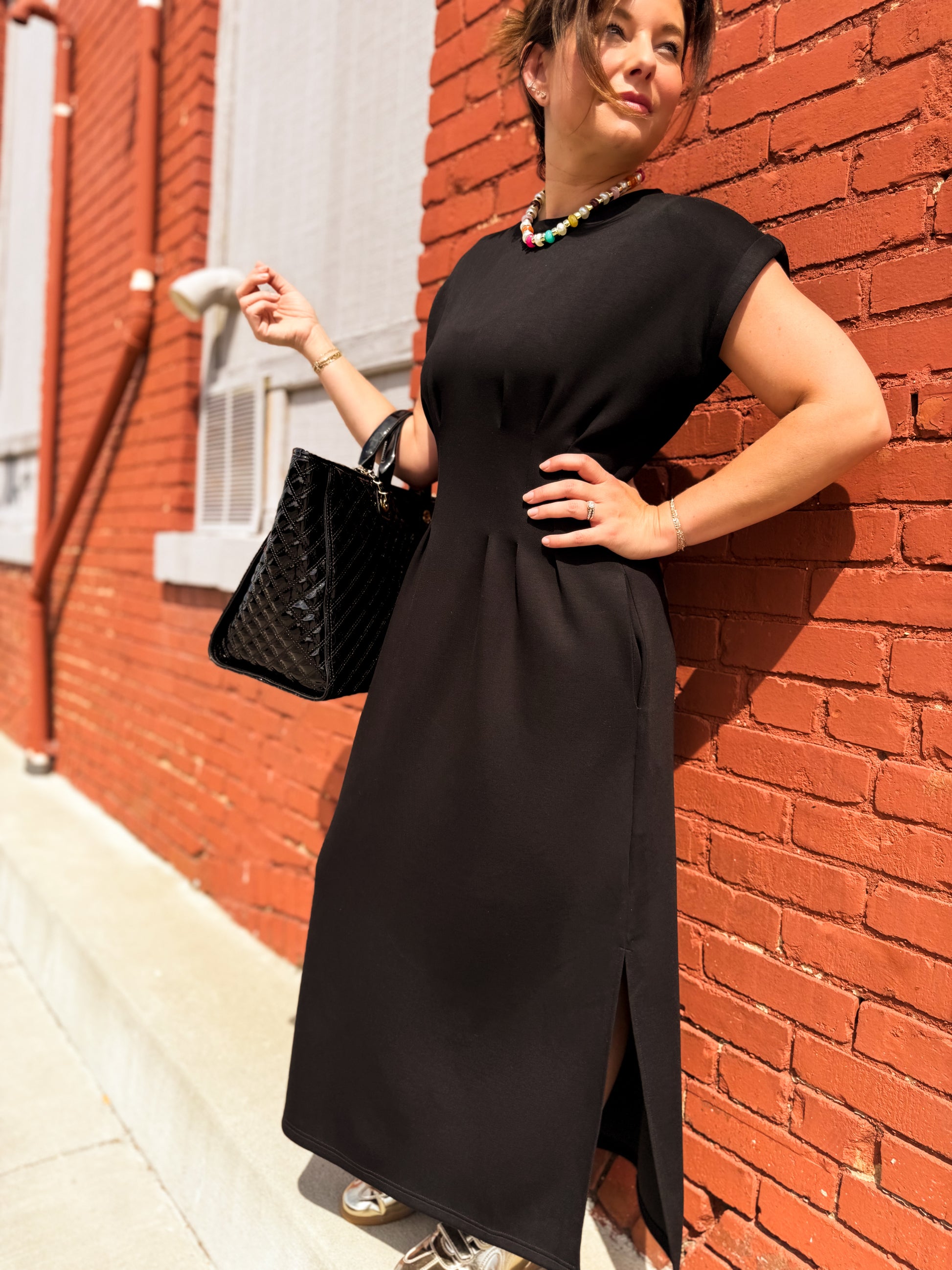 Step into effortless charm with the One Hit Wonder Midi Dress. This playful knit dress features a solid cap sleeve design and a flattering round neckline. Delight in the gentle pleats on the front and back bodice that add a flirty touch, while the side pockets keep your essentials close. Lightweight and non-sheer, it’s perfect for staying cool and comfortable all day long. Unlined for ease, this dress is your go-to for playful sophistication wherever you go.