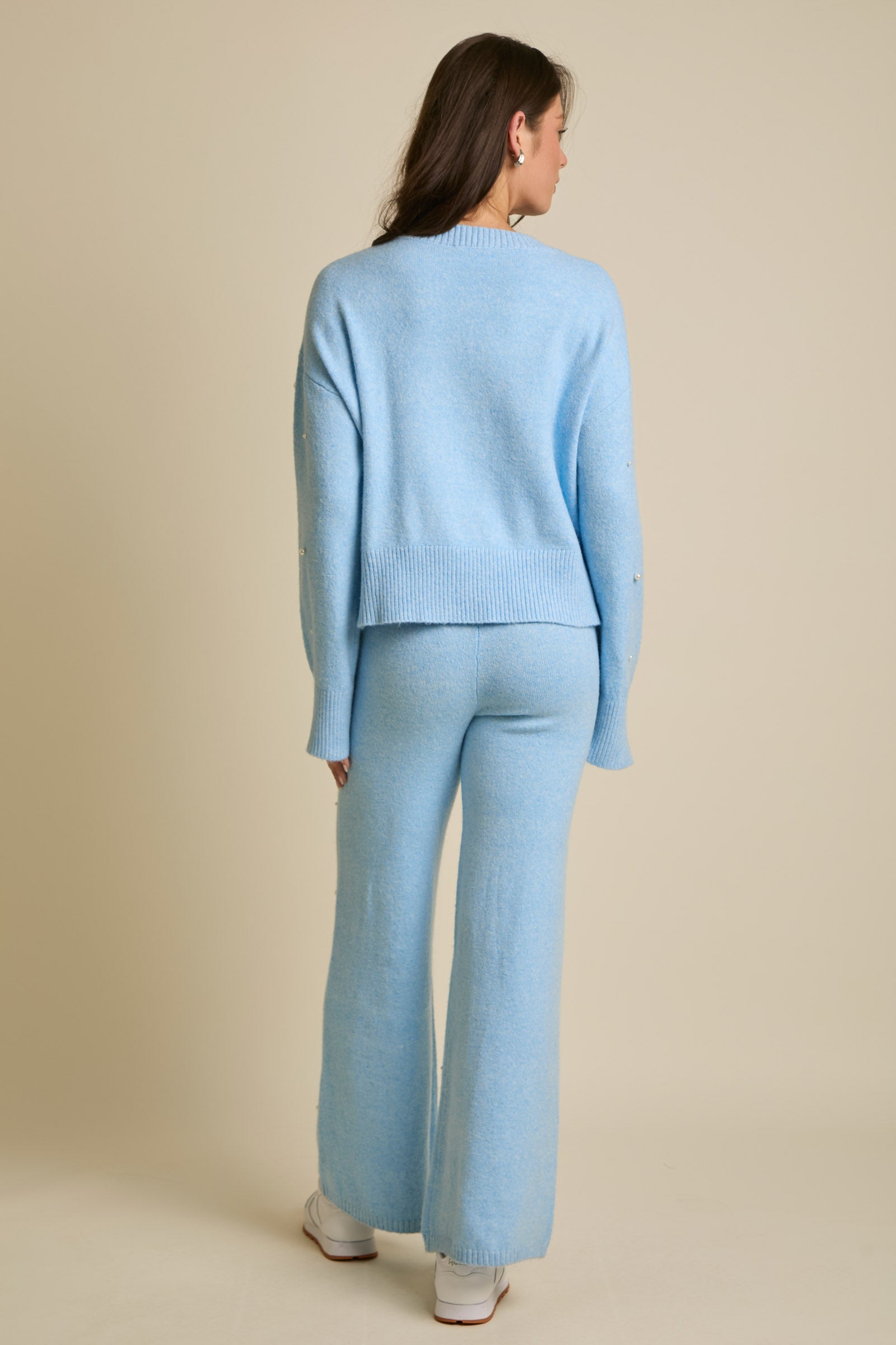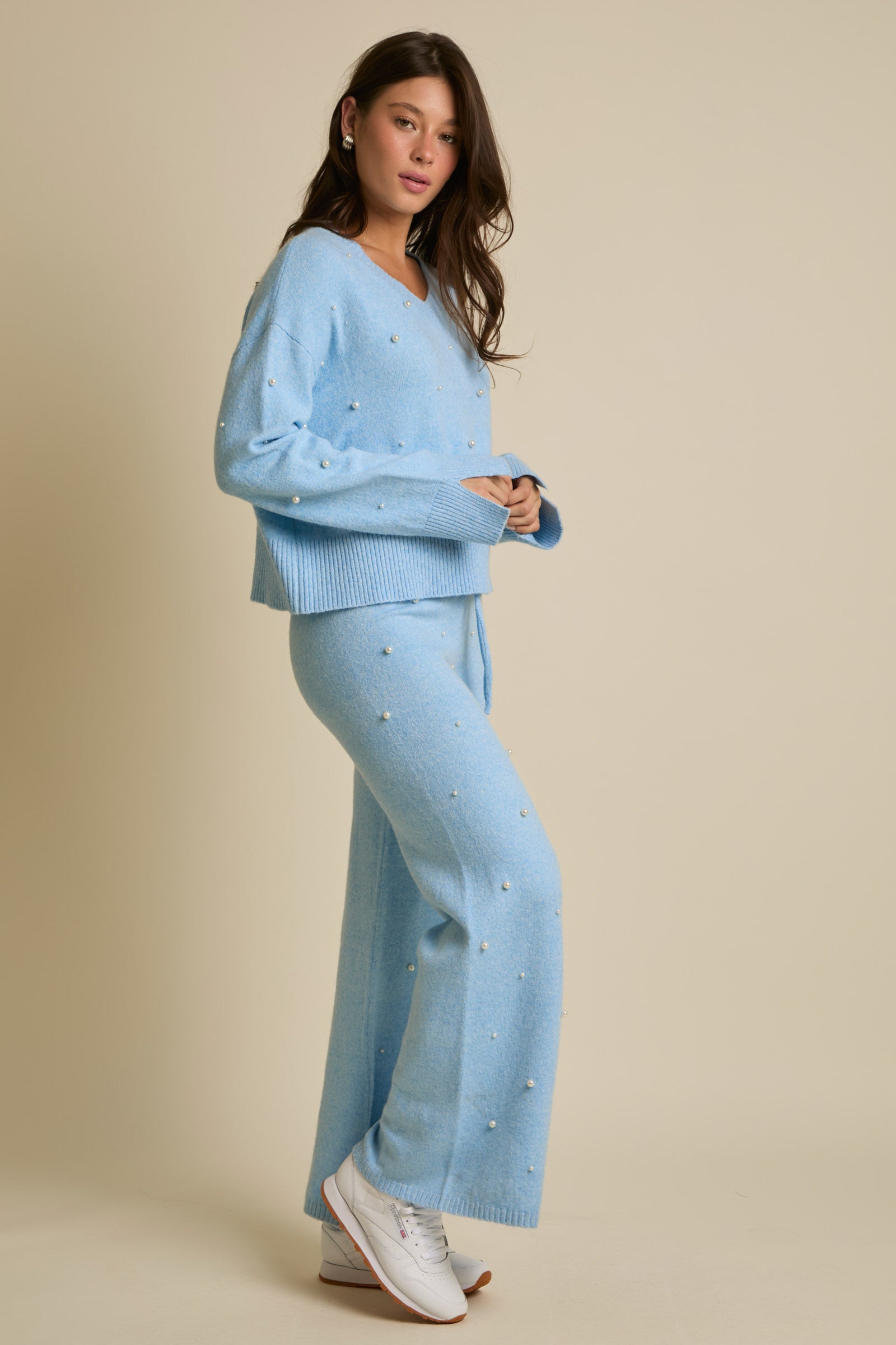 Be the epitome of effortless elegance in our Pretty in Pearls Lounge Set. This sky blue knit ensemble features a cozy sweater top and matching pants, complete with an elastic waistband and convenient side pockets. And let’s not forget the charming pearls on the front for a touch of sophistication. Get ready to lounge in style!