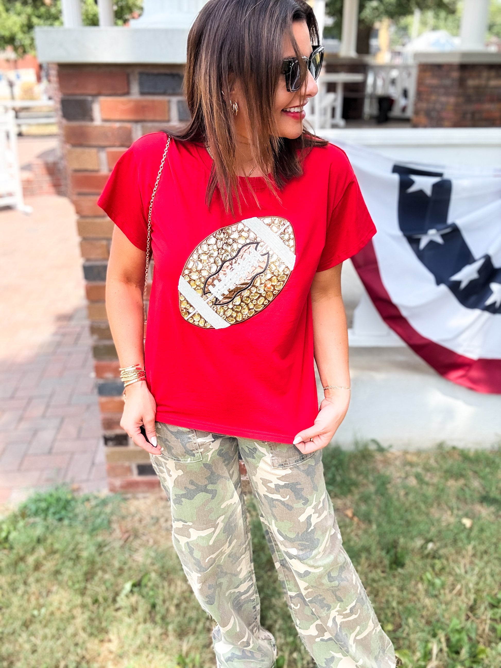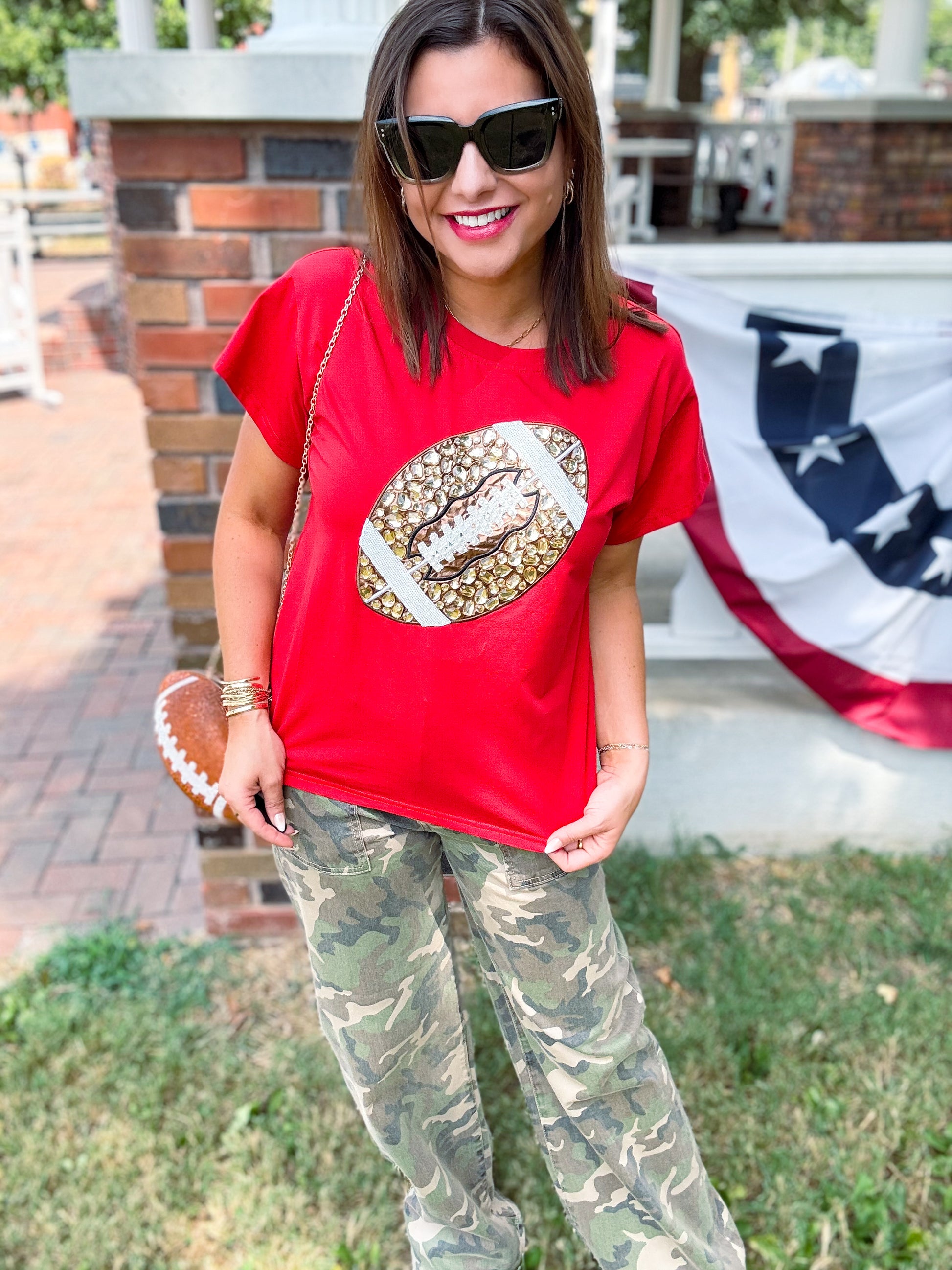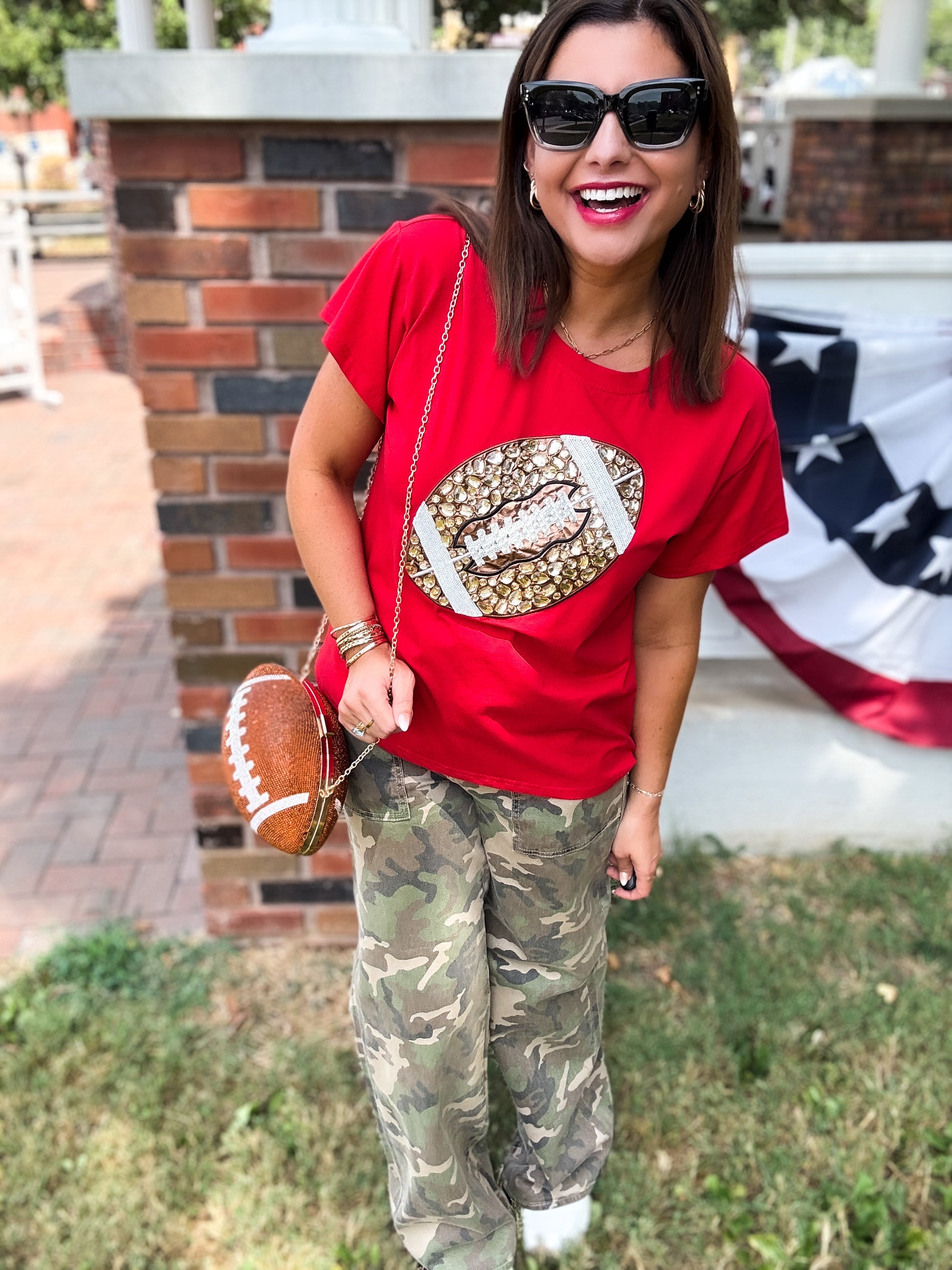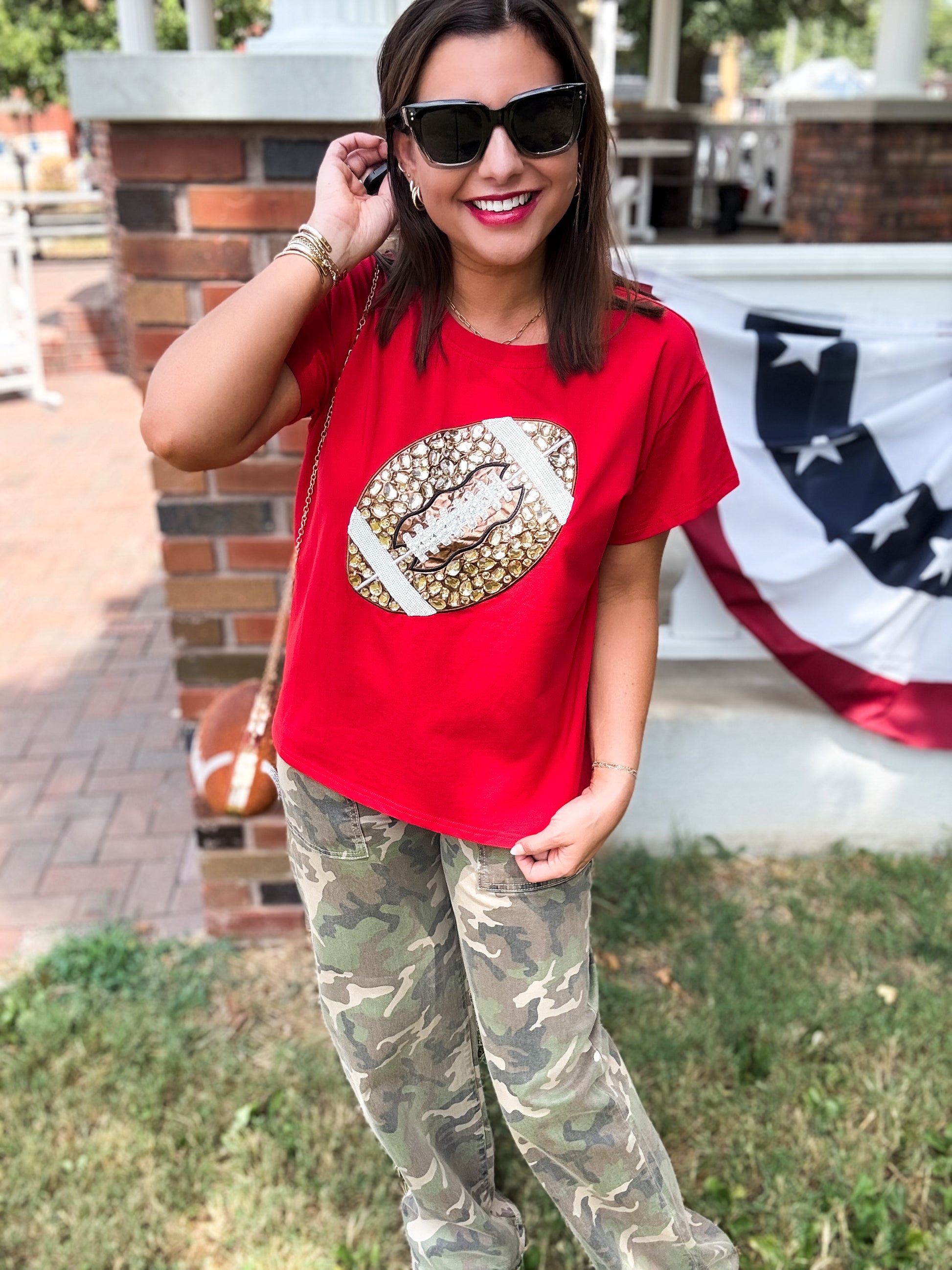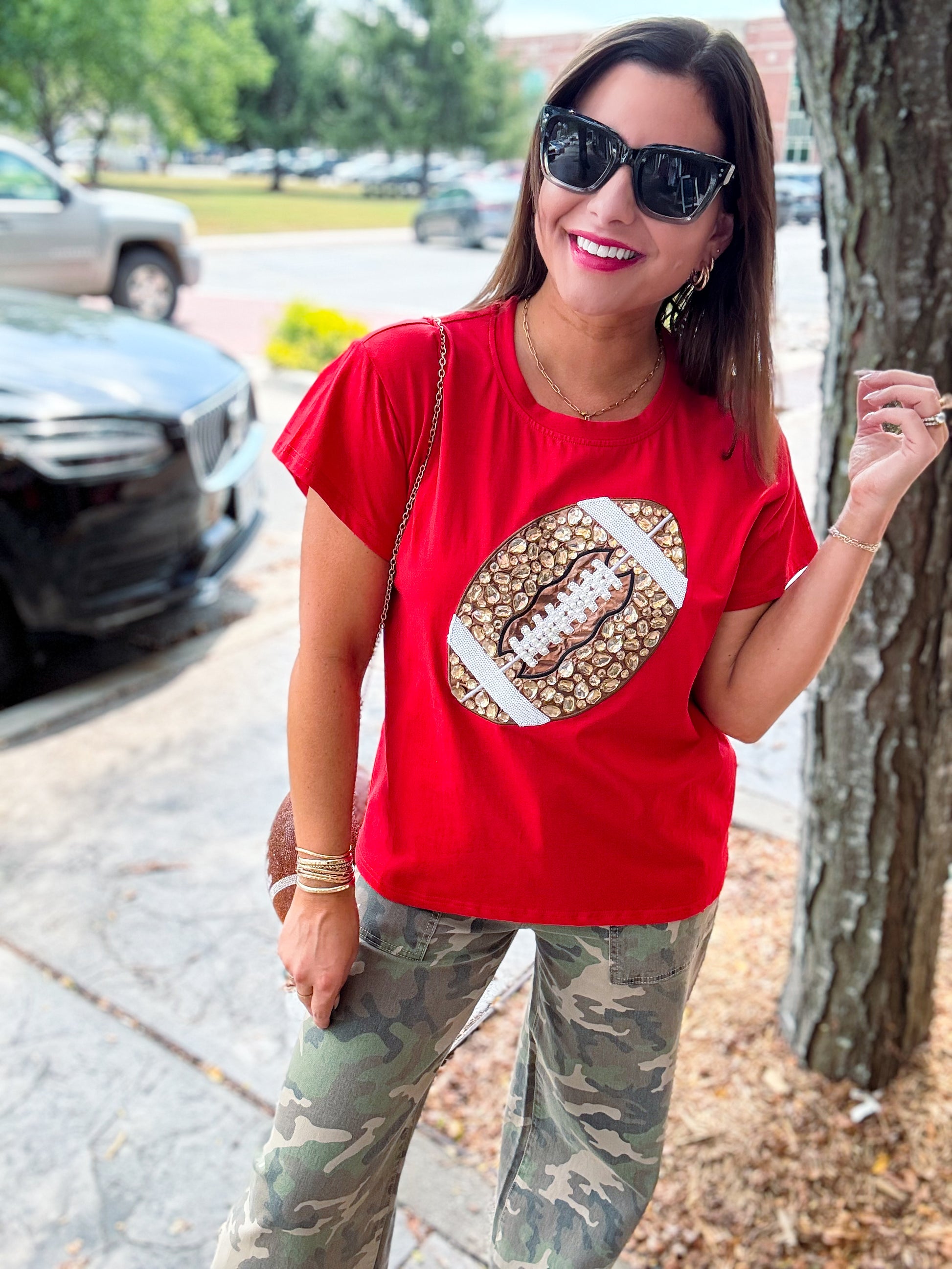 Show off your team spirit with a dazzling twist in the Queen of Sparkles Red Jeweled Football Tee. This playful tee combines sporty vibes with sparkling jewels, making game day your time to shine. Perfect for fans who want to stand out in the crowd while staying comfy and stylish.