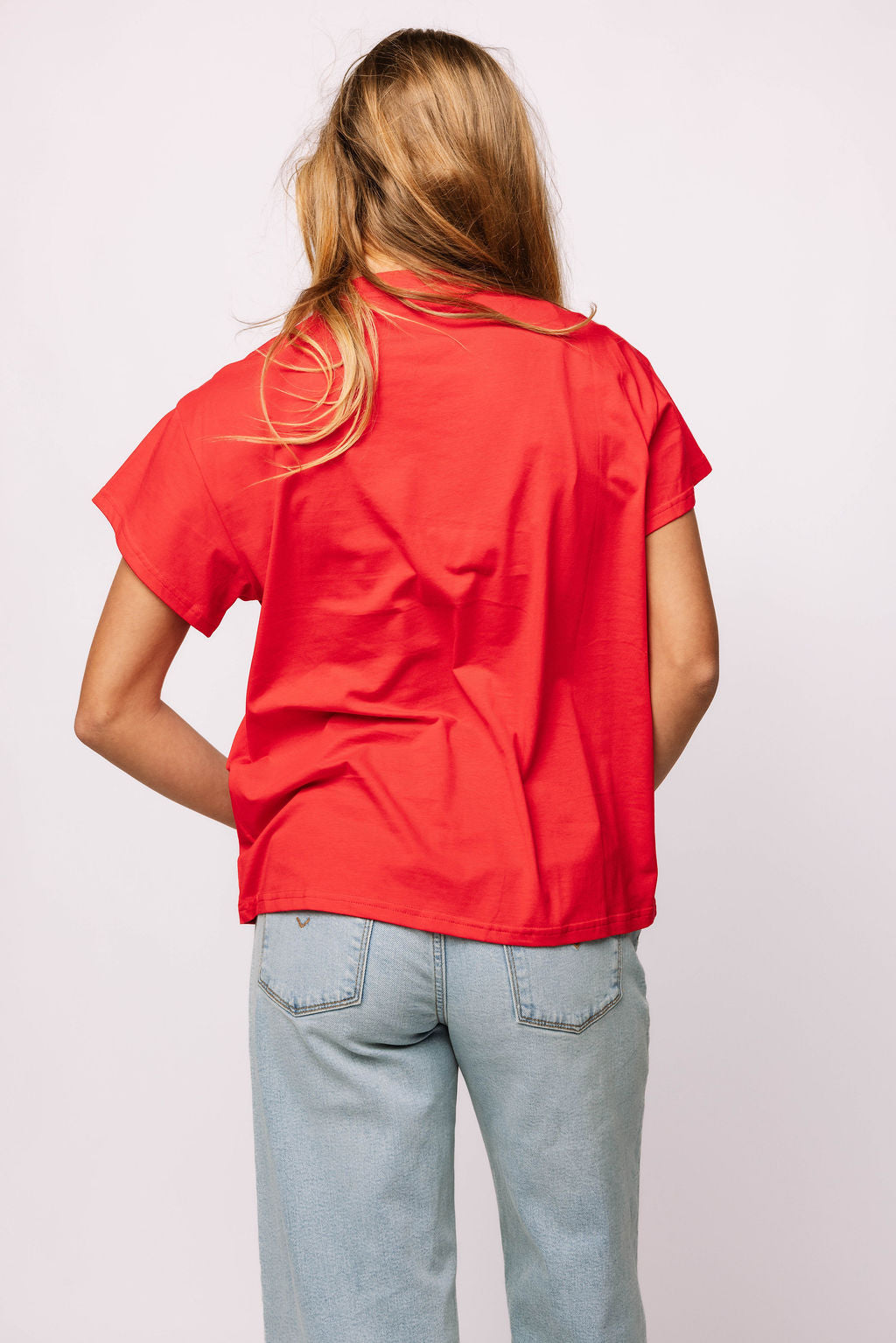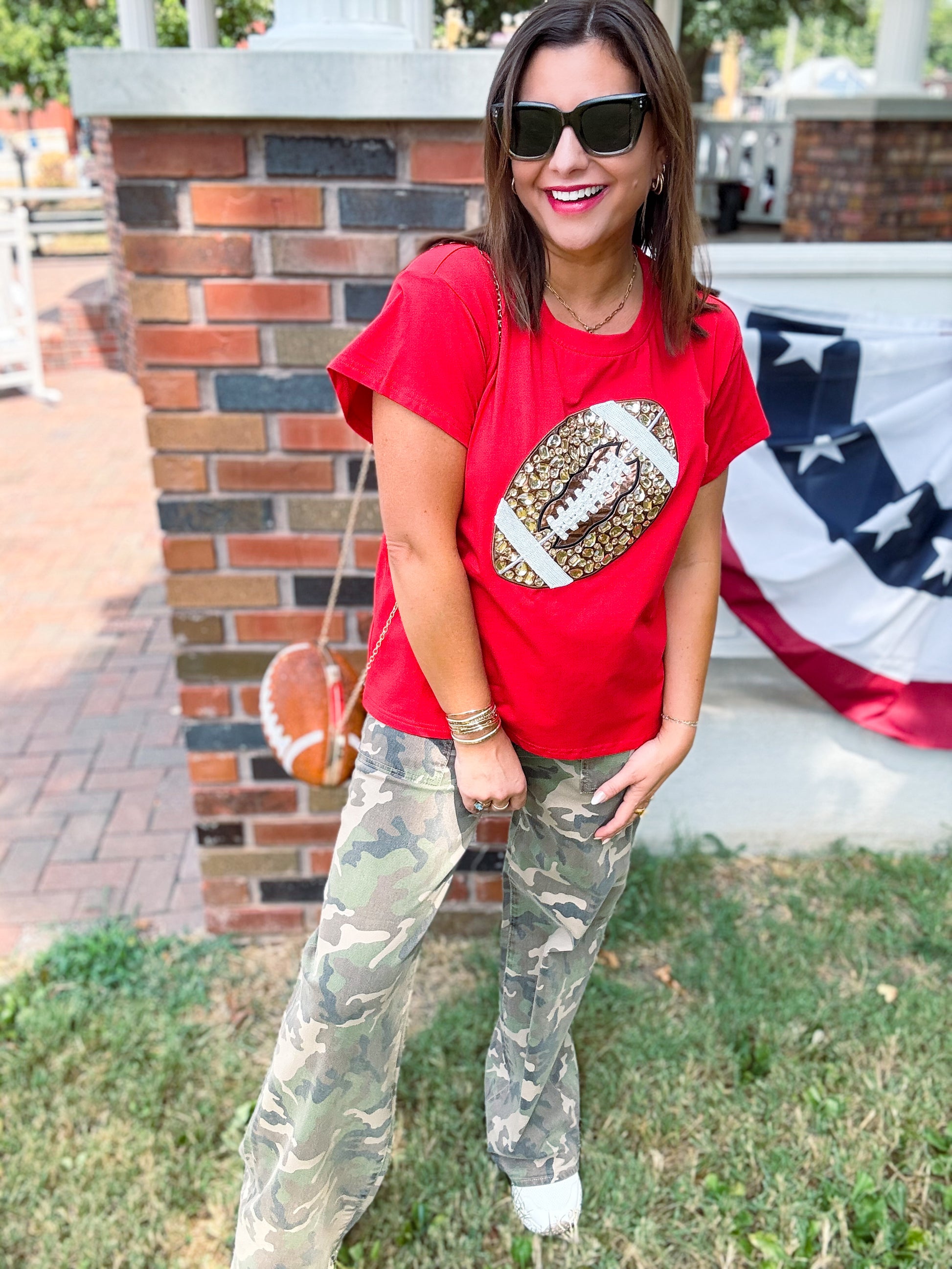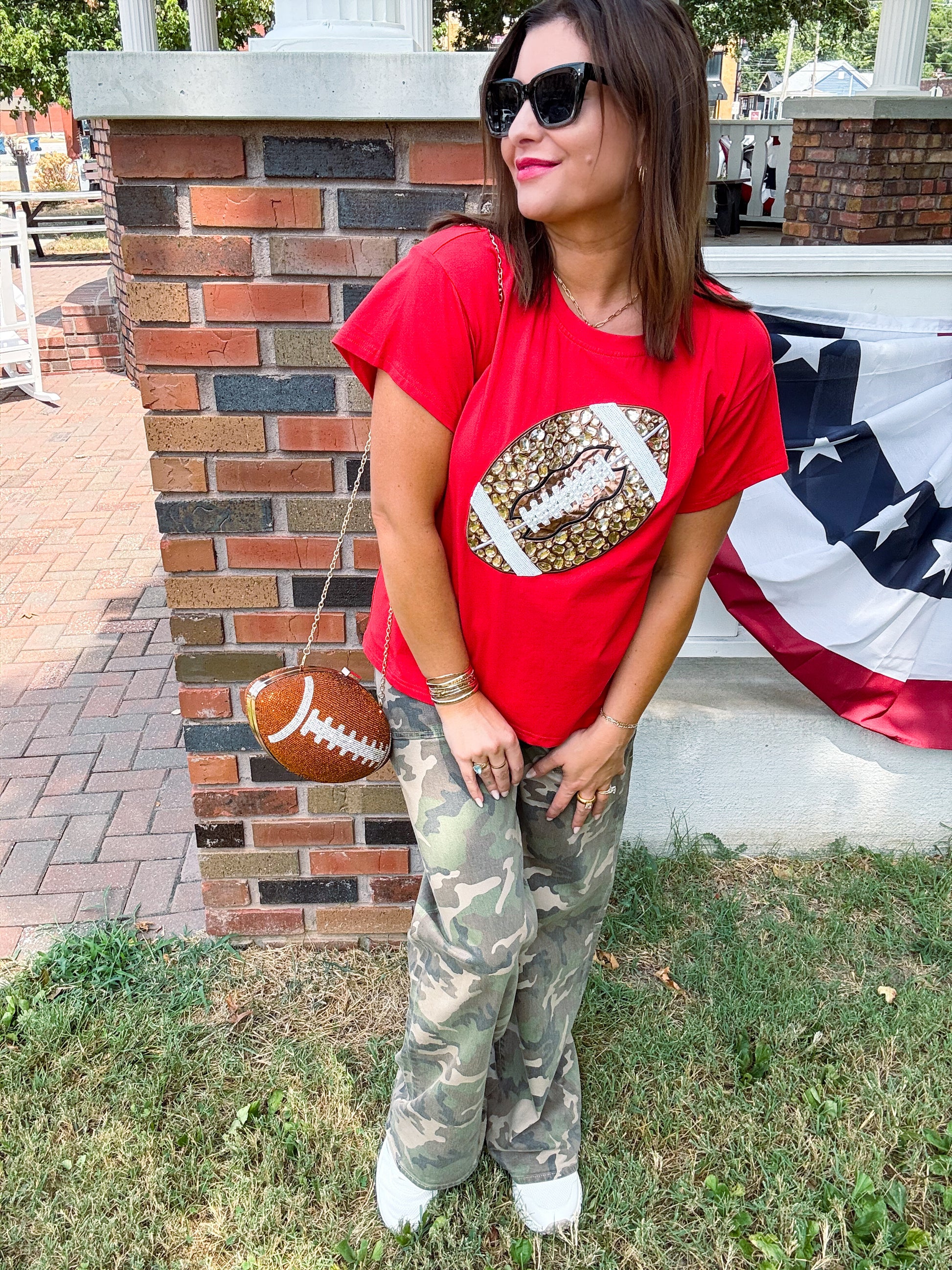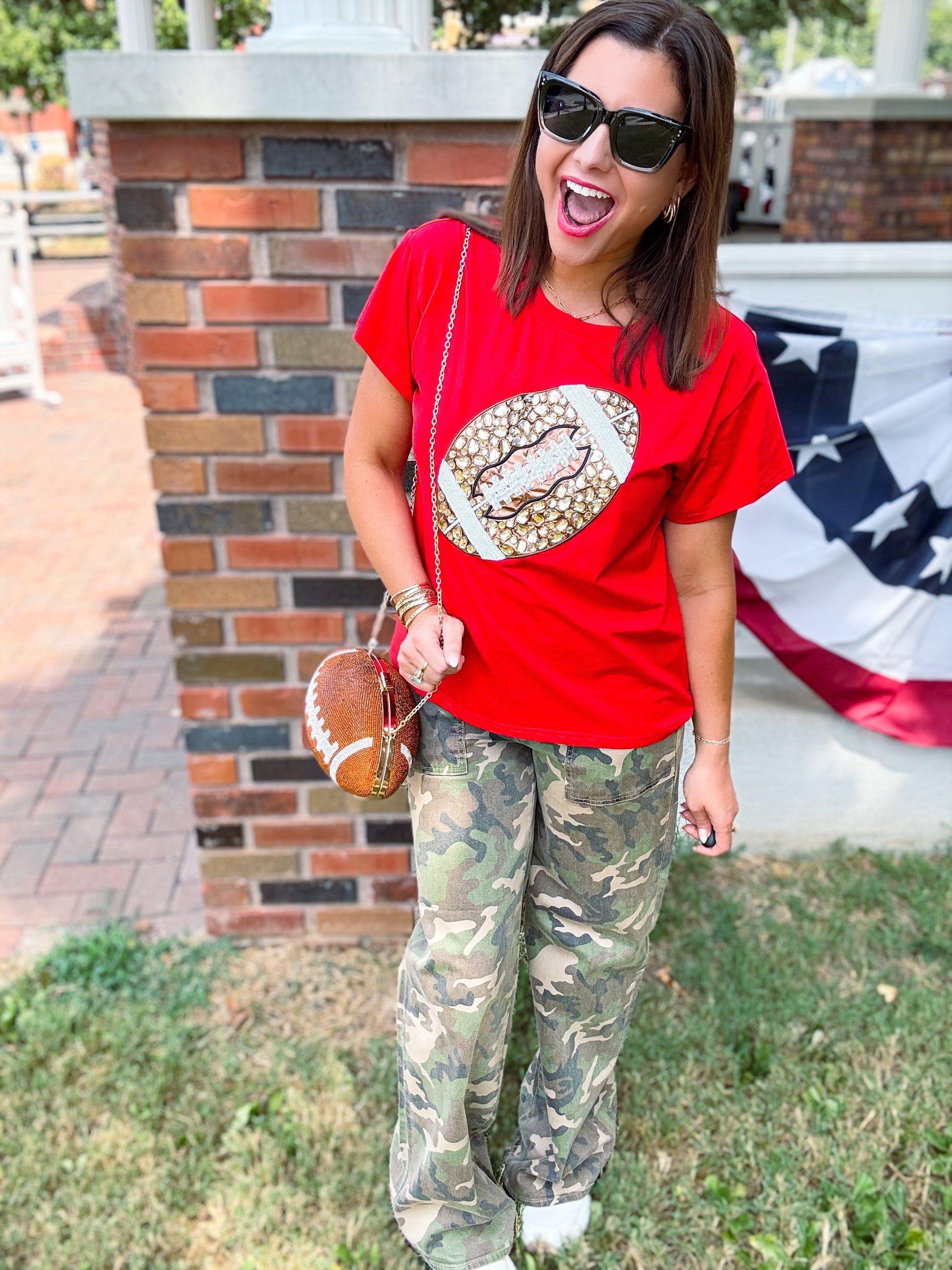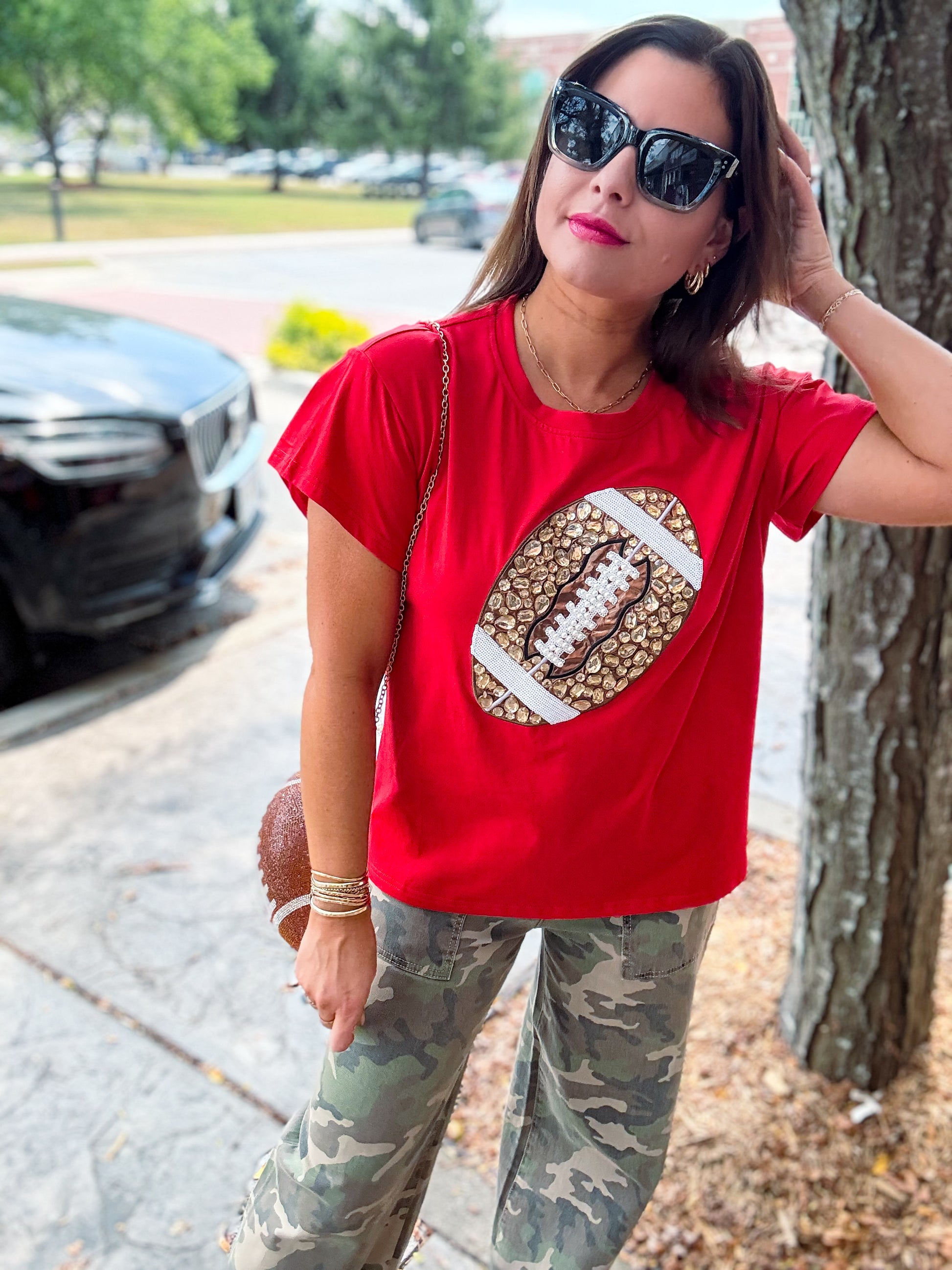 Show off your team spirit with a dazzling twist in the Queen of Sparkles Red Jeweled Football Tee. This playful tee combines sporty vibes with sparkling jewels, making game day your time to shine. Perfect for fans who want to stand out in the crowd while staying comfy and stylish.