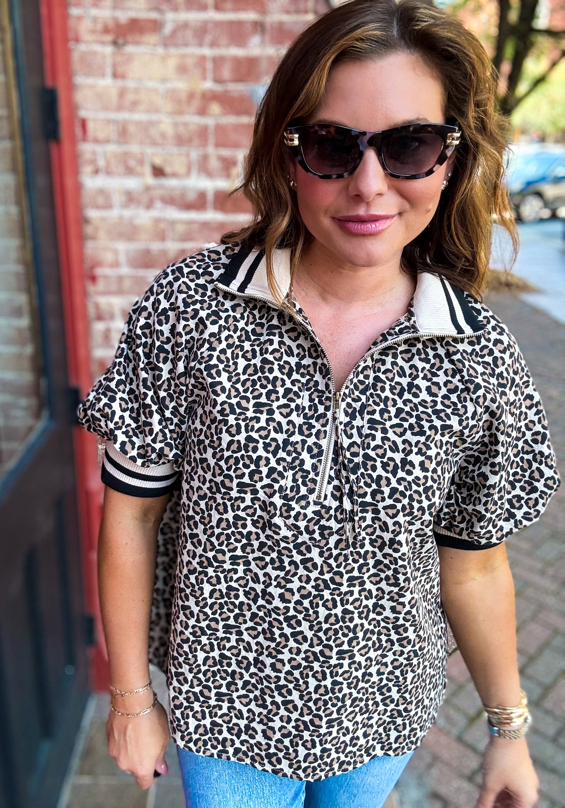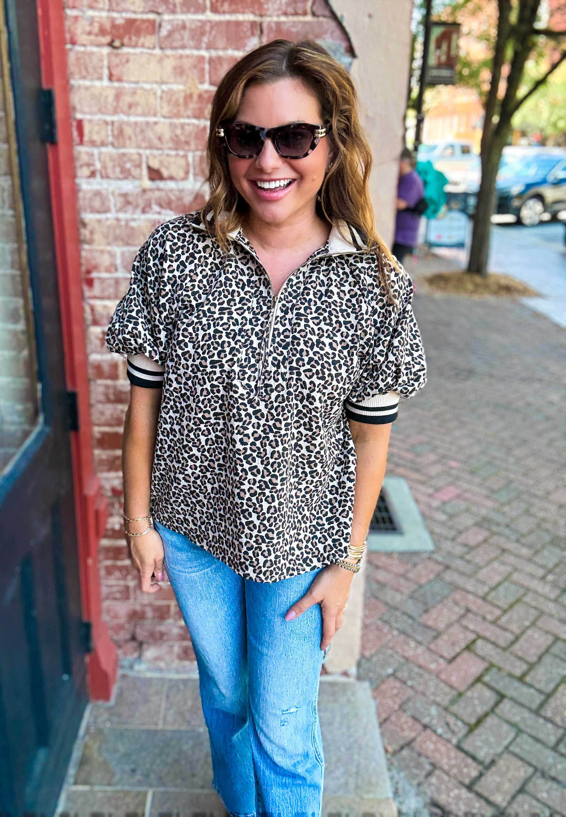 Add a wild twist to your wardrobe with the Quinn Leopard Blouse! This playful top features short puff sleeves and a half-zip front, perfectly paired with a neutral multicolor band collar that pops. Its bold leopard pattern brings fierce style, while the unique collar adds a fun splash. Ideal for making a statement wherever you go!