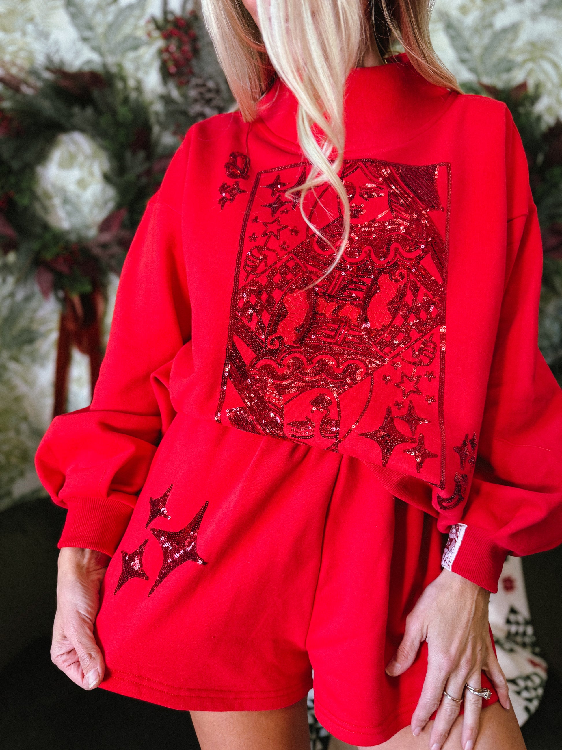 Shine bright in this bold red Queen of Sparkles sweatshirt featuring a dazzling, fully-beaded Queen of Hearts design. The mockneck cut and relaxed fit bring a cozy-yet-glam vibe, perfect for the holidays or your next girls’ night. Pair it with the matching sequin star shorts for the ultimate statement set!