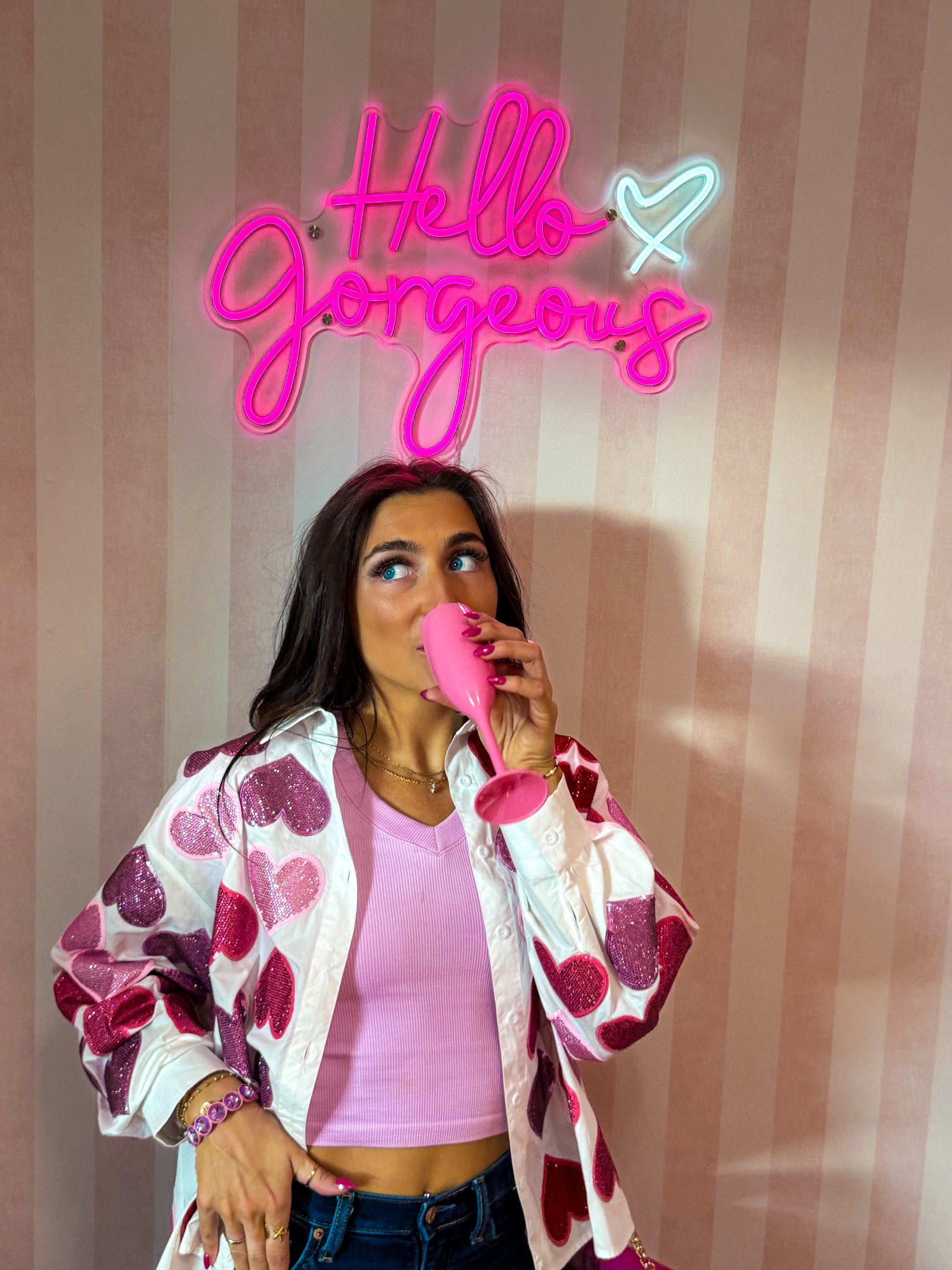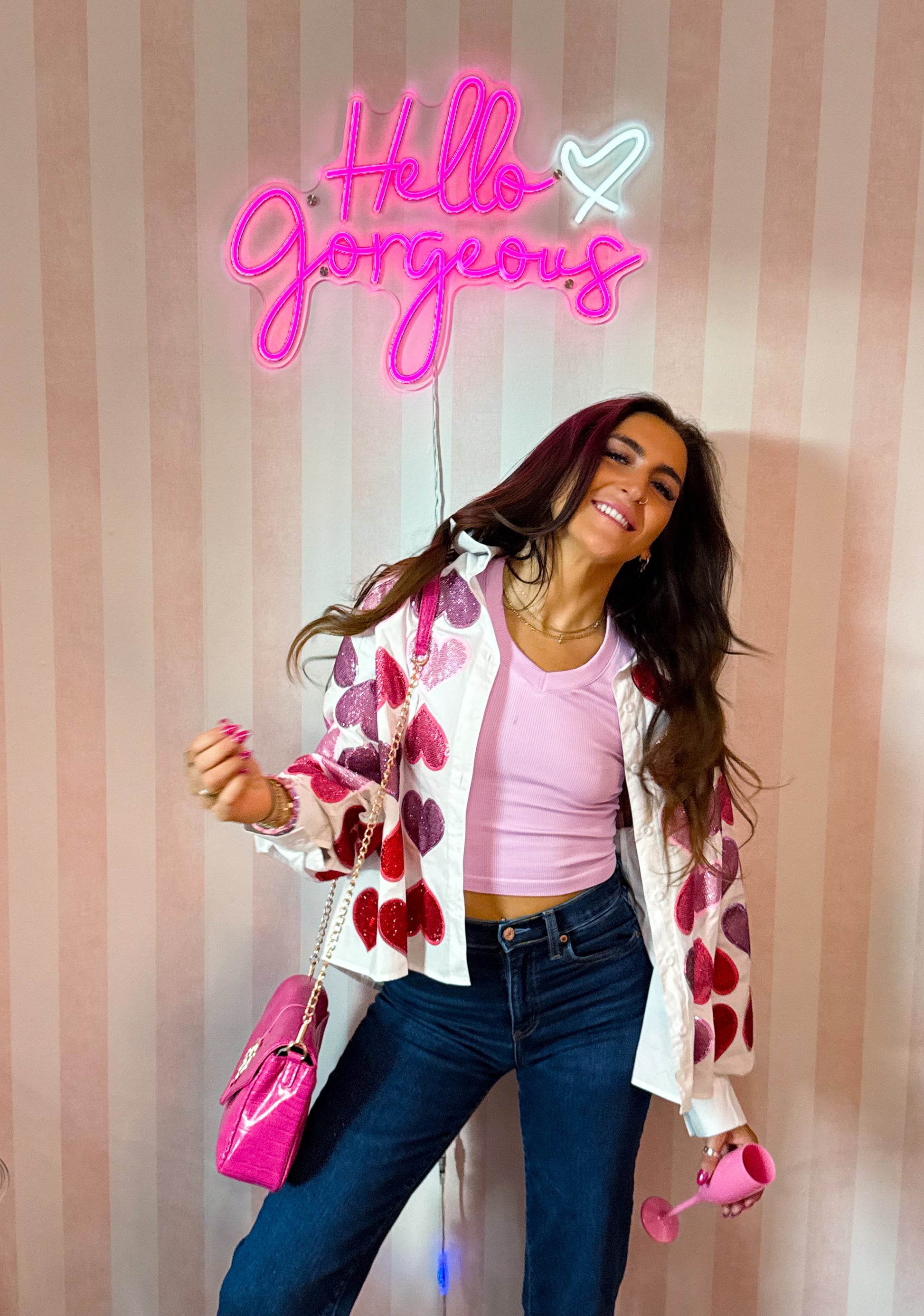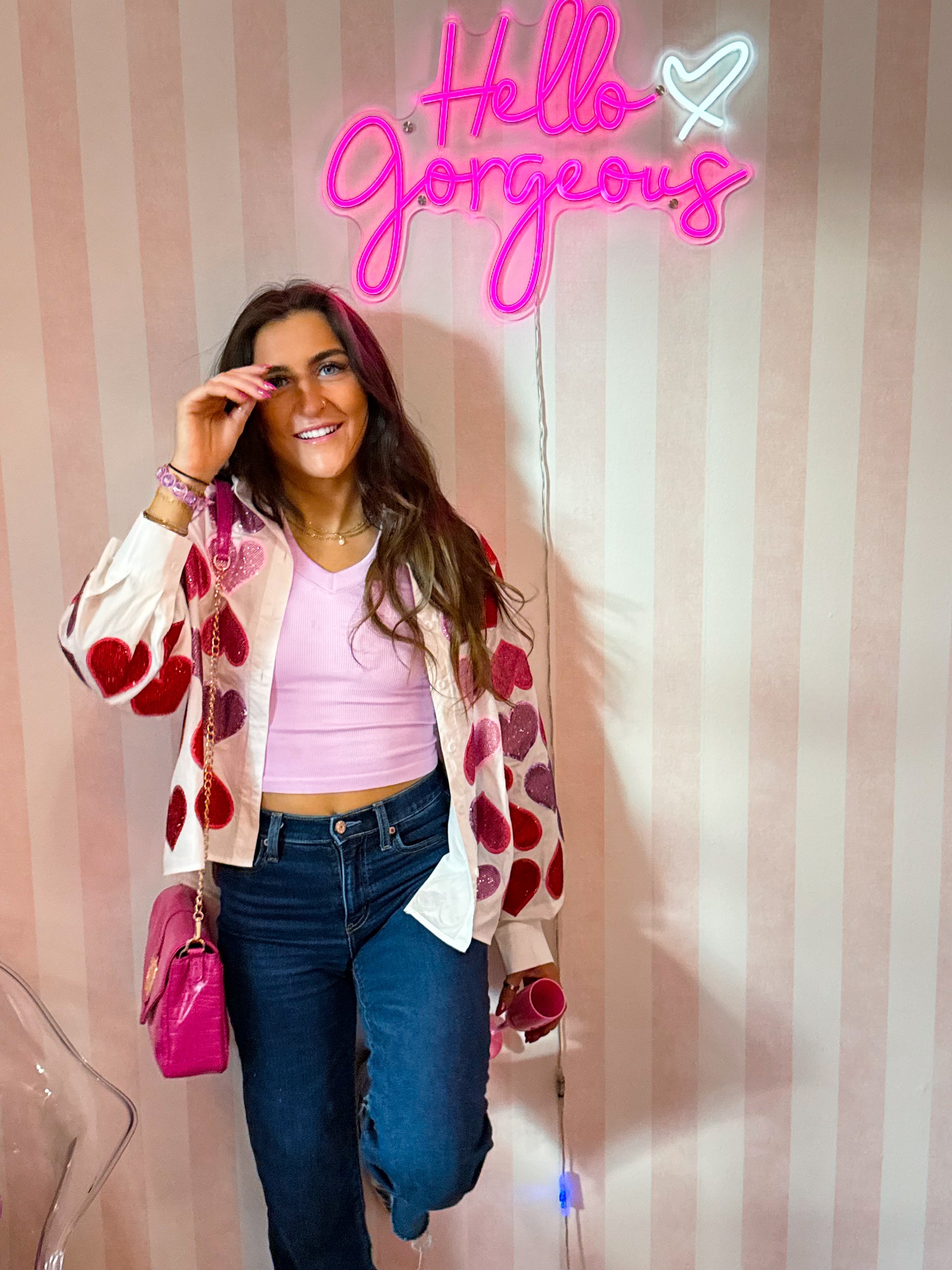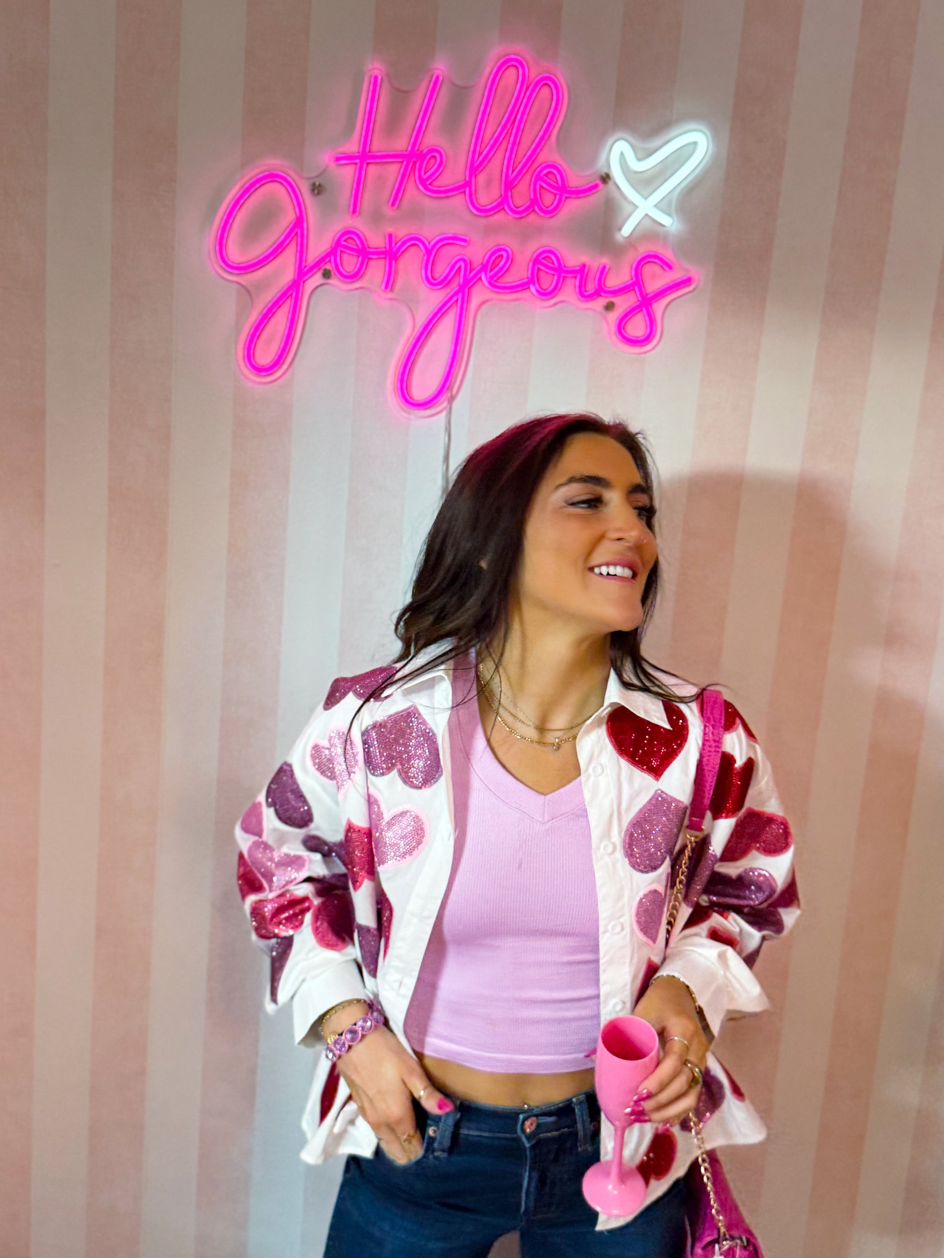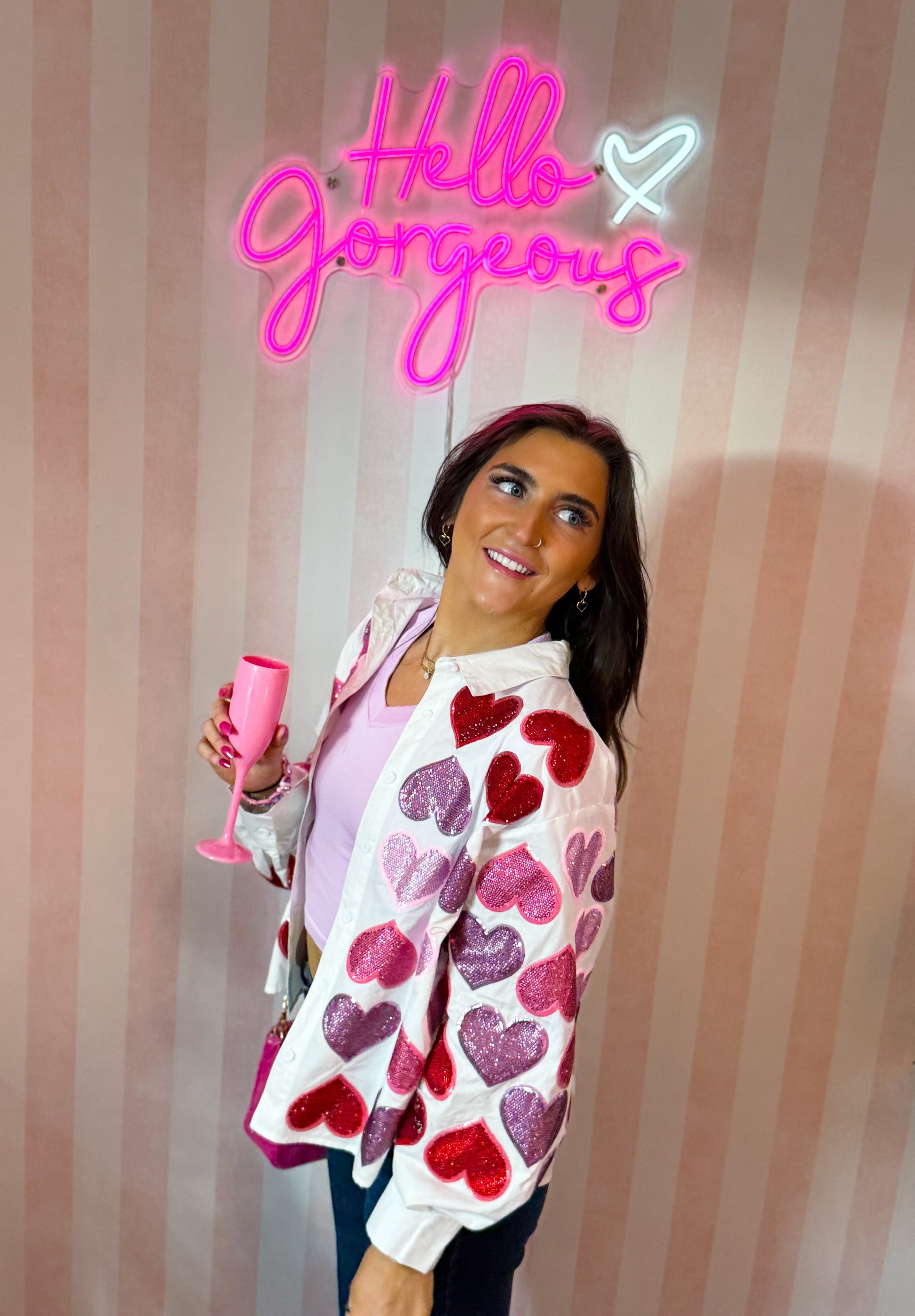 Style it buttoned up as a standout top, worn open over a tank, or layered for a fun pop of sparkle. Perfect for Valentine’s Day, Galentine’s plans, or anytime you want to add a little extra love to your look.