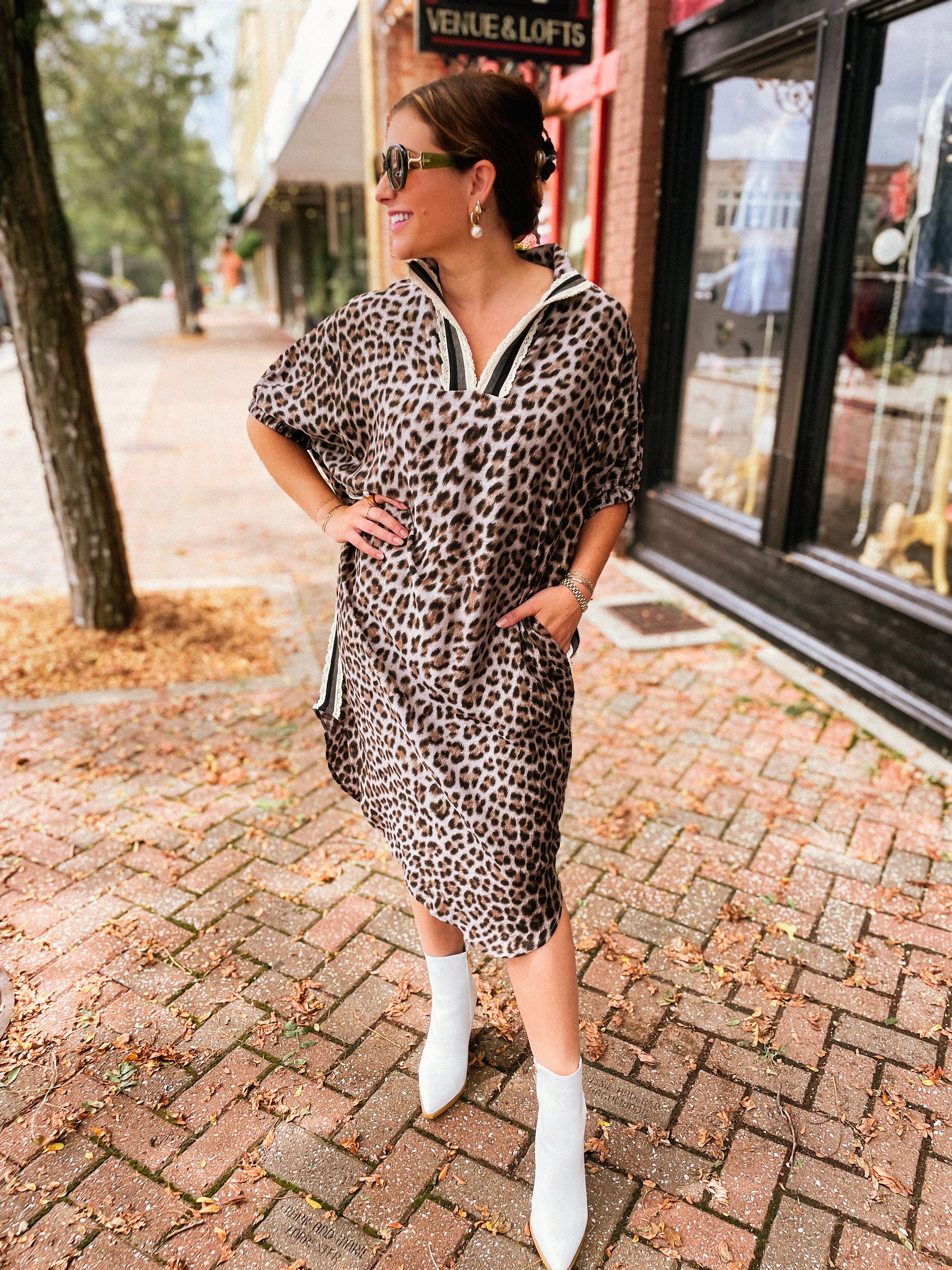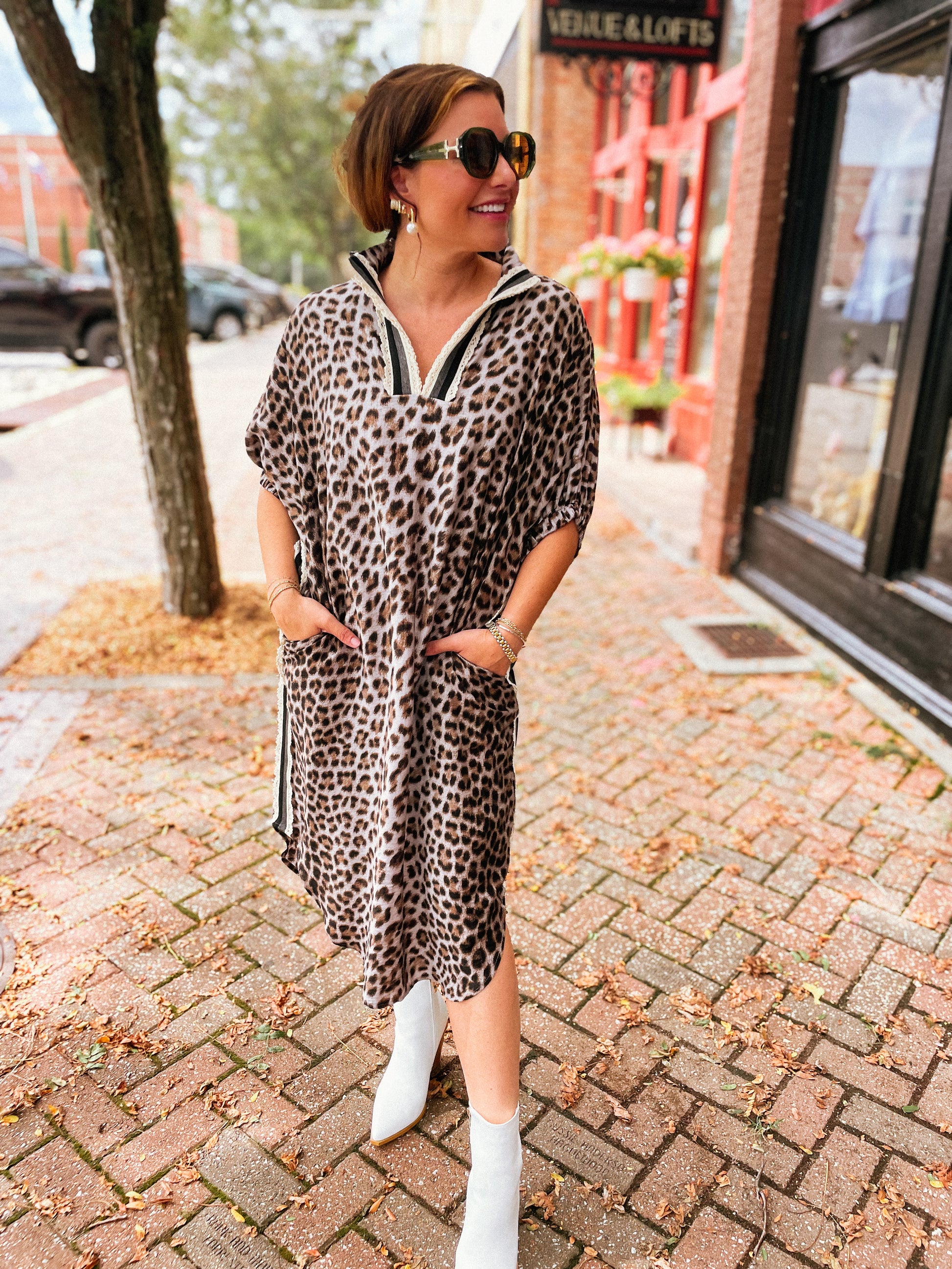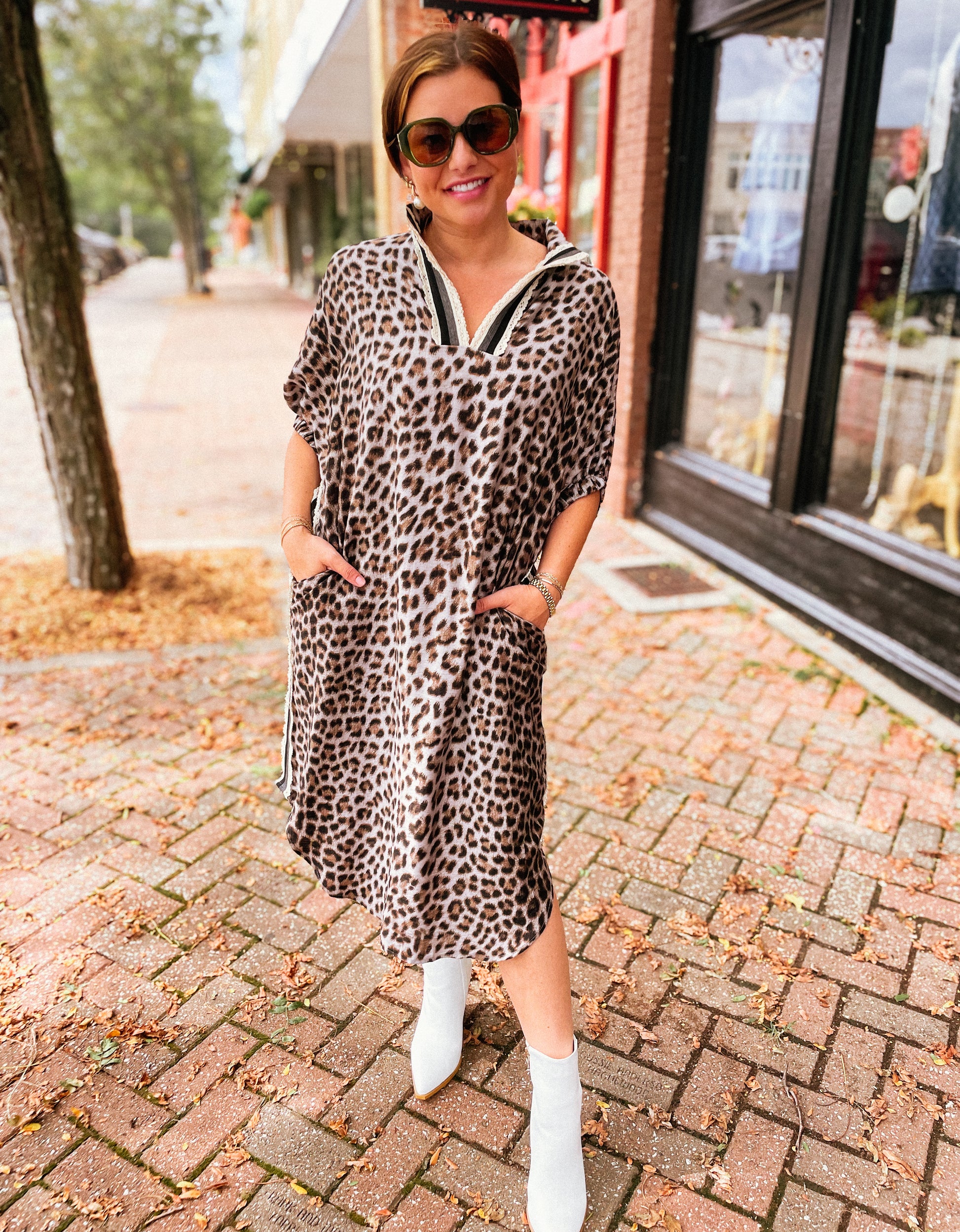 Embrace your wild side with the Roam Free Midi Dress! This playful leopard print dress features breezy ¾ dolman sleeves and a colorful ribbed band with lace edging at the split neckline for a fun, flirty touch. Practical side pockets add convenience, while the soft lining ensures comfort all day long. Perfect for roaming free in style!