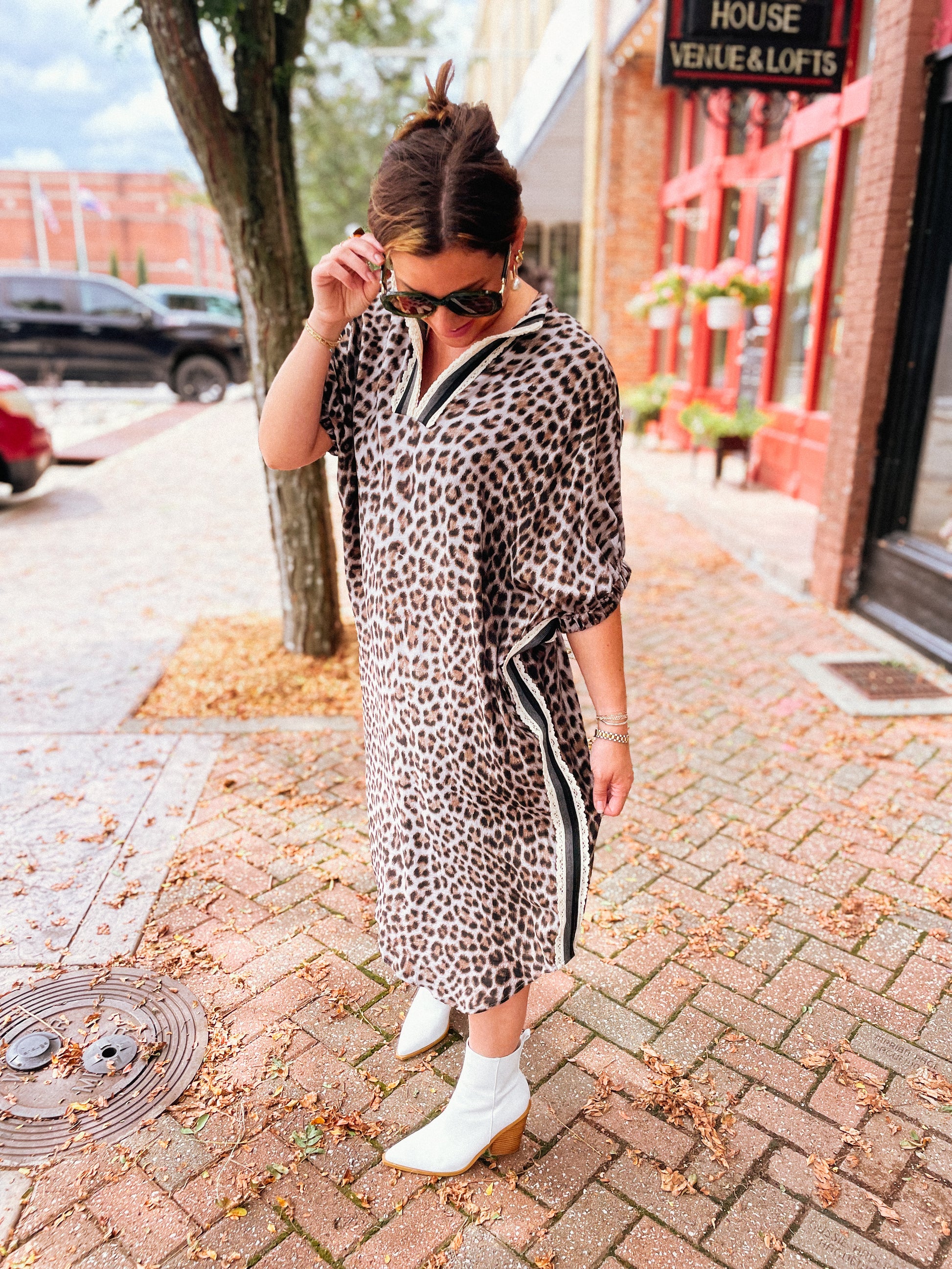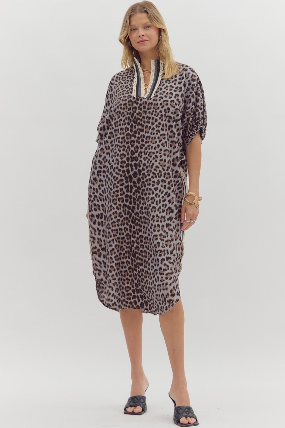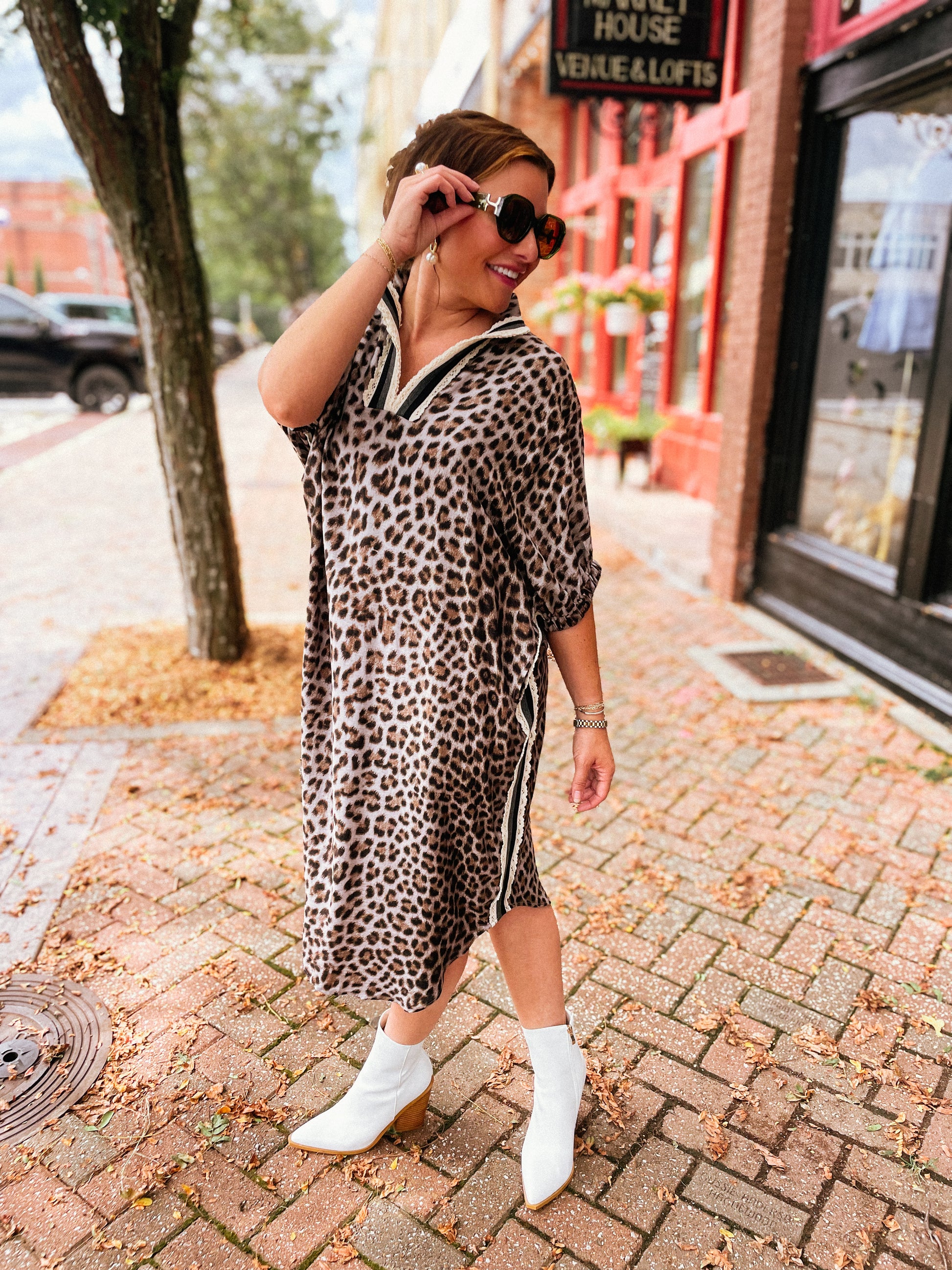 Embrace your wild side with the Roam Free Midi Dress! This playful leopard print dress features breezy ¾ dolman sleeves and a colorful ribbed band with lace edging at the split neckline for a fun, flirty touch. Practical side pockets add convenience, while the soft lining ensures comfort all day long. Perfect for roaming free in style!