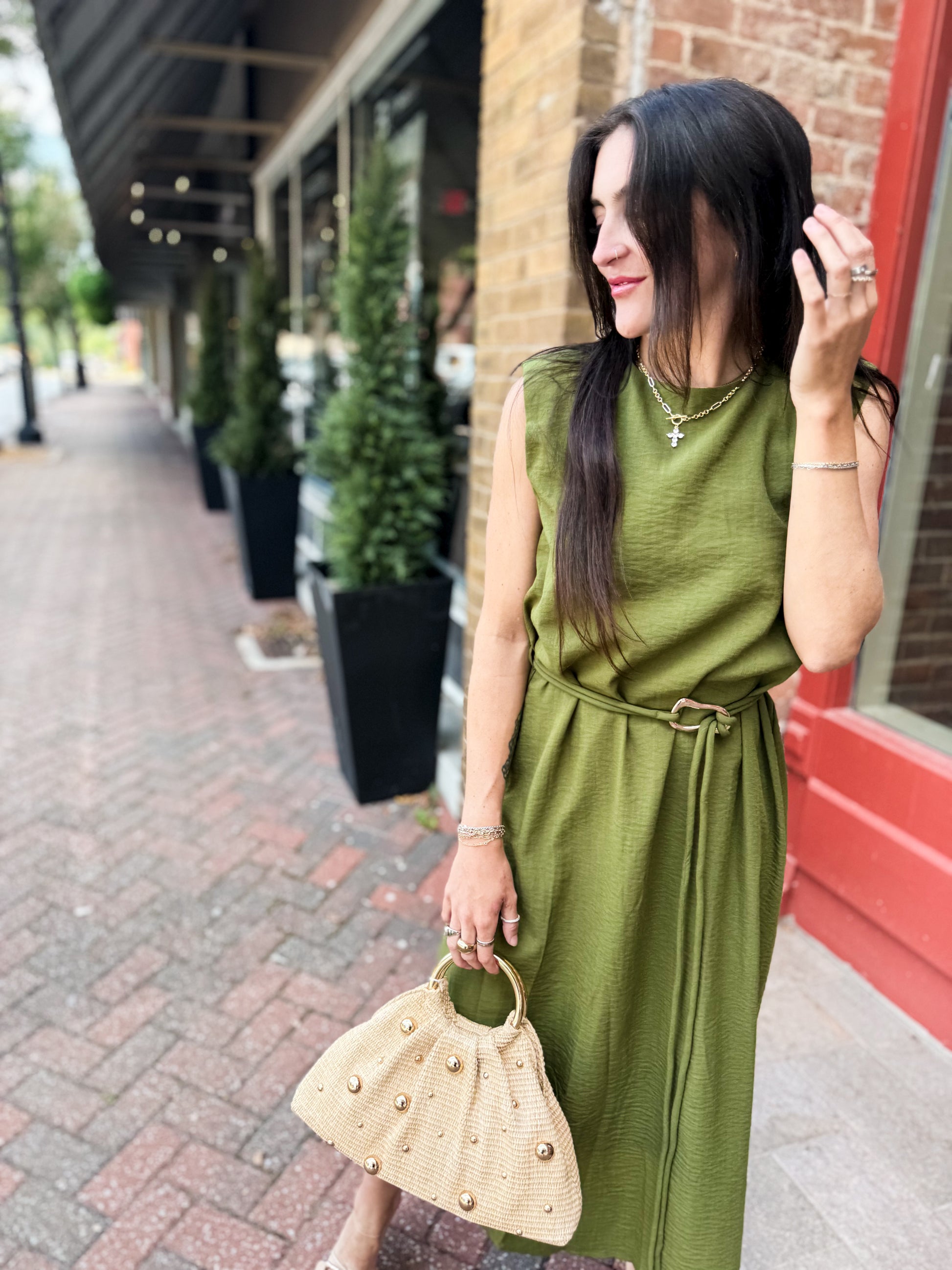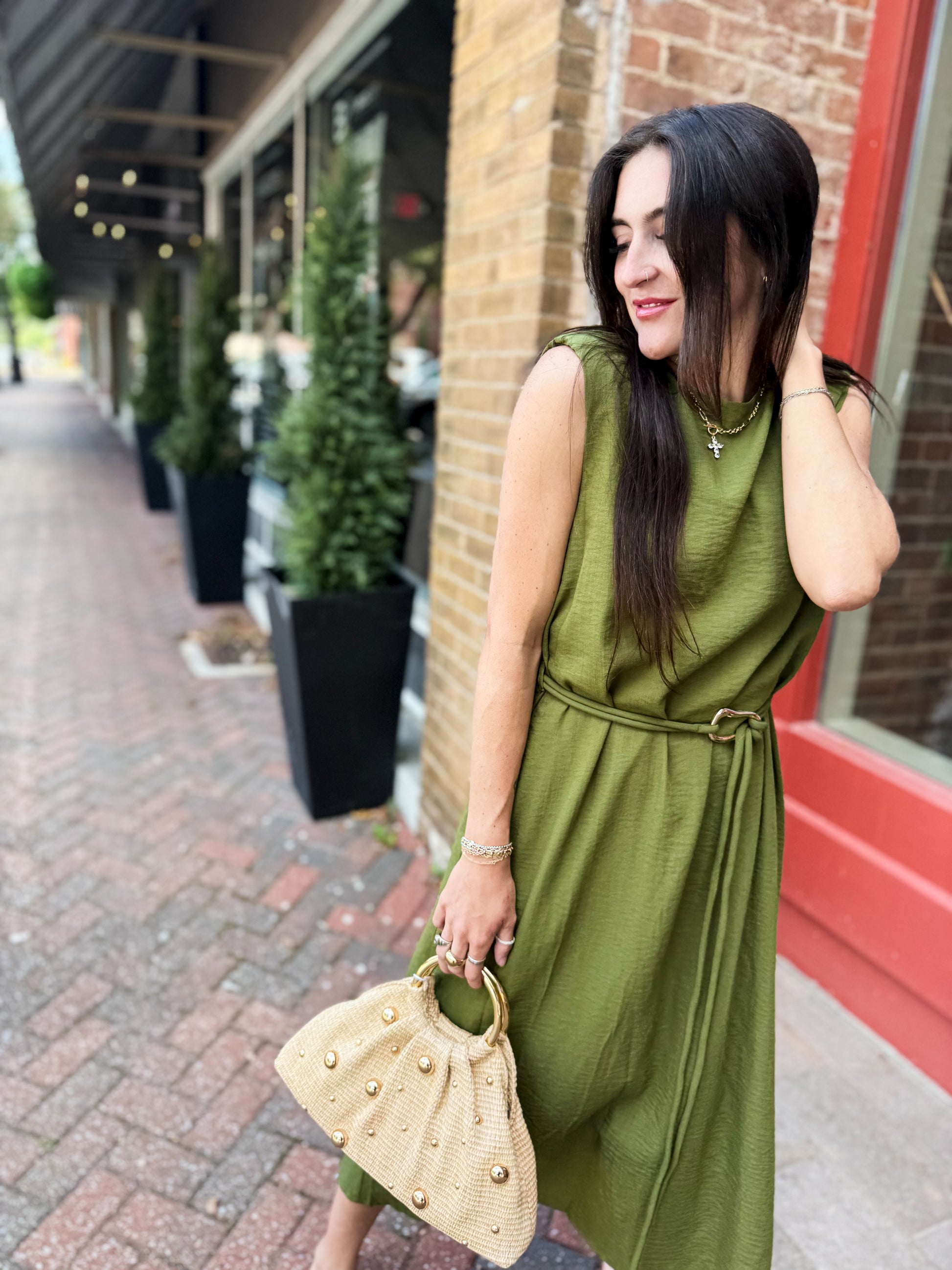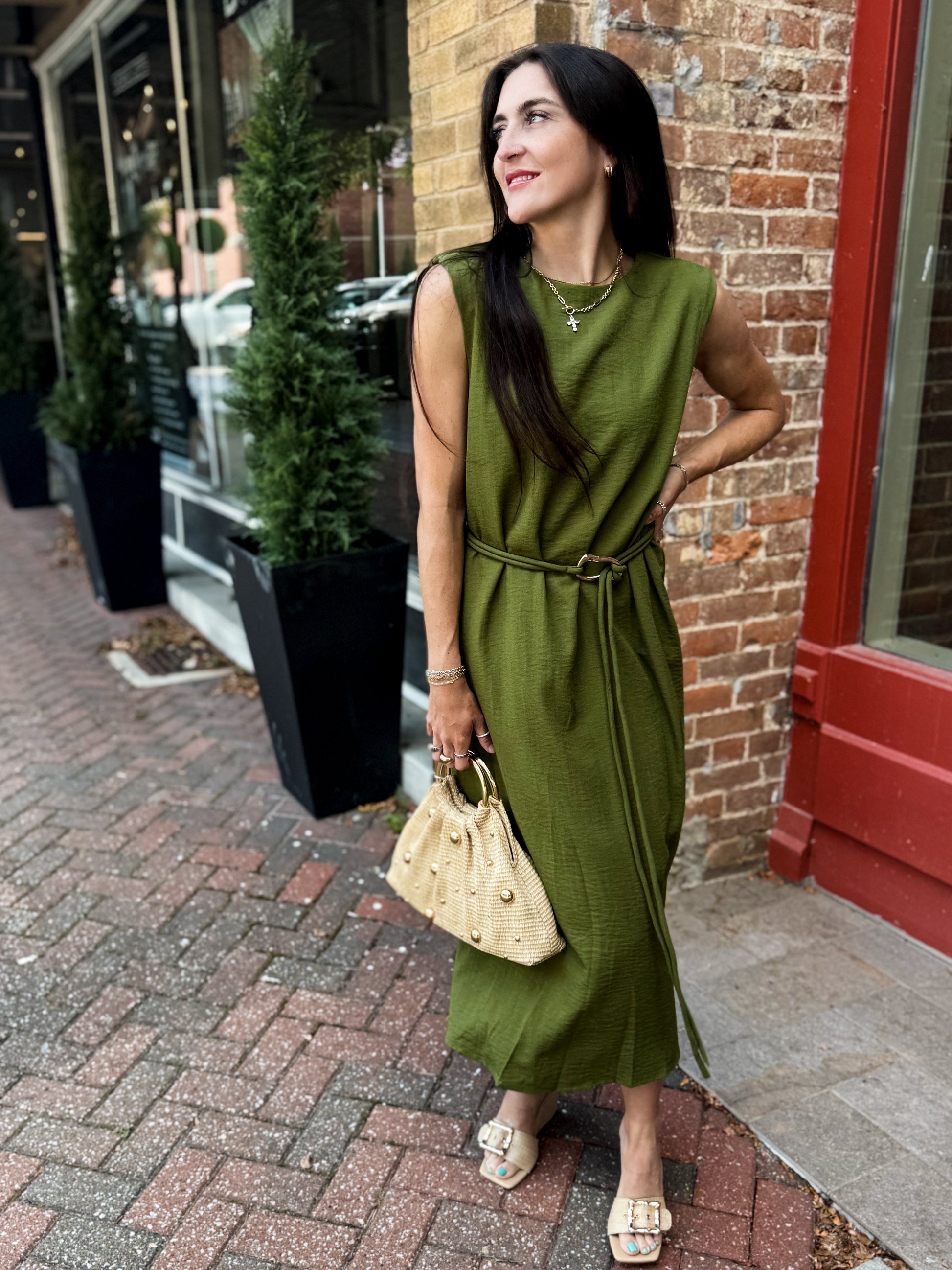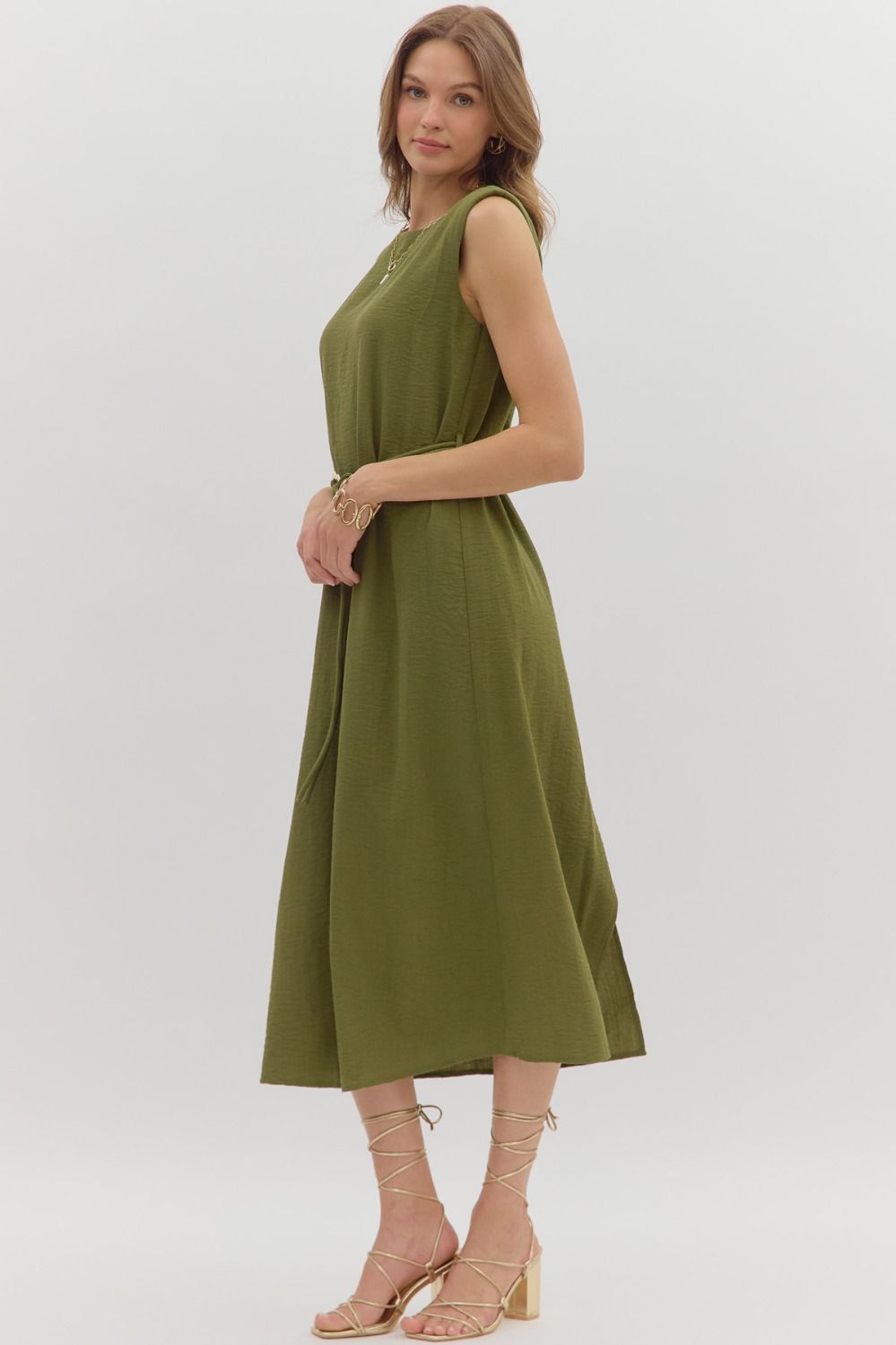 Solid muscle shoulder slit hem midi dress featuring embellished gold accent fastner belt. Single button keyhole closure at back neck. Lined. Woven