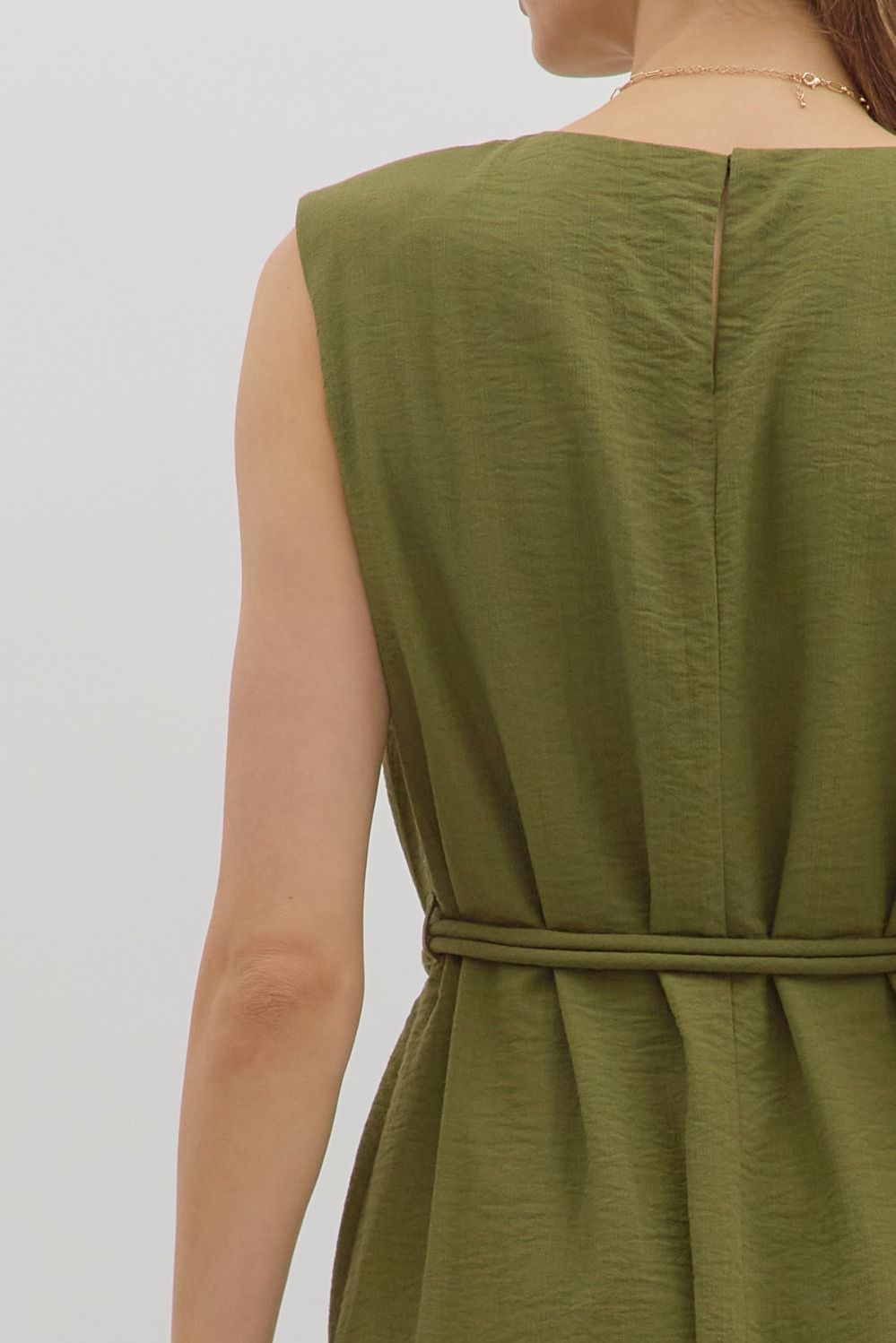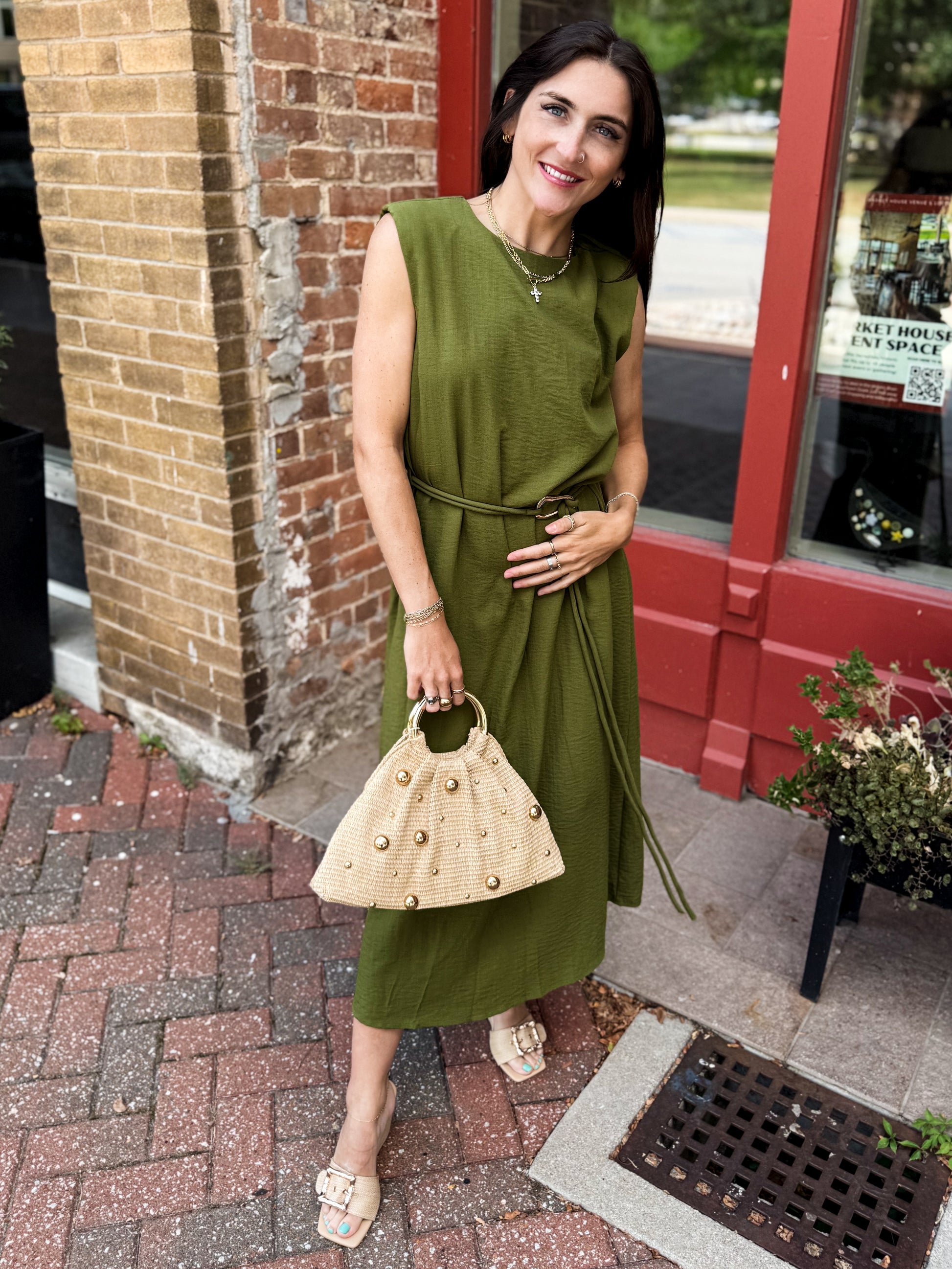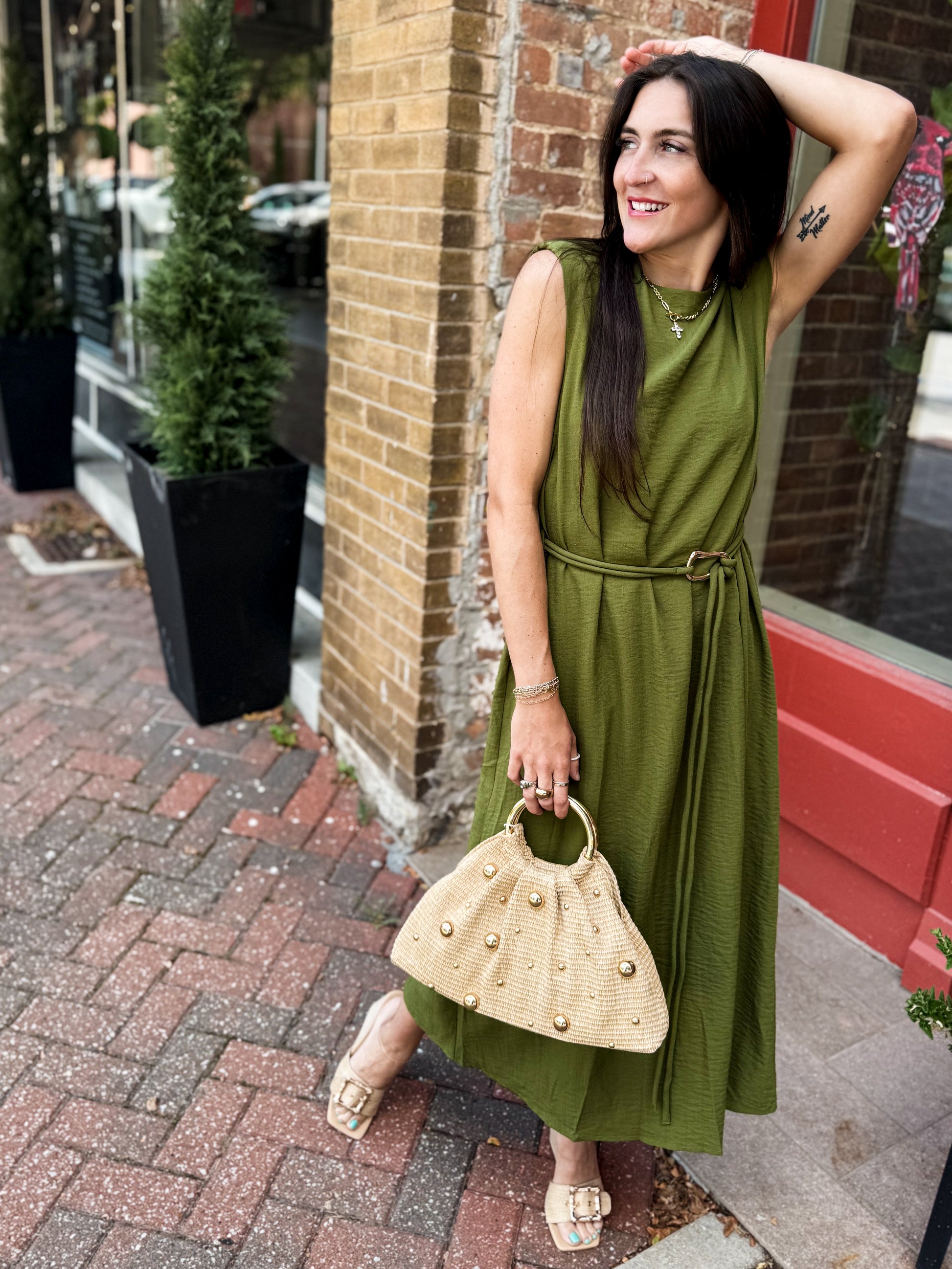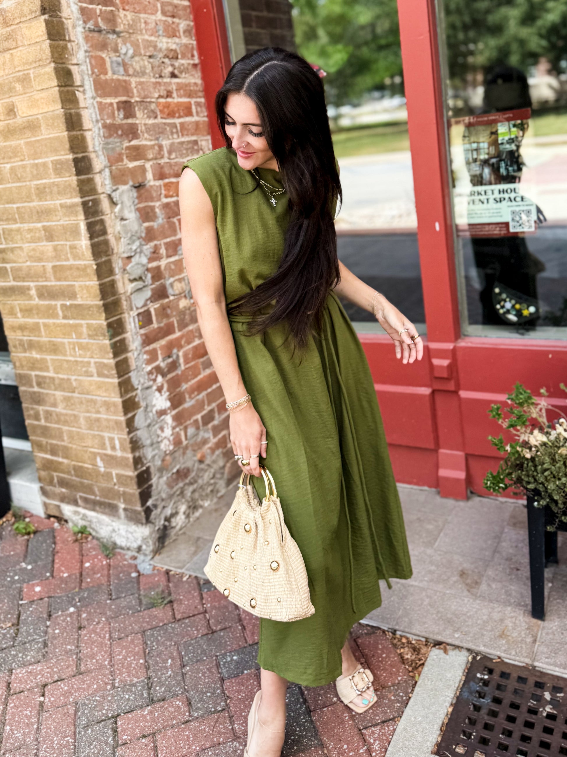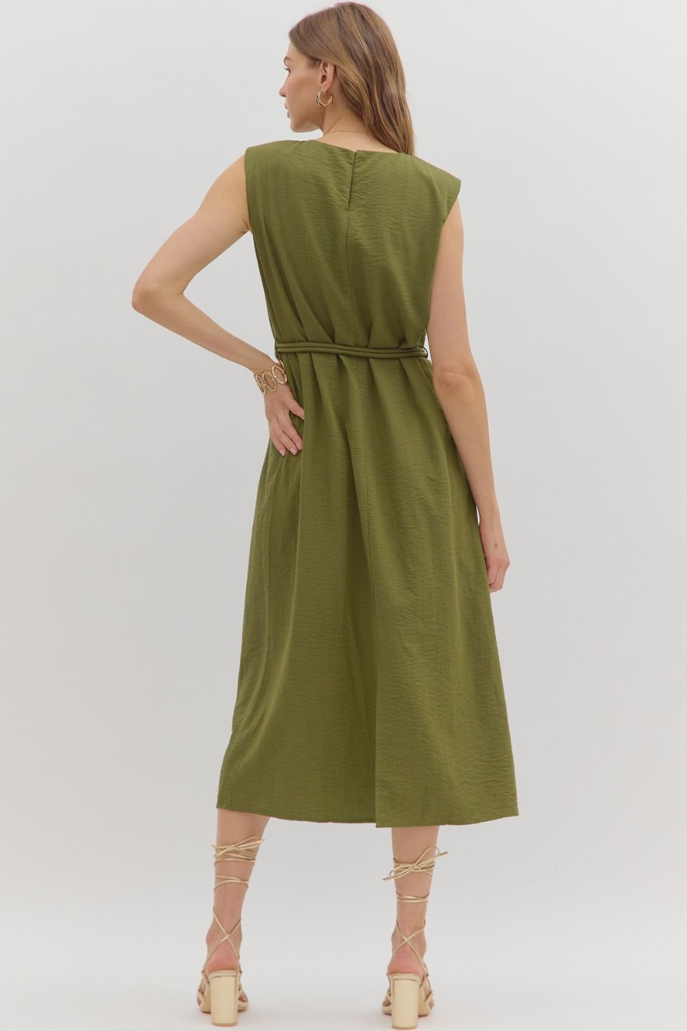 Solid muscle shoulder slit hem midi dress featuring embellished gold accent fastner belt. Single button keyhole closure at back neck. Lined. Woven