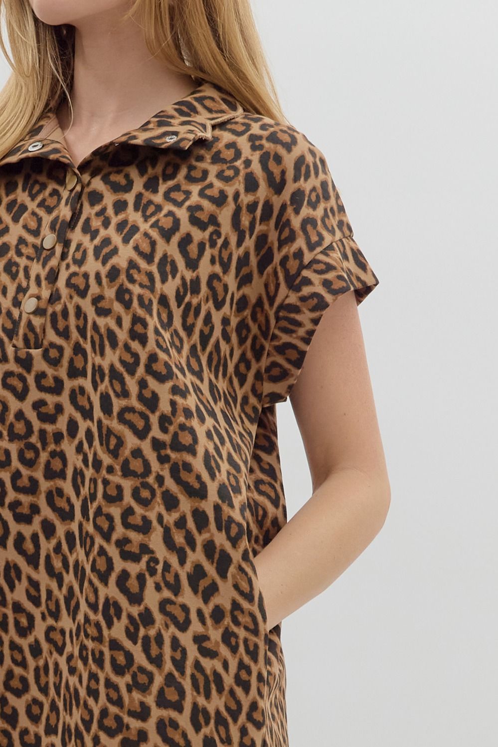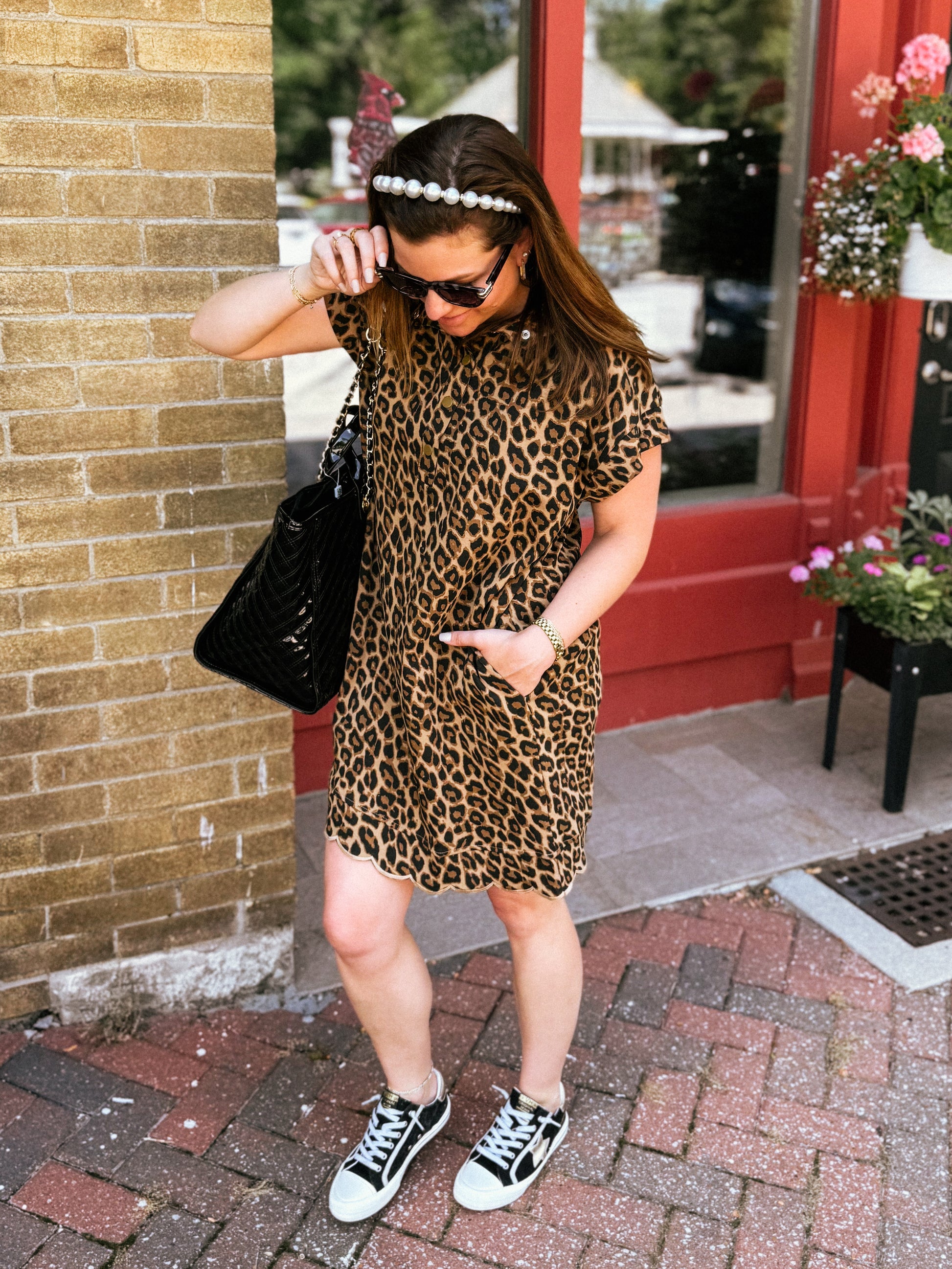 This playful mini dress combines bold leopard print with a delicate embroidered scallop hem for a fun, flirty look. The high-neck snap button closure adds a chic touch, while convenient side pockets keep essentials close. Perfect for making a statement with effortless style.