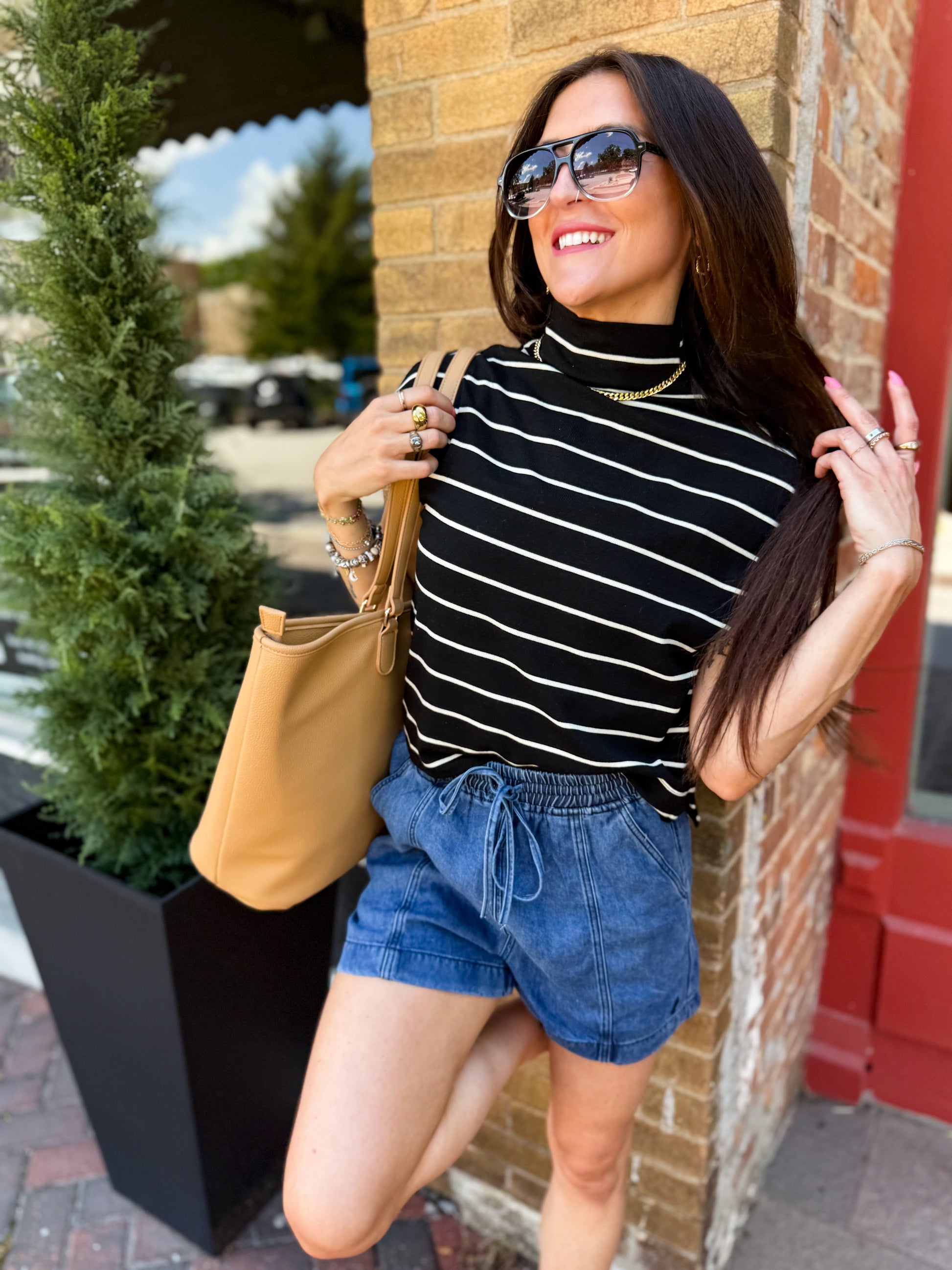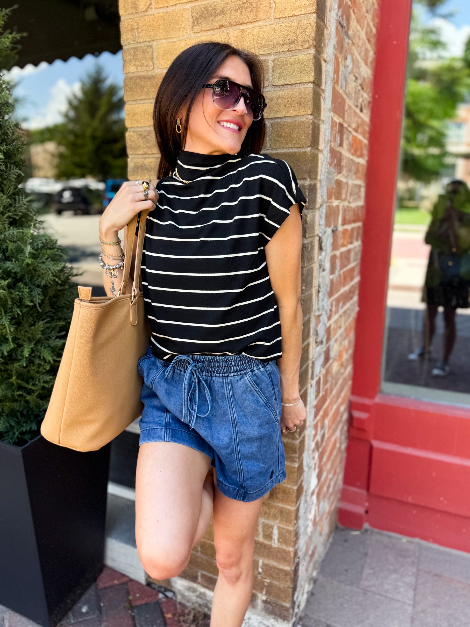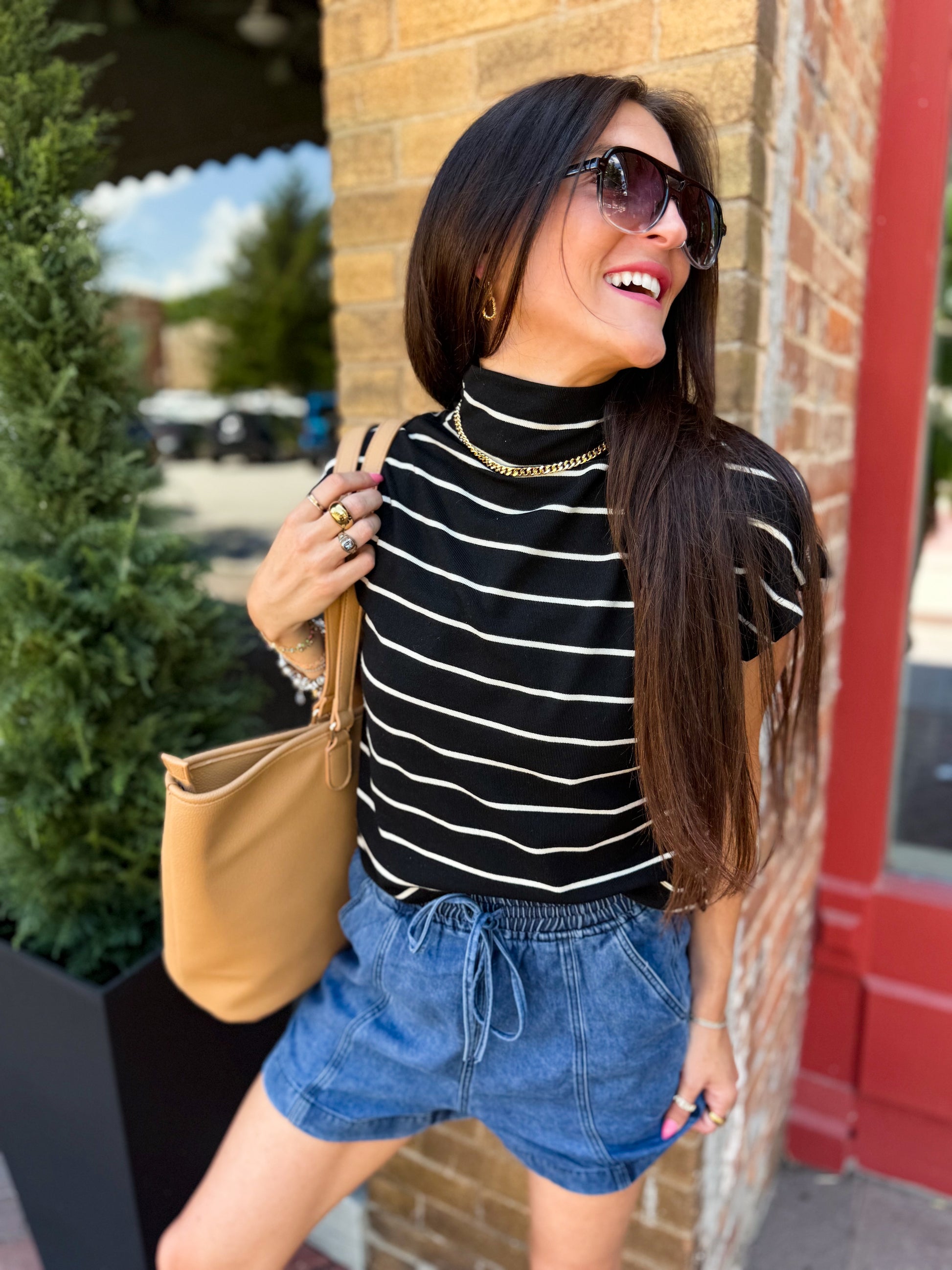Wrap yourself in cozy charm with the Stripe Mock Neck pullover. Featuring a snug mock neck and playful stripes, this knit top adds a fun twist to your outfit. Perfect for layering or wearing on its own, it keeps you comfortable and stylish all day long with effortless ease.