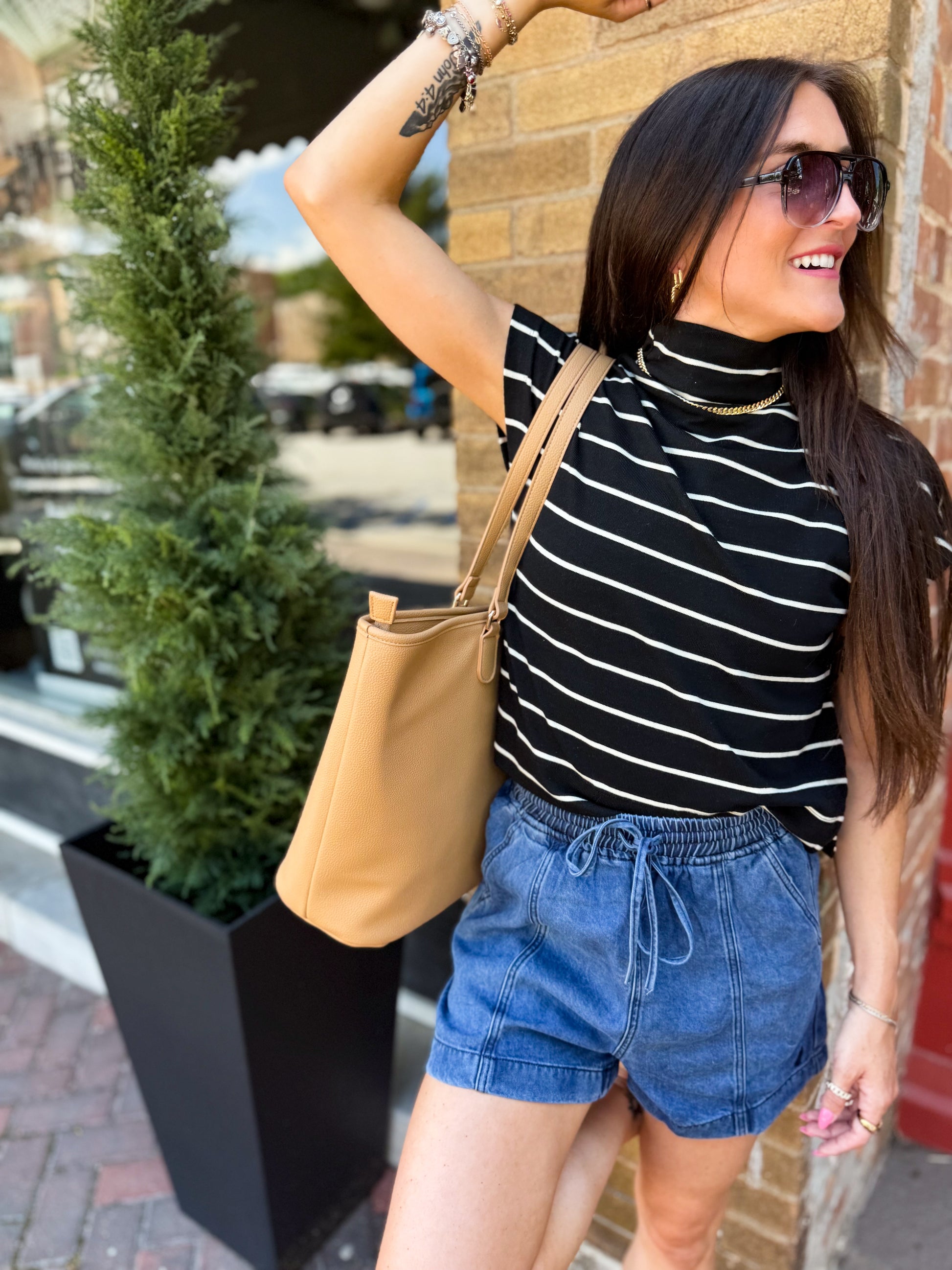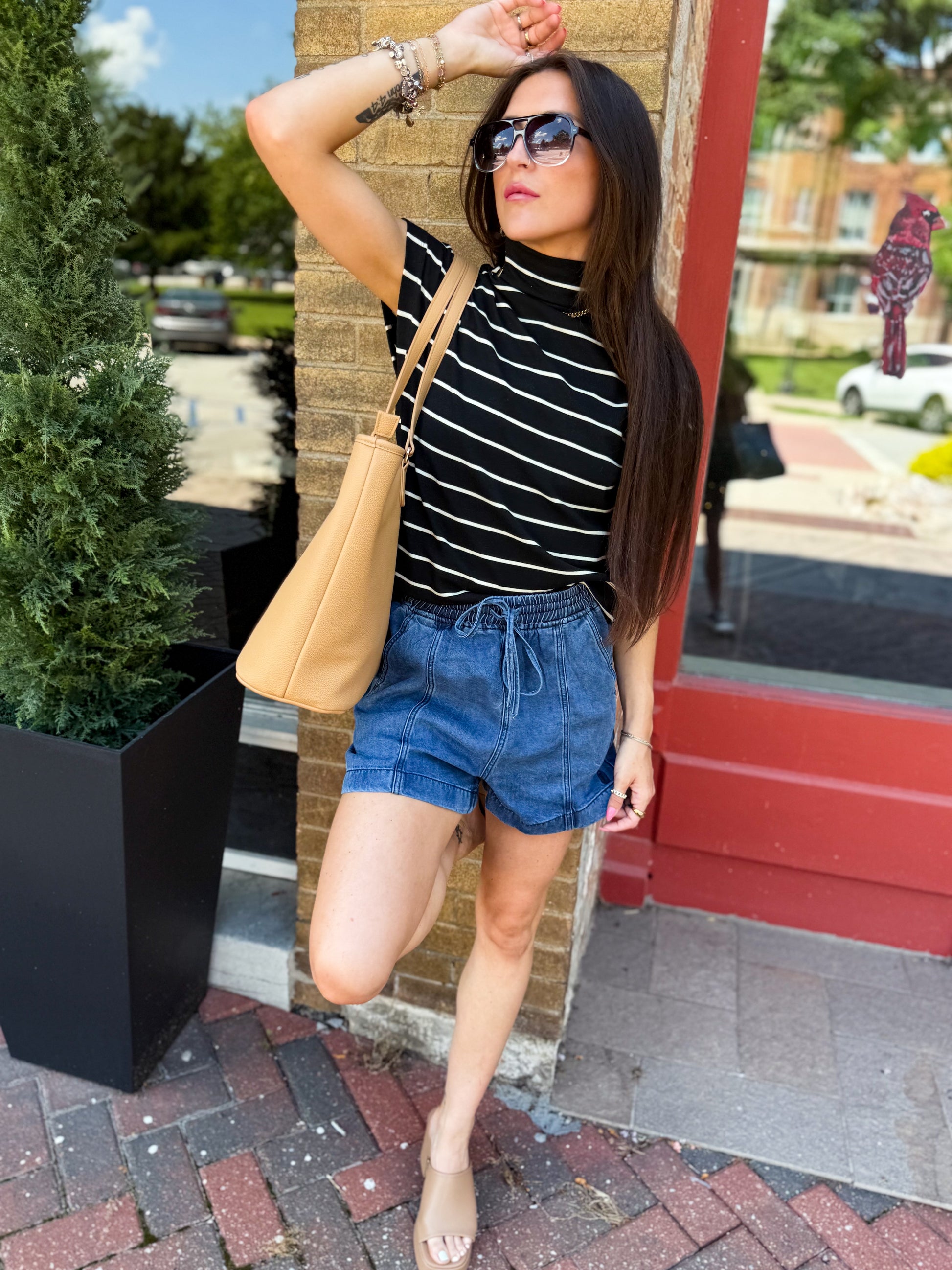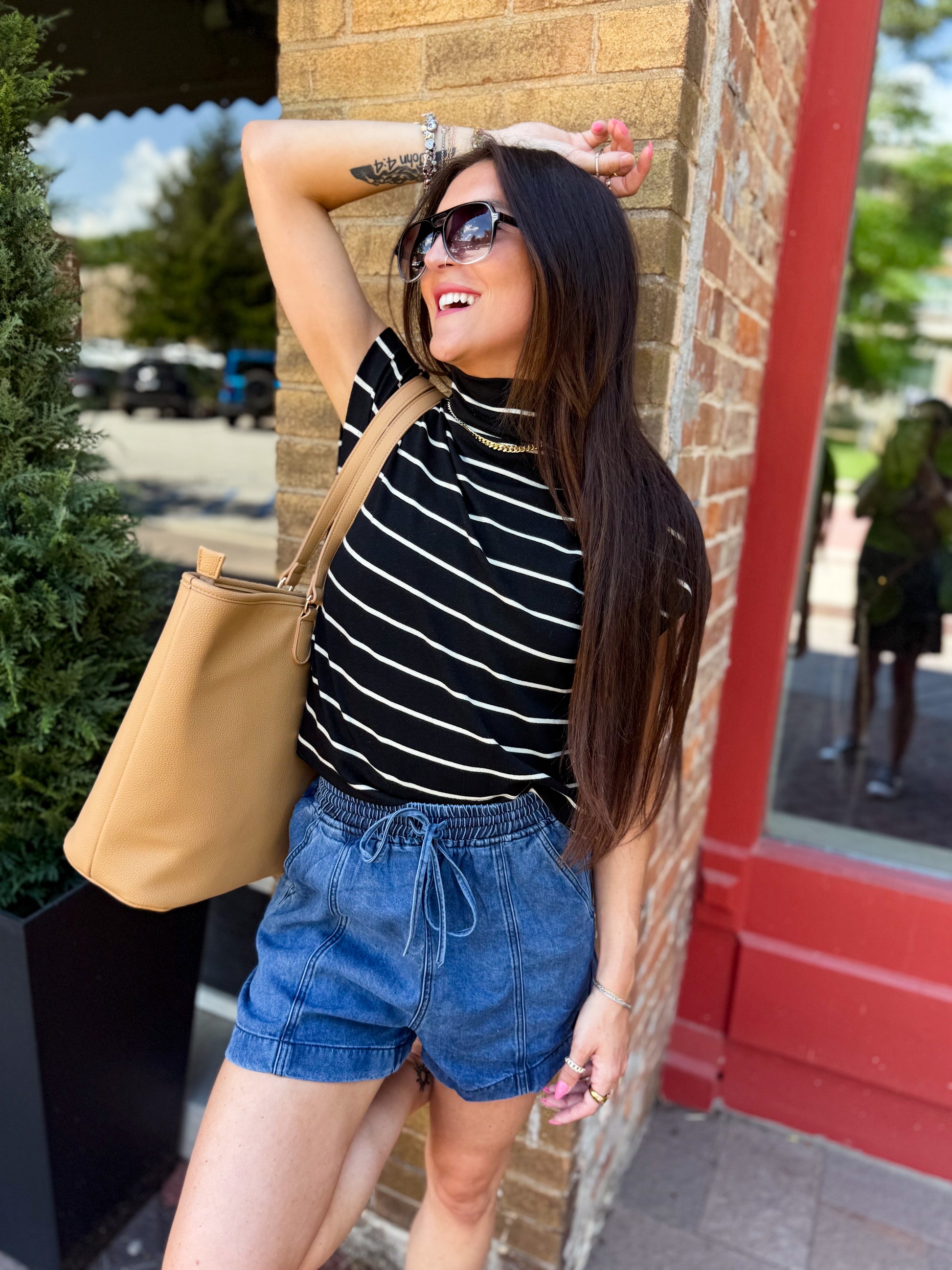 Wrap yourself in cozy charm with the Stripe Mock Neck pullover. Featuring a snug mock neck and playful stripes, this knit top adds a fun twist to your outfit. Perfect for layering or wearing on its own, it keeps you comfortable and stylish all day long with effortless ease.
