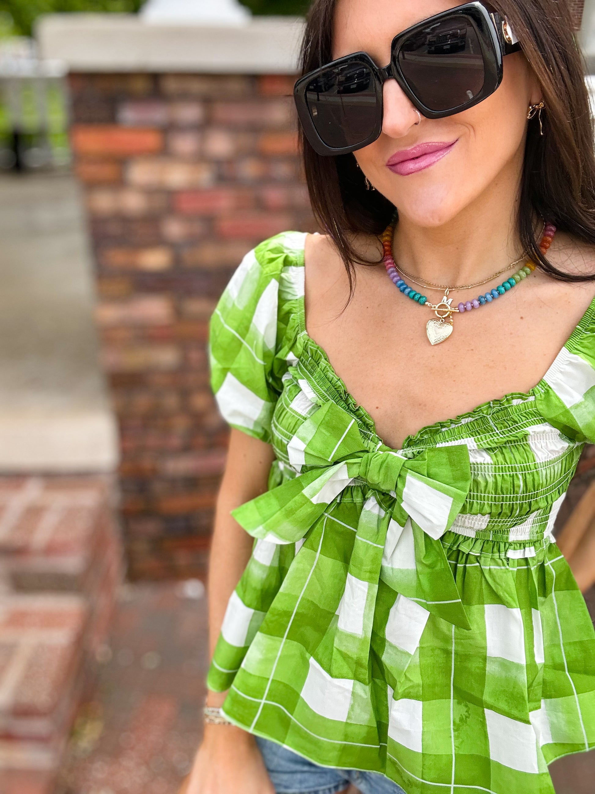 The Sugar Snap Top: a playful cotton blouse featuring a smocked bust and peplum design with a charming windowpane print. Perfect for adding a pop of fun to any outfit. (Fits true to size.)