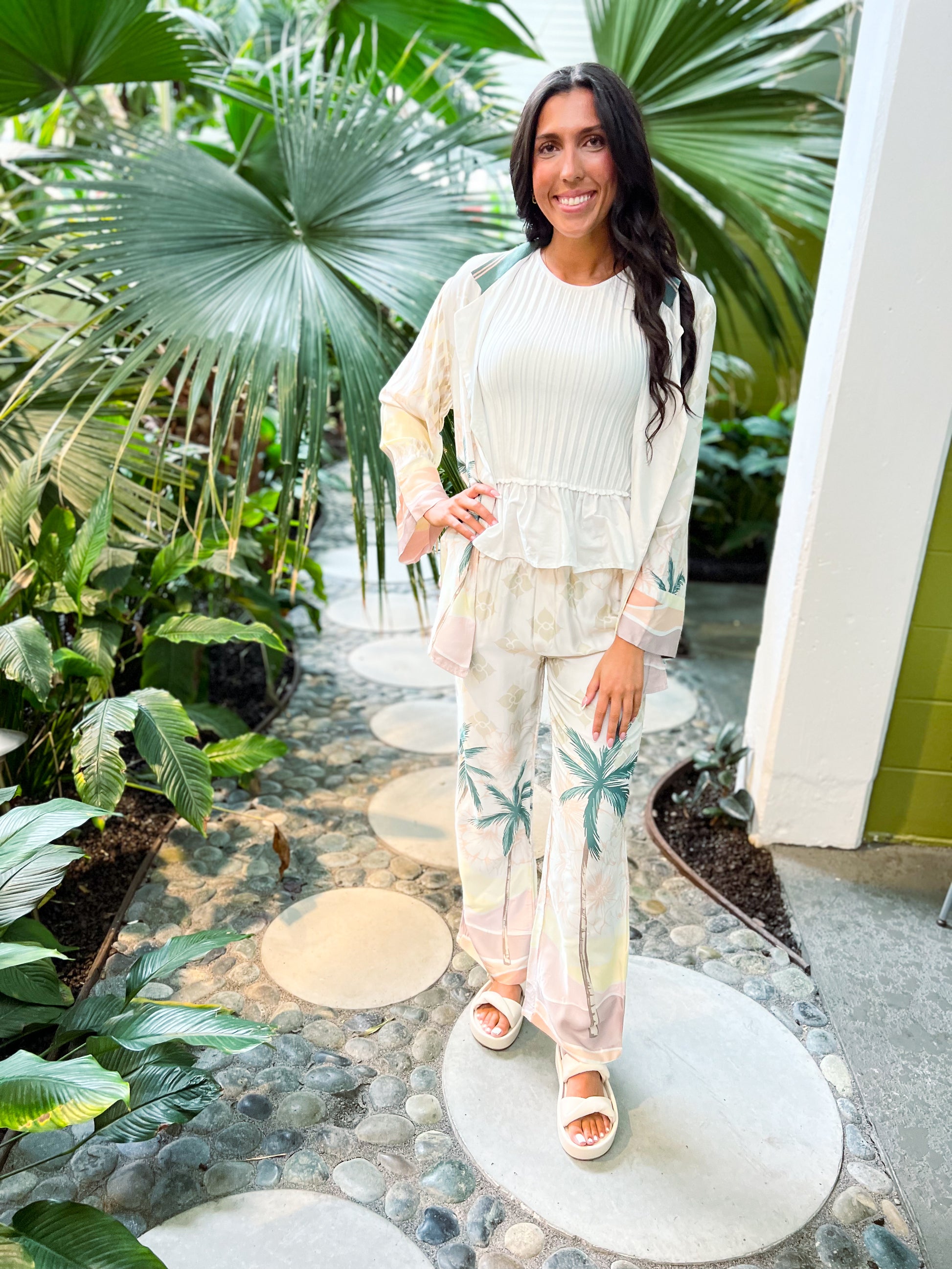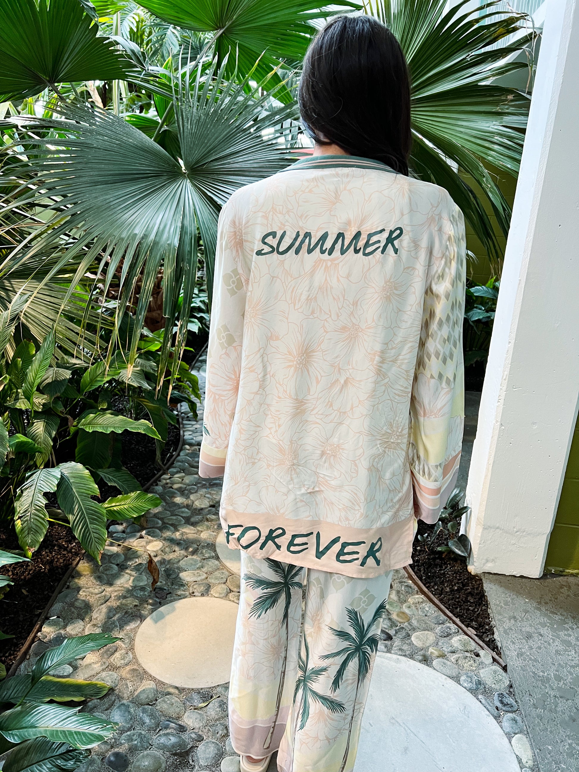 ¡Prepárate para un viaje al paraíso con nuestro blazer estampado de satén Summer Paradise! Este blazer, de corte holgado, es perfecto para la playa y presenta un gráfico divertido que dice "summer forever" en la espalda. ¡Adopta el estilo tropical con esta prenda imprescindible!