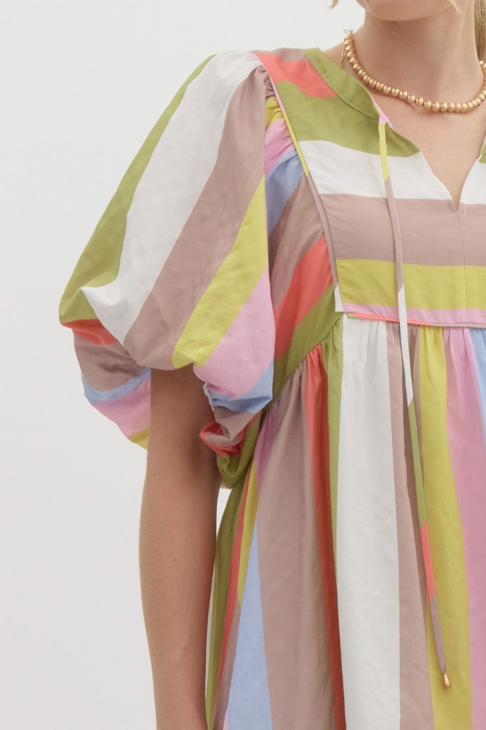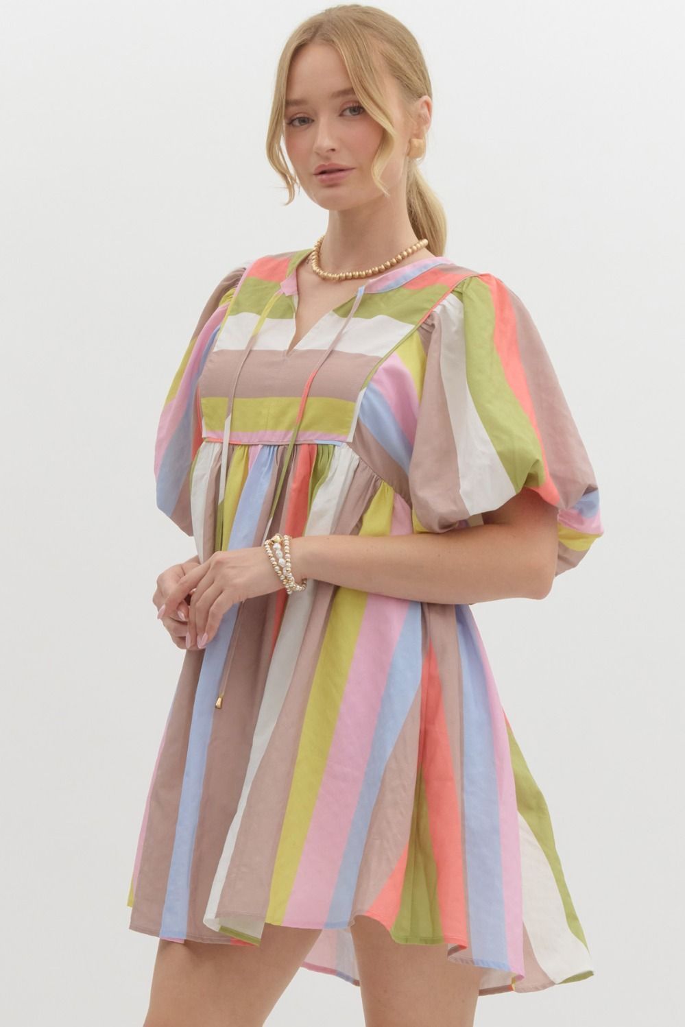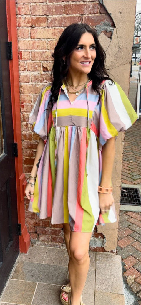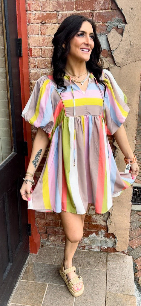 Add some playful stripes (see what we did there?) to your style with the Susie Multi Stripe Dress. This bubble sleeve babydoll dress features a self tie at the neck and convenient pockets. Plus, the puff sleeves and lining add a touch of charm.