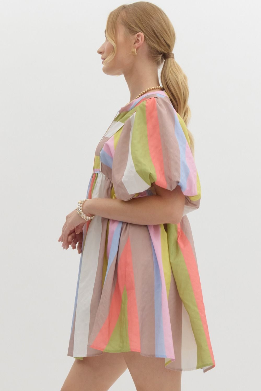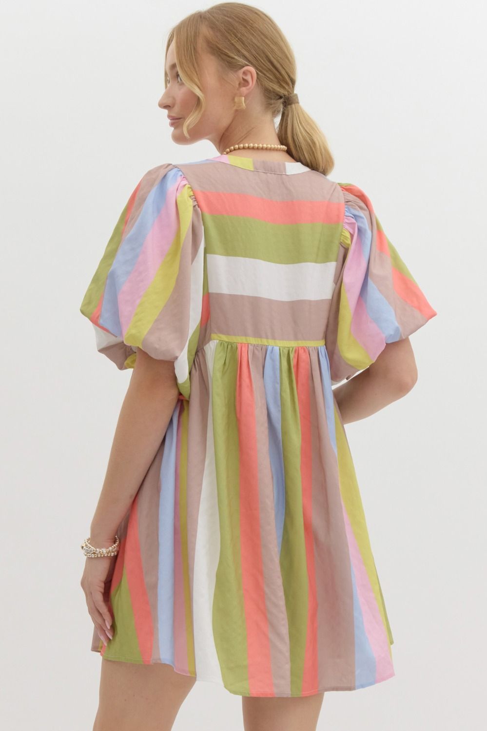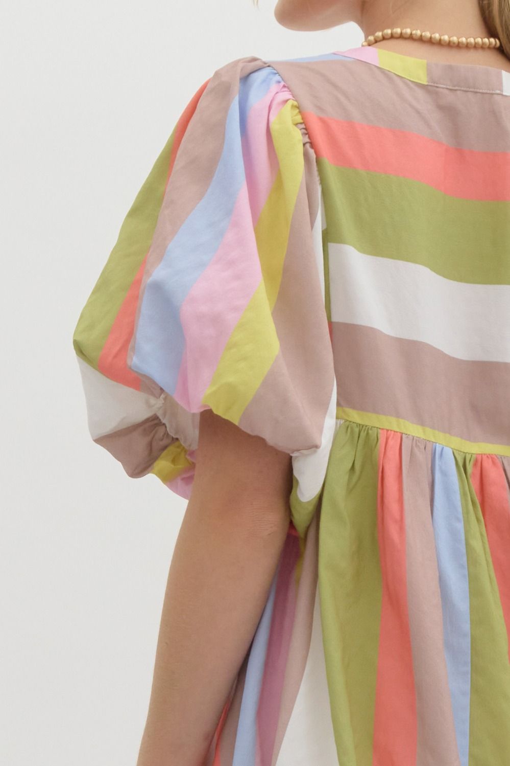 Add some playful stripes (see what we did there?) to your style with the Susie Multi Stripe Dress. This bubble sleeve babydoll dress features a self tie at the neck and convenient pockets. Plus, the puff sleeves and lining add a touch of charm.