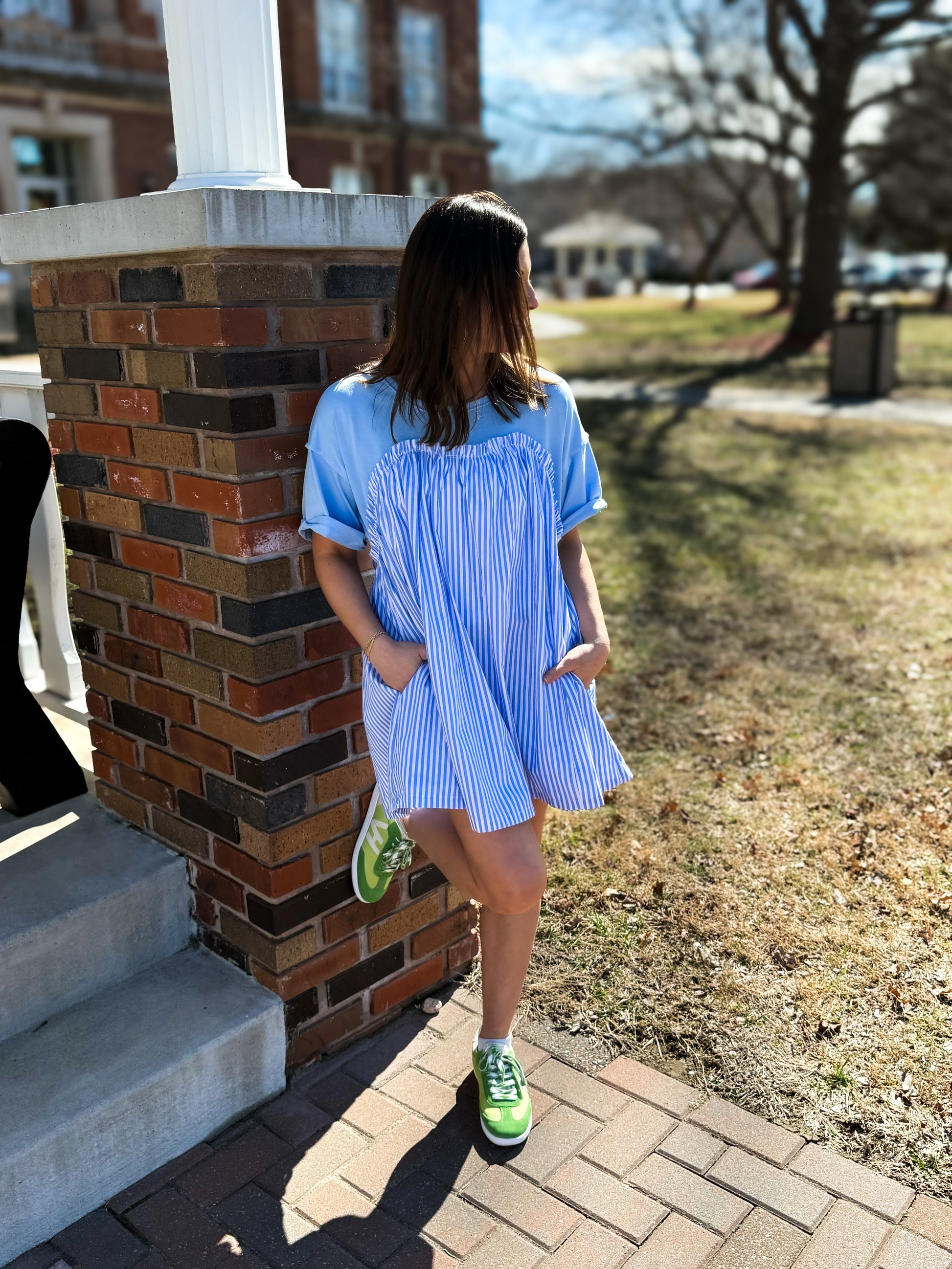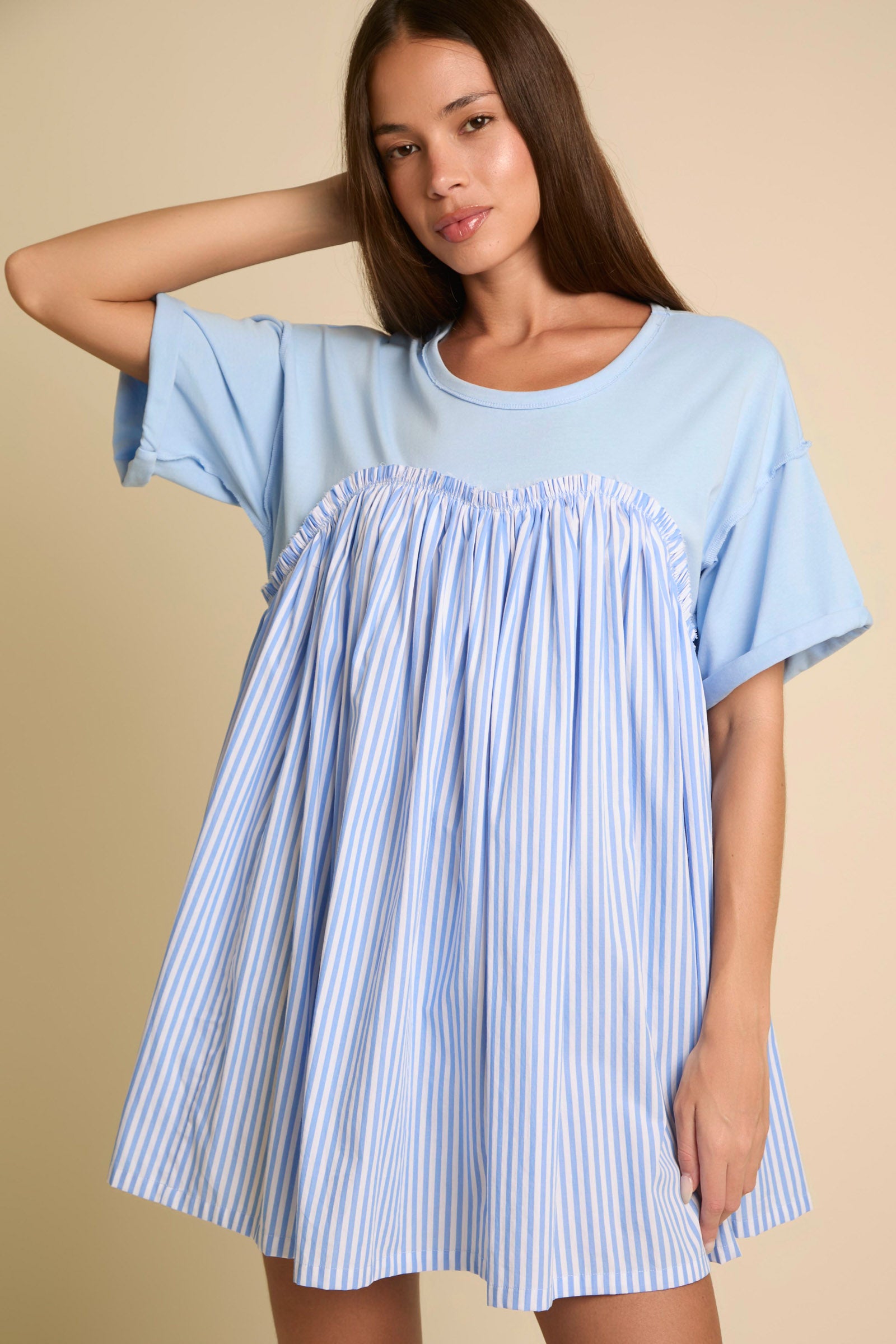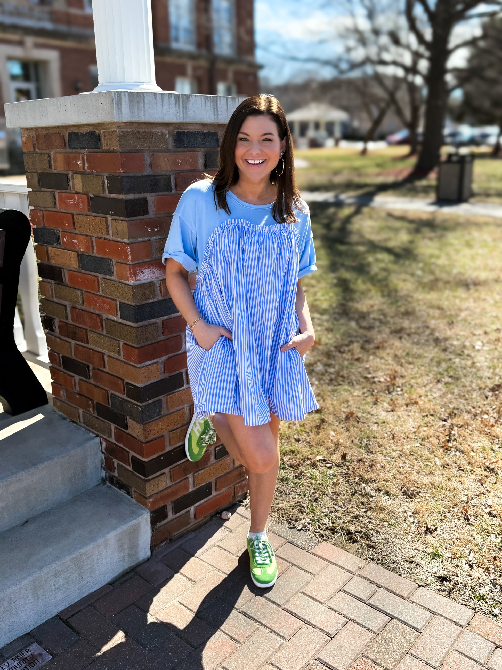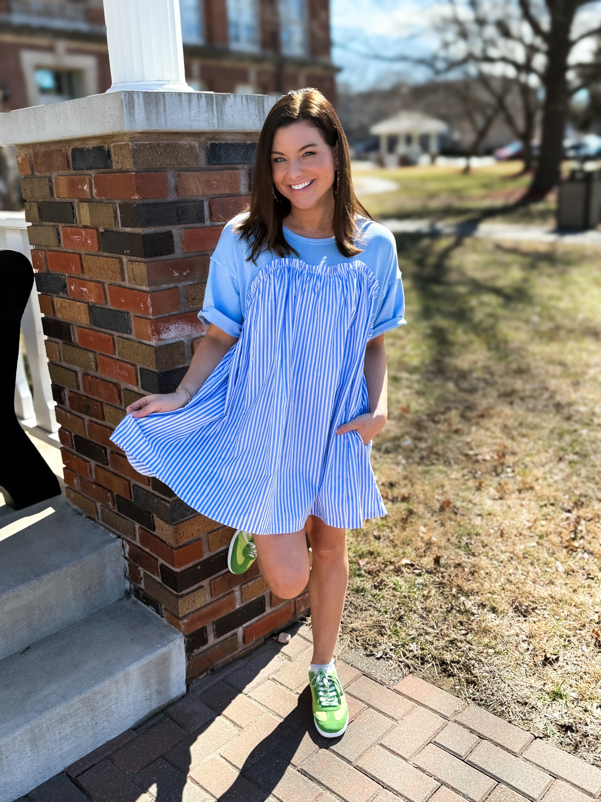 Get ready to turn heads in this Sweetheart Stripe Mini Dress. The playful stripes and baby blue color give off a fun and flirty vibe, while the short sleeves and pockets add a touch of practicality. Perfect for any occasion, this baby doll dress will make you feel sweet and stylish!