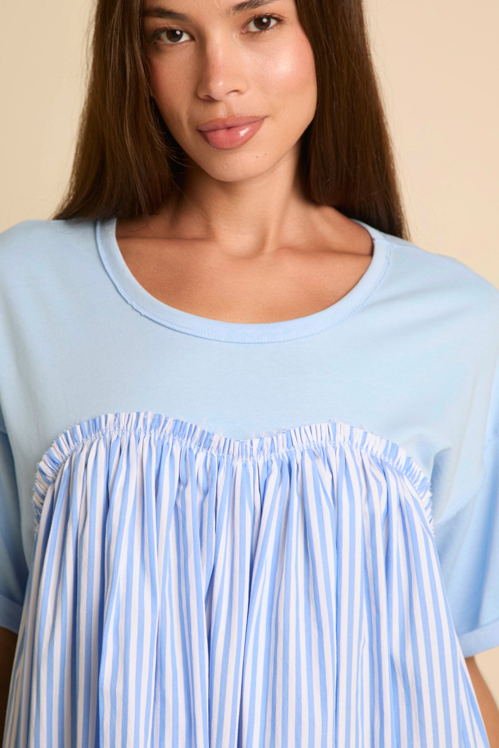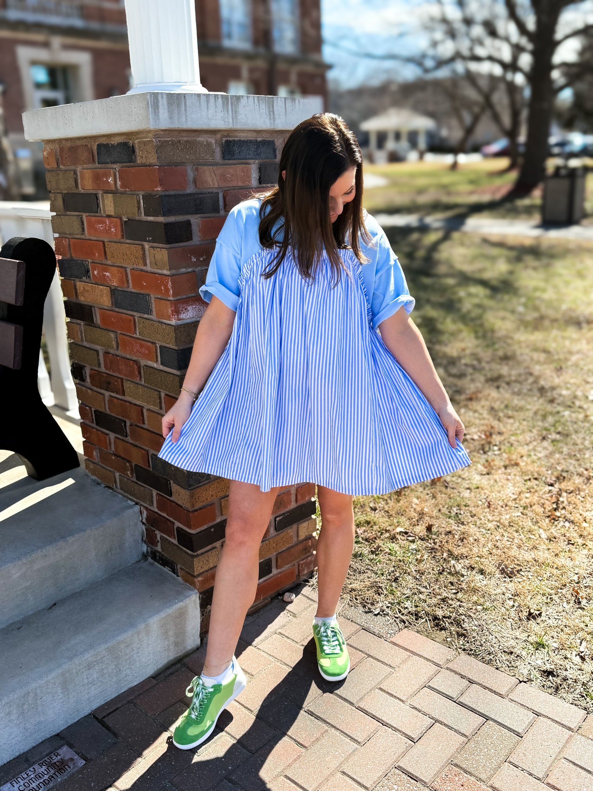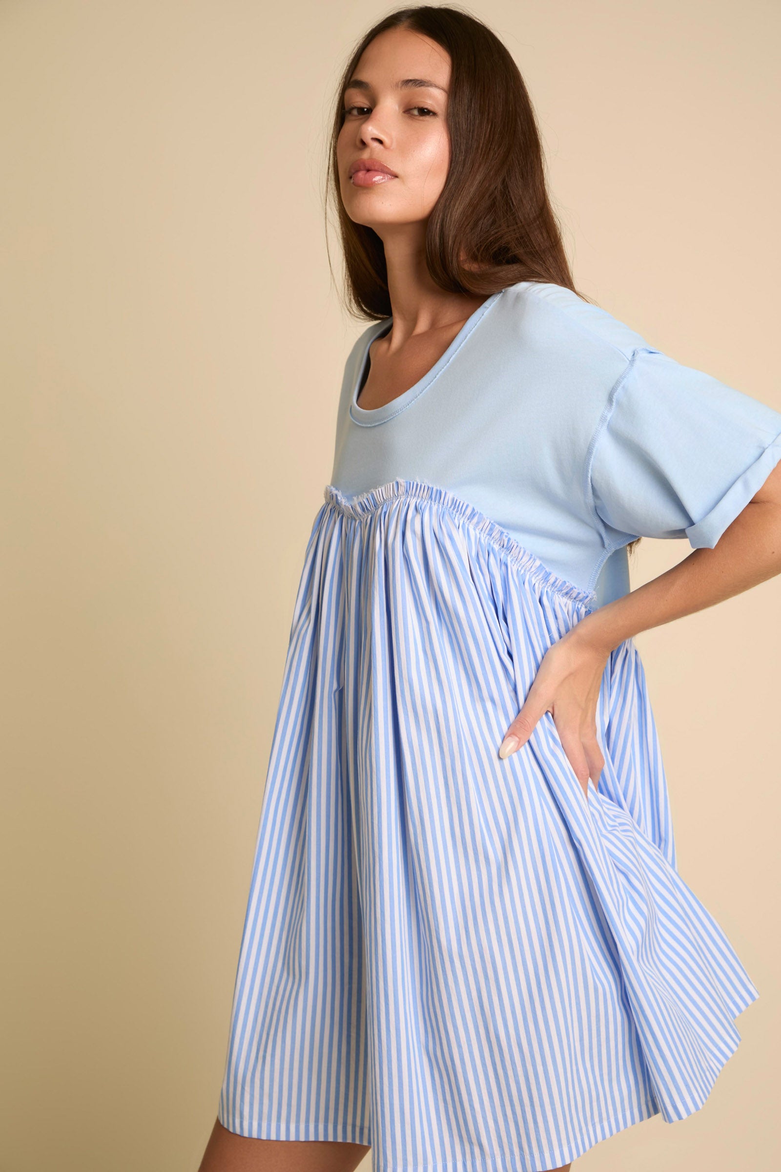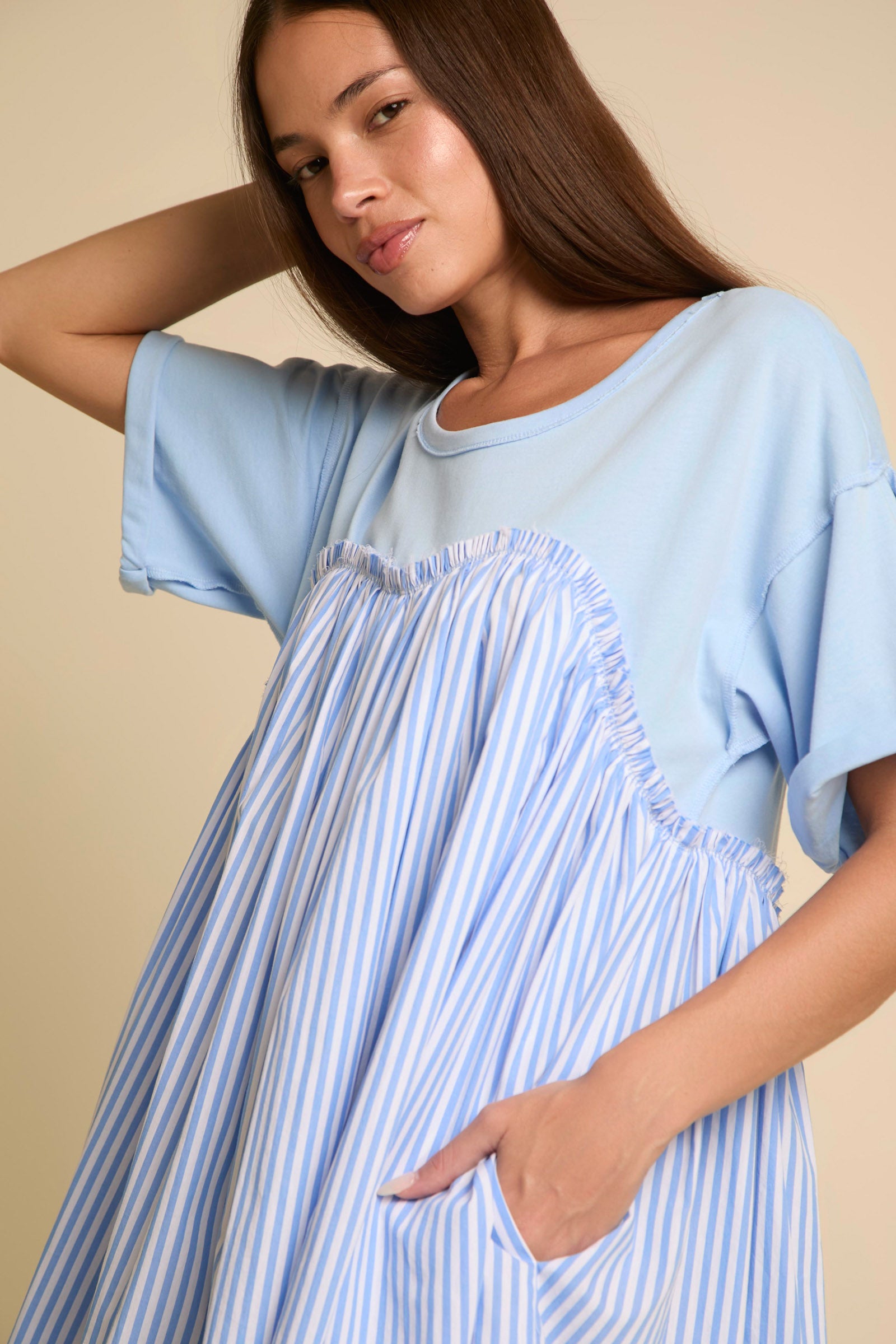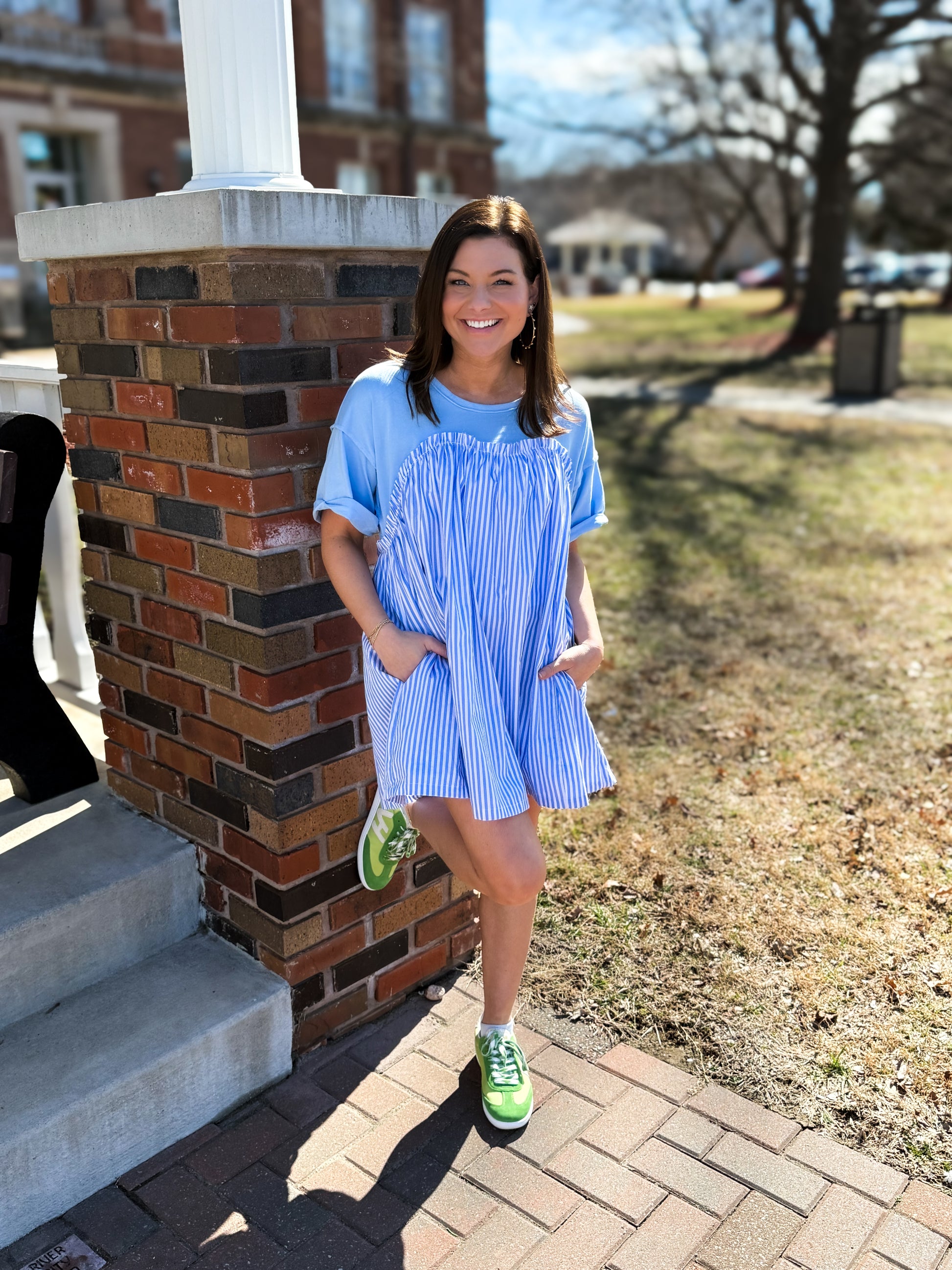 Get ready to turn heads in this Sweetheart Stripe Mini Dress. The playful stripes and baby blue color give off a fun and flirty vibe, while the short sleeves and pockets add a touch of practicality. Perfect for any occasion, this baby doll dress will make you feel sweet and stylish!