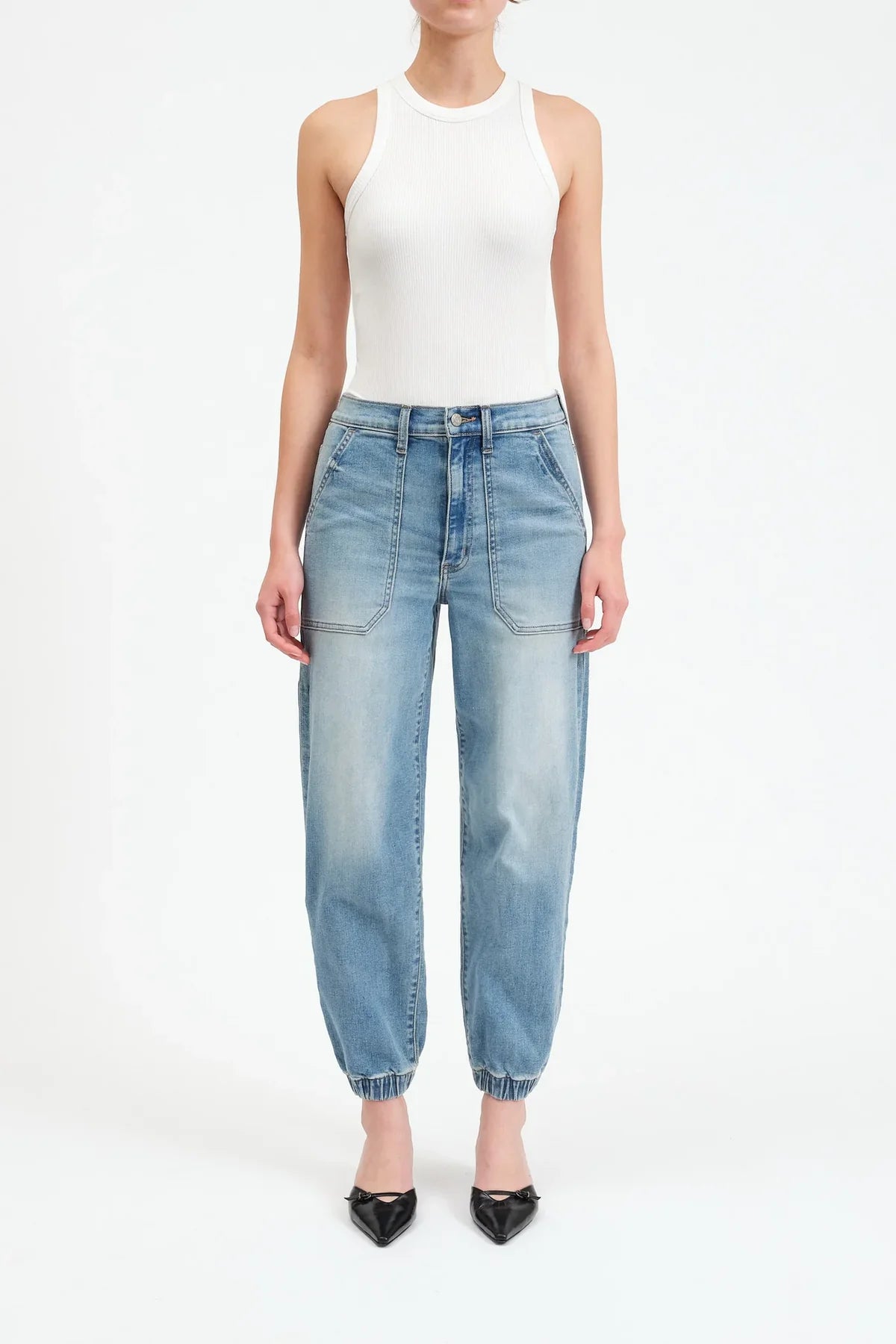 The Champ in Wings is a high rise denim jogger featuring utility-inspired pockets and a tapered, cinched ankle.
